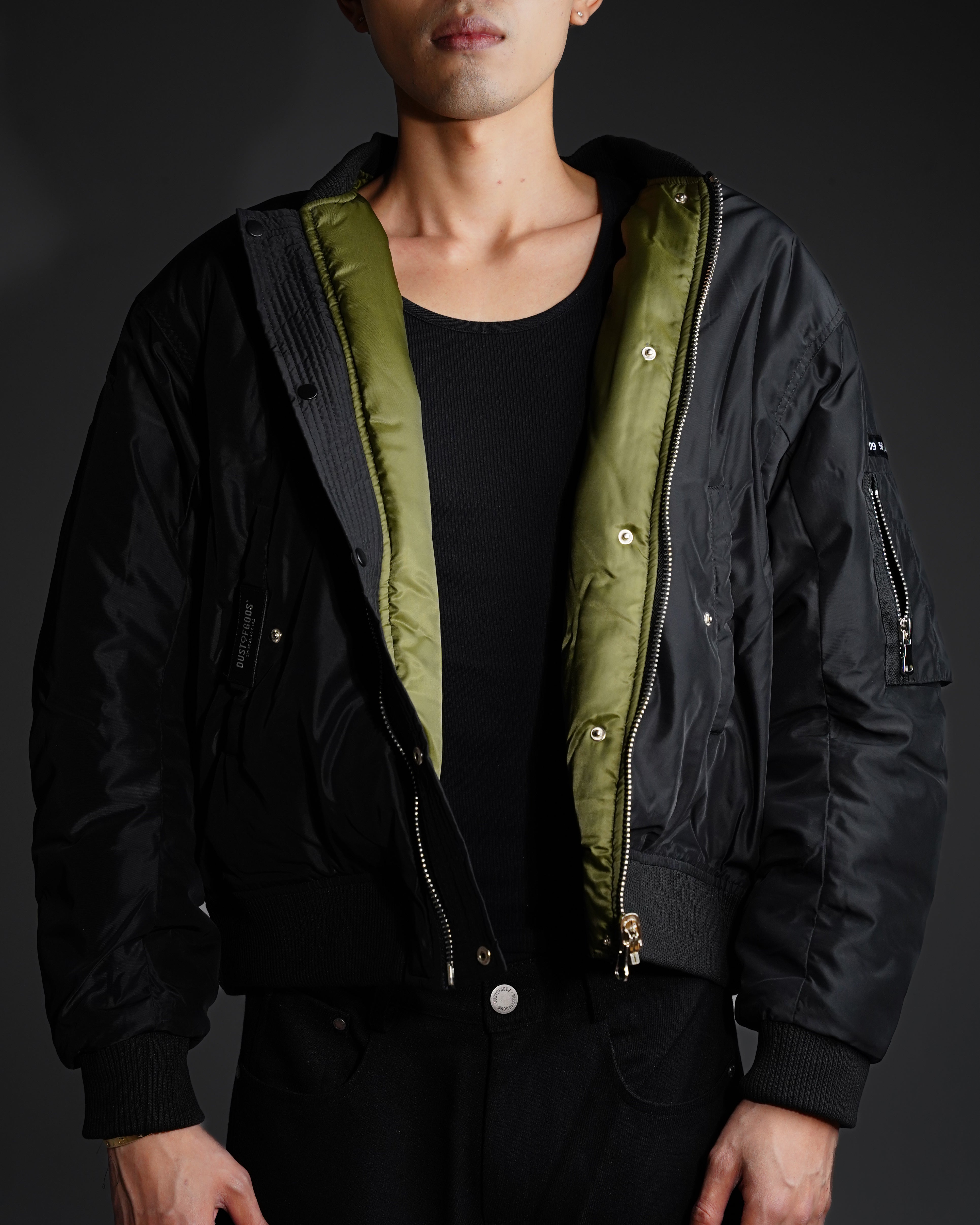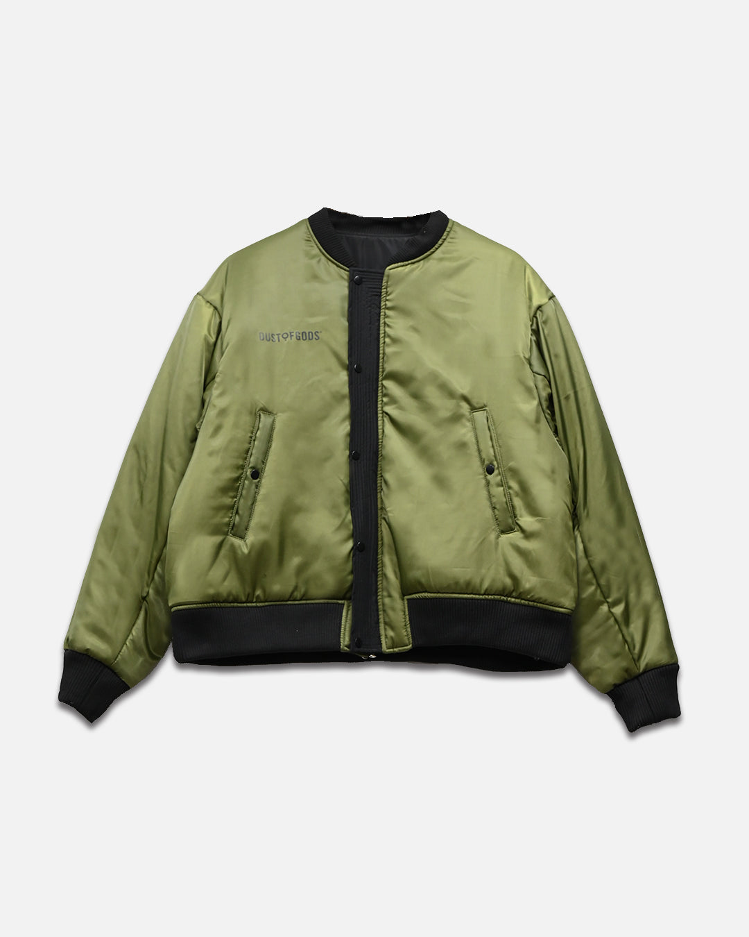 This Bomber Jacket is an oversized reversible jacket in available red, green and white interior. Featuring a sleeve pocket detail, inner and outer pockets and a Dust of Gods embellishment. This piece can be customized to tell your own story.