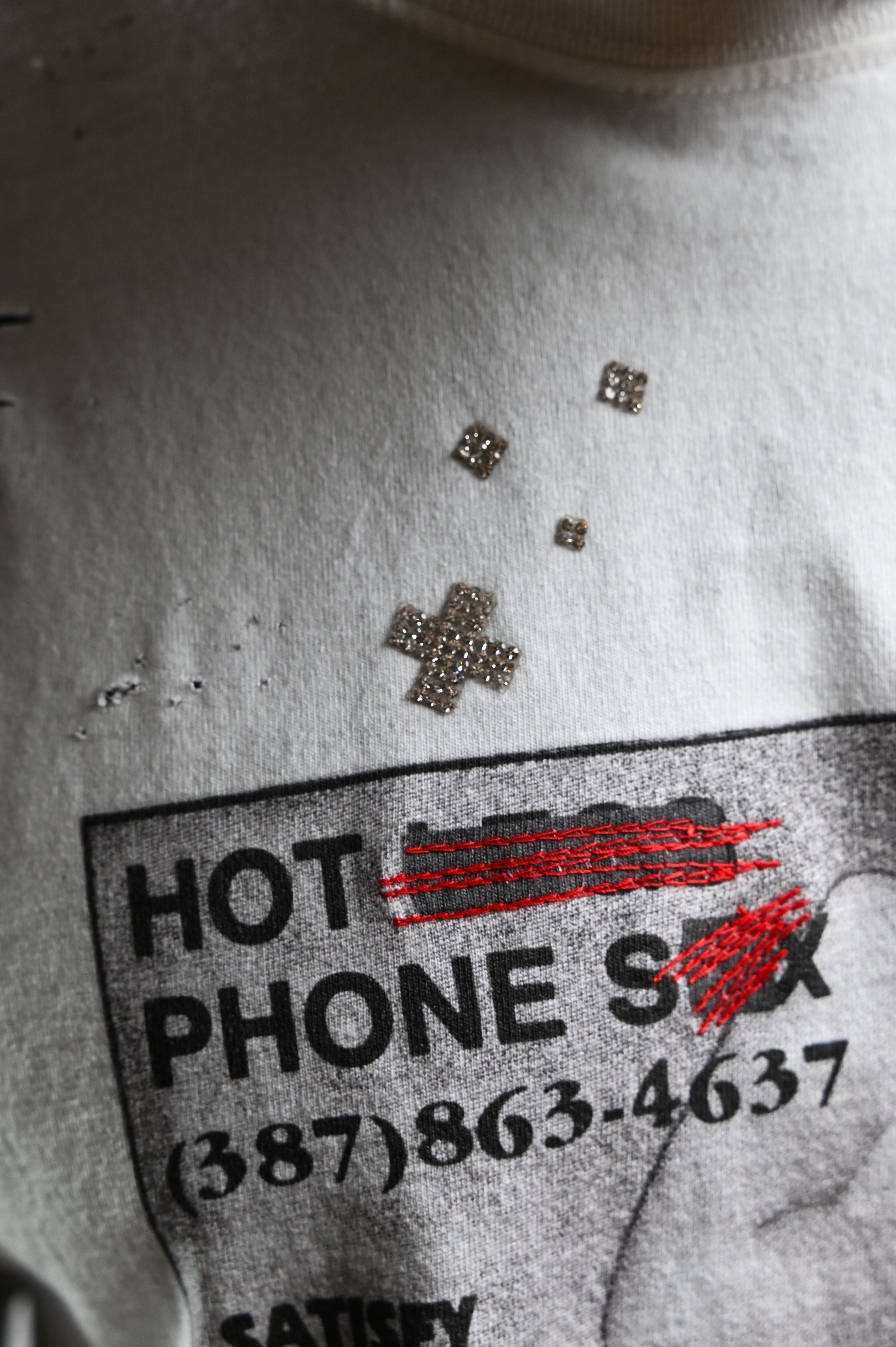 Cropped and distressed finished with machine embroidery. Rhinestone crosses censor the surface. Every imperfection, from frays to abrasions, is intentional, giving the tee a worn-in, original feel.