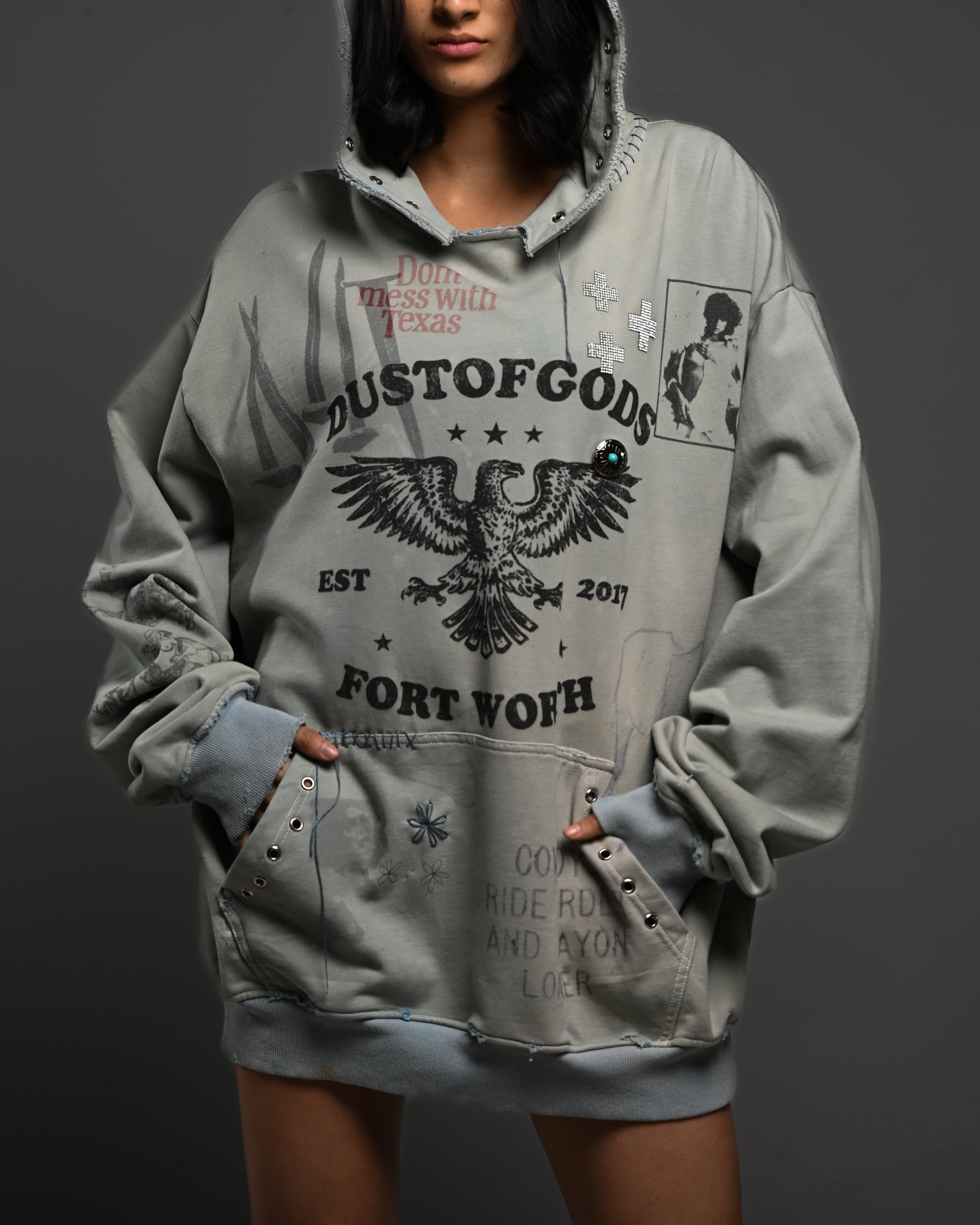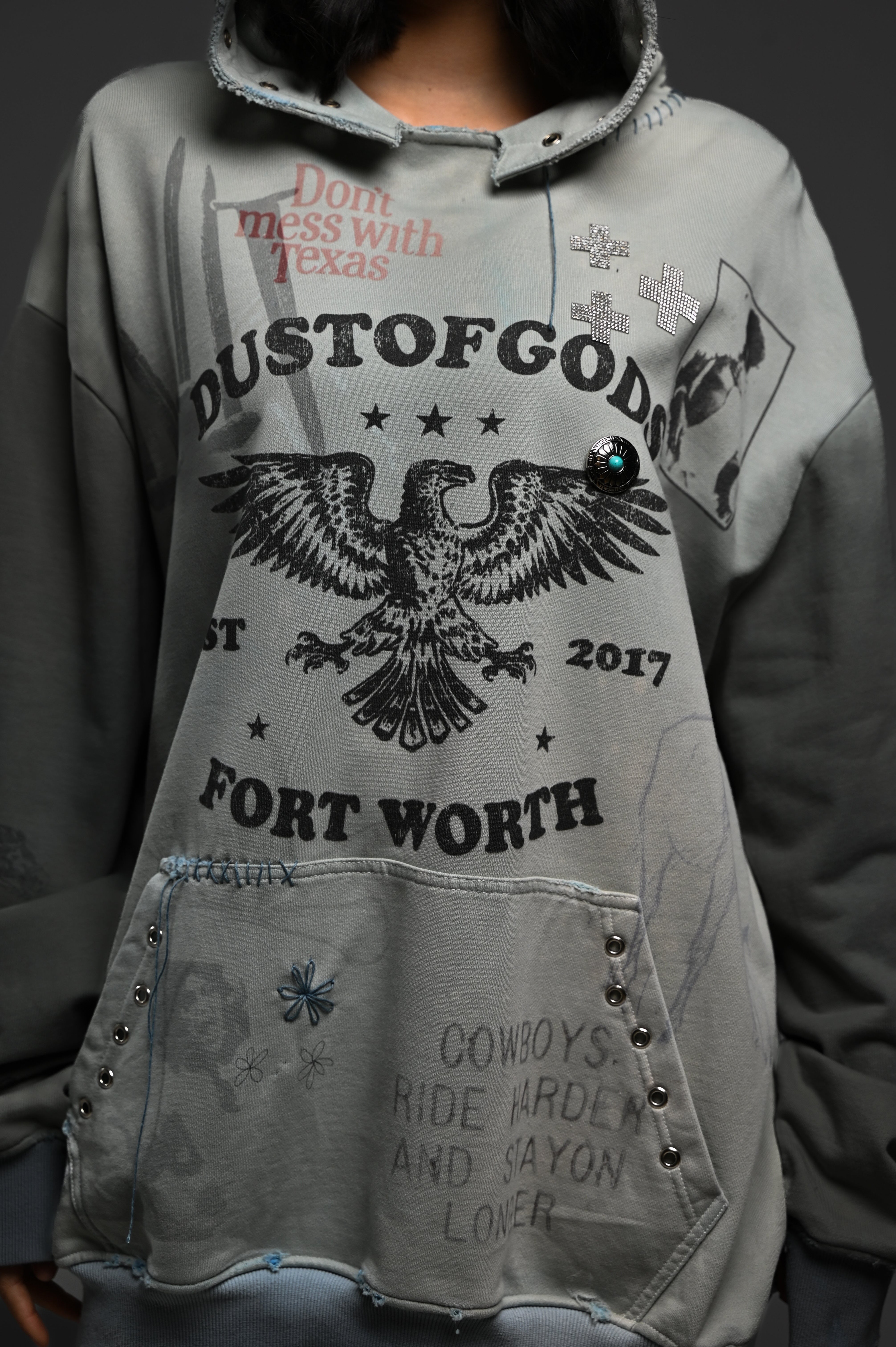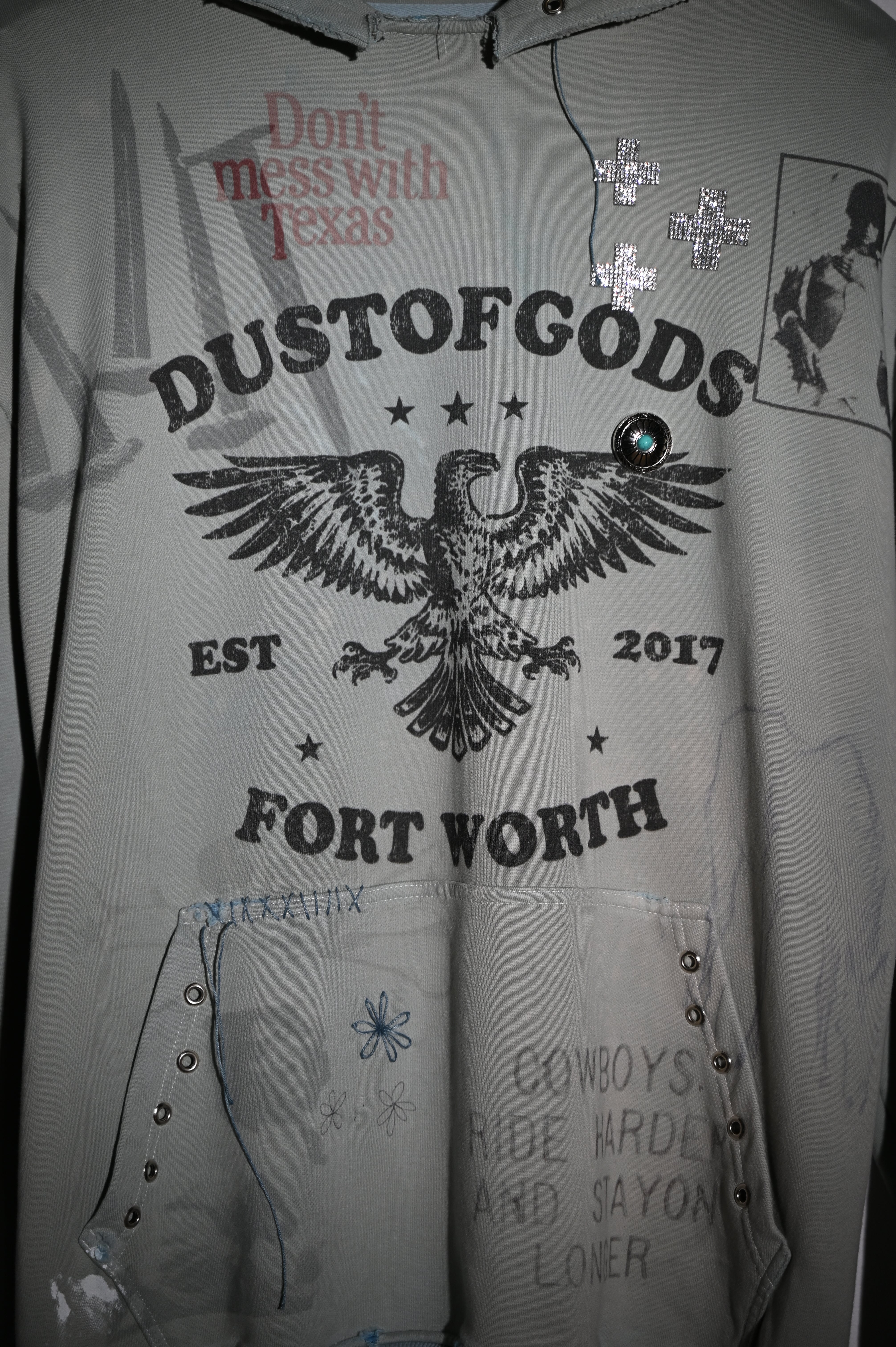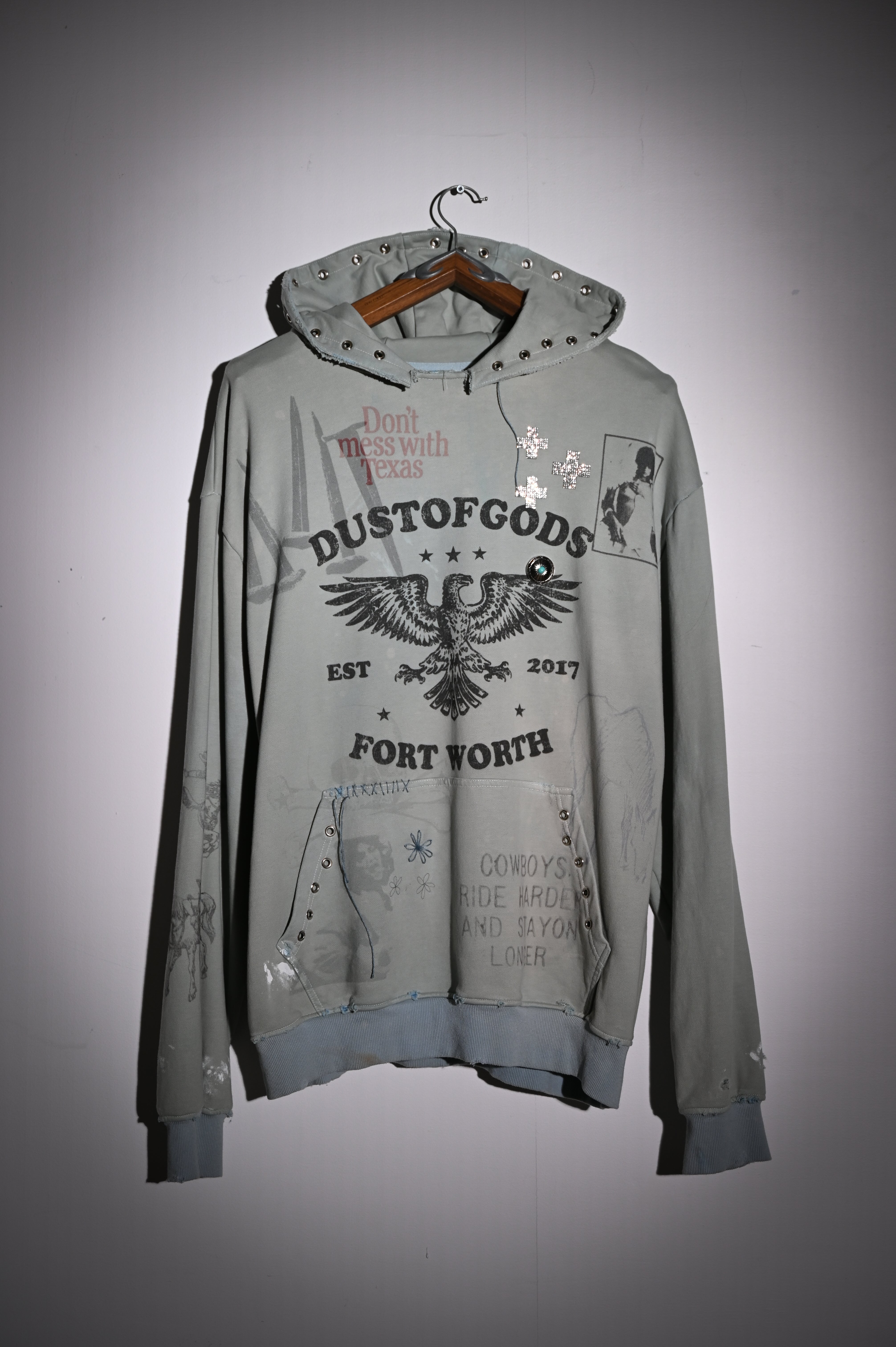 Hand-dyed and faded, distressed edges, and paint marks like scars. Adorned with grommets, rhinestones, and hand-embroidered fragments.