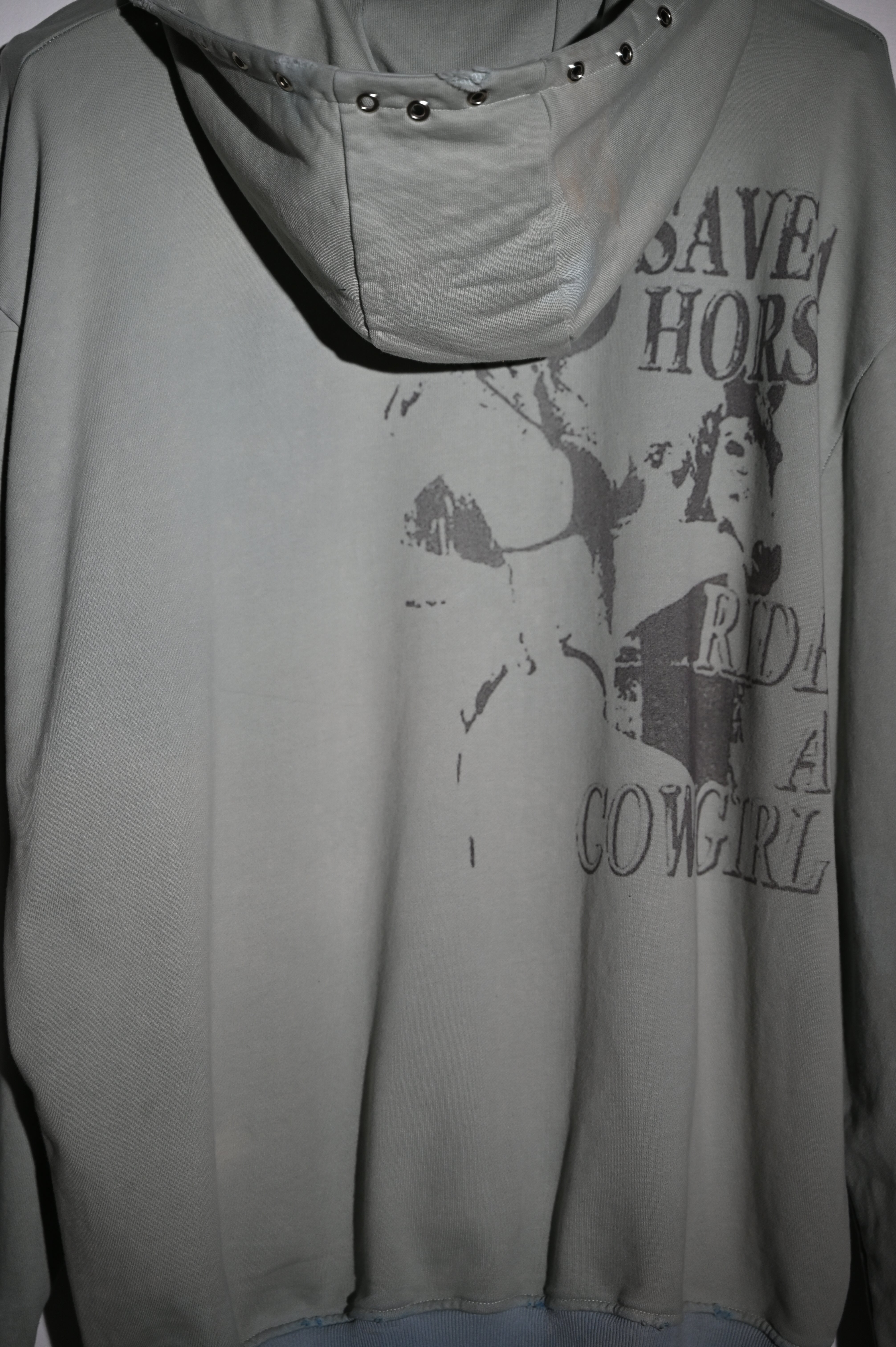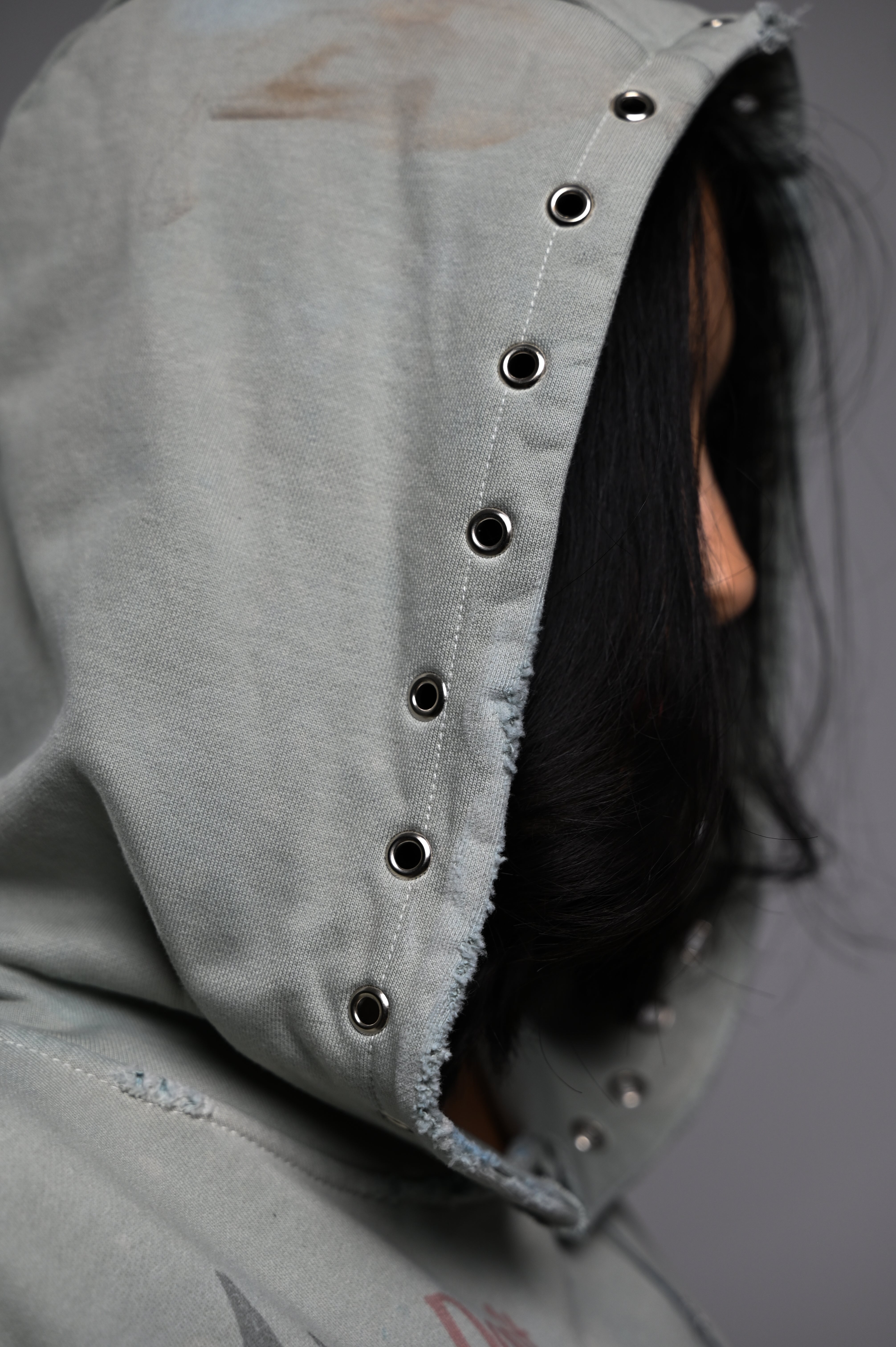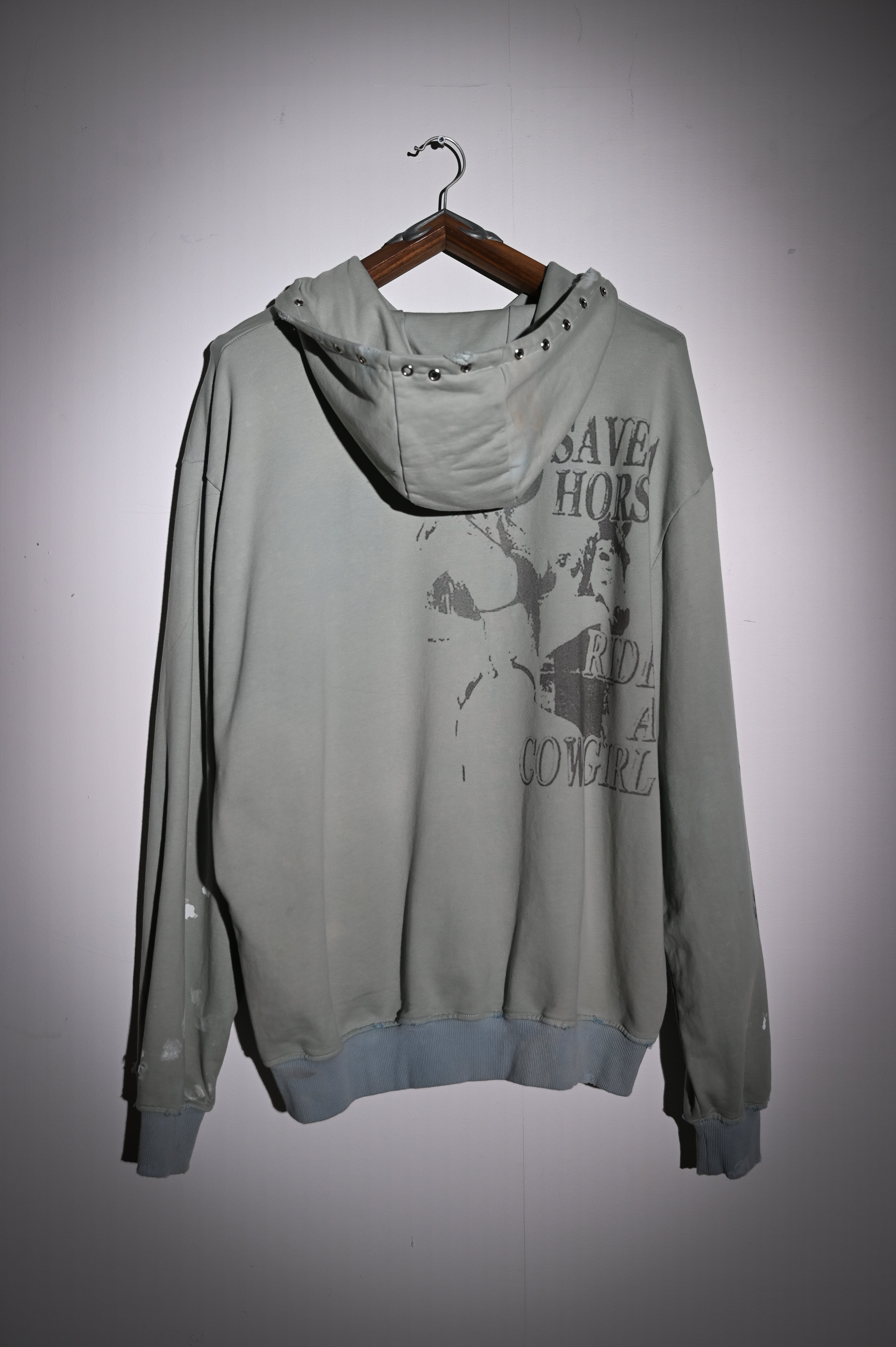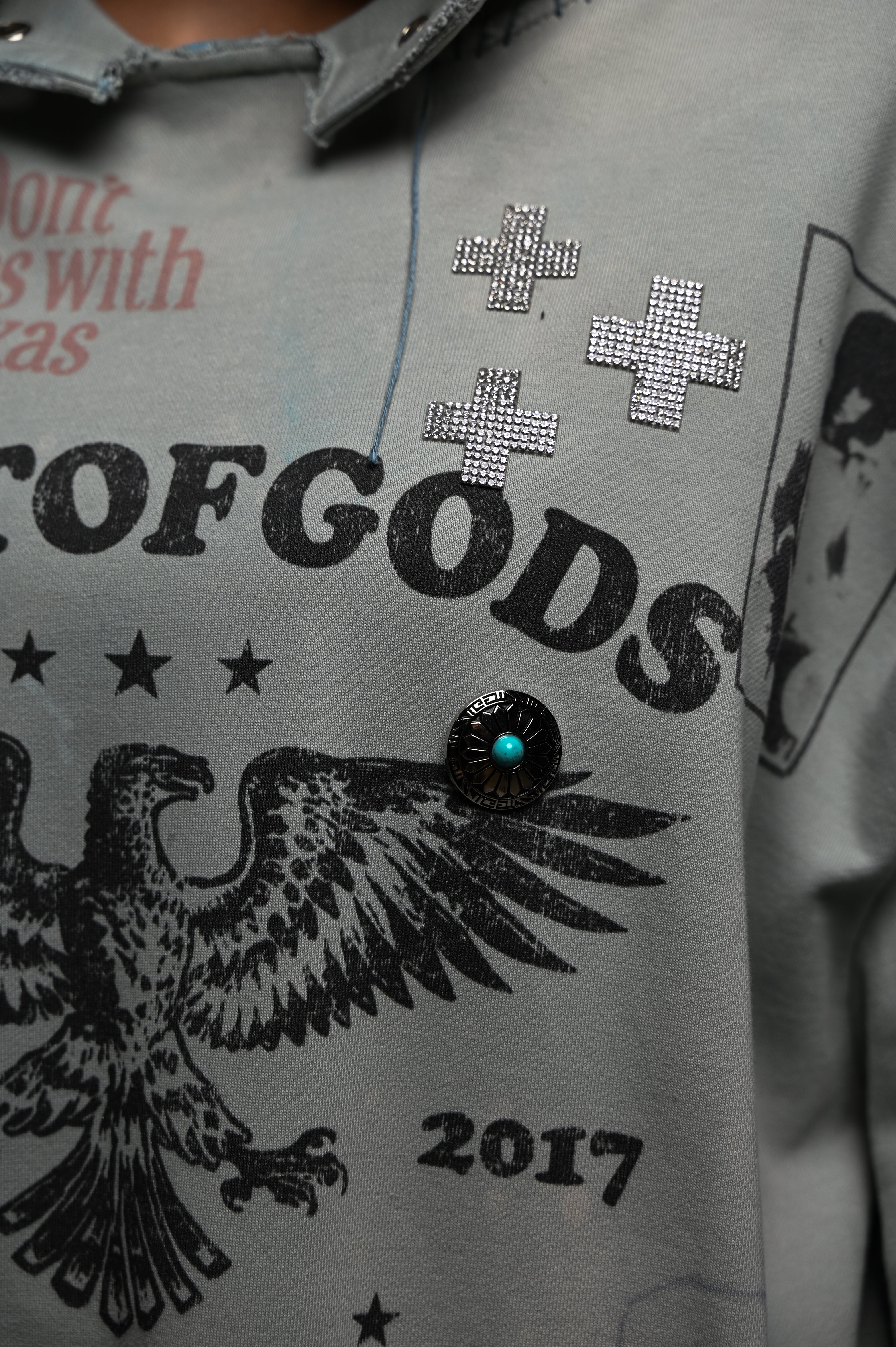 Hand-dyed and faded, distressed edges, and paint marks like scars. Adorned with grommets, rhinestones, and hand-embroidered fragments.