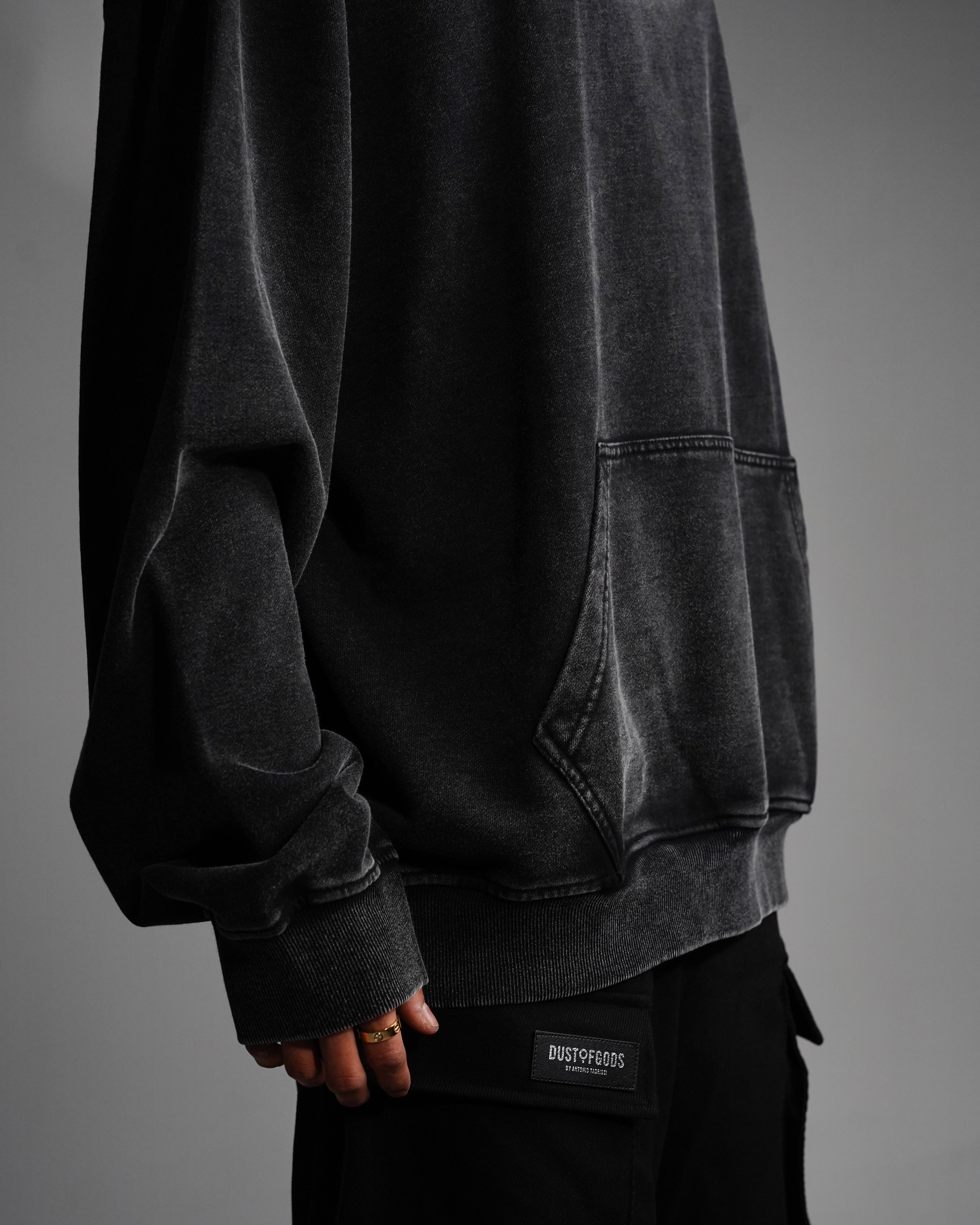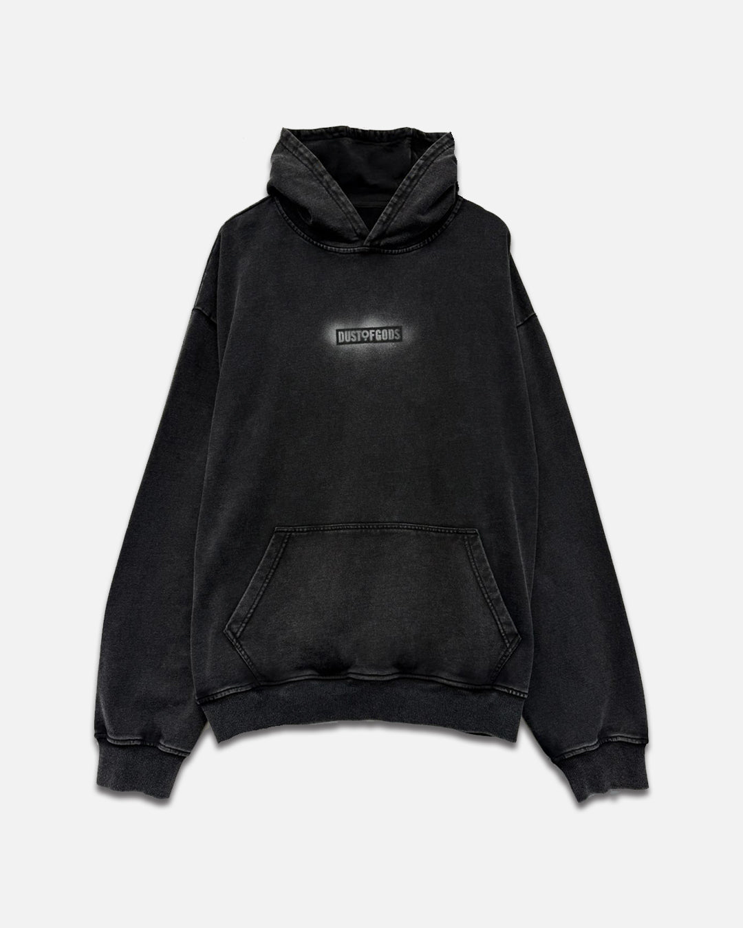 This dust of gods classic aged black hoodie is an oversized cotton hoodie featuring a hand-applied Dust of Gods branding...