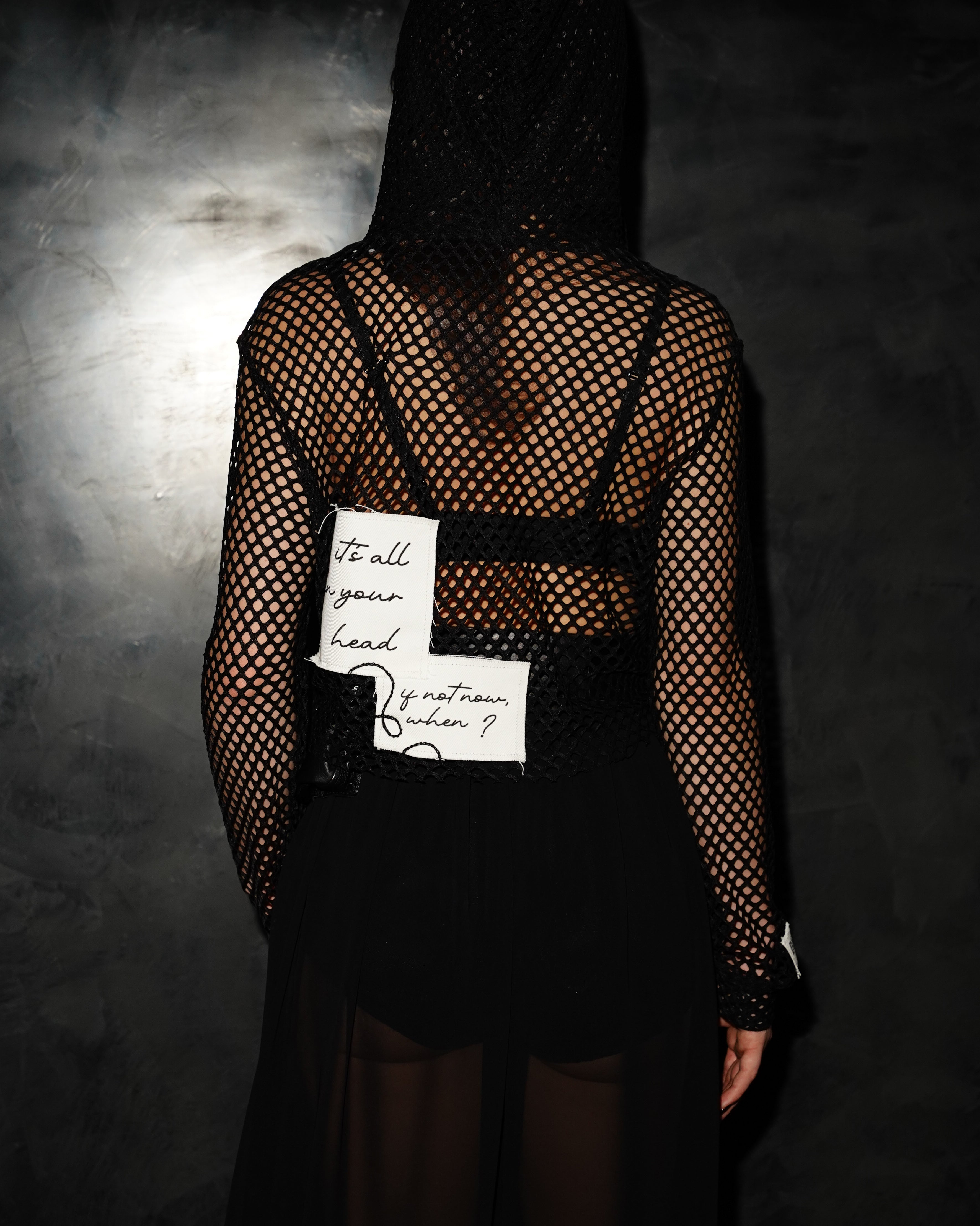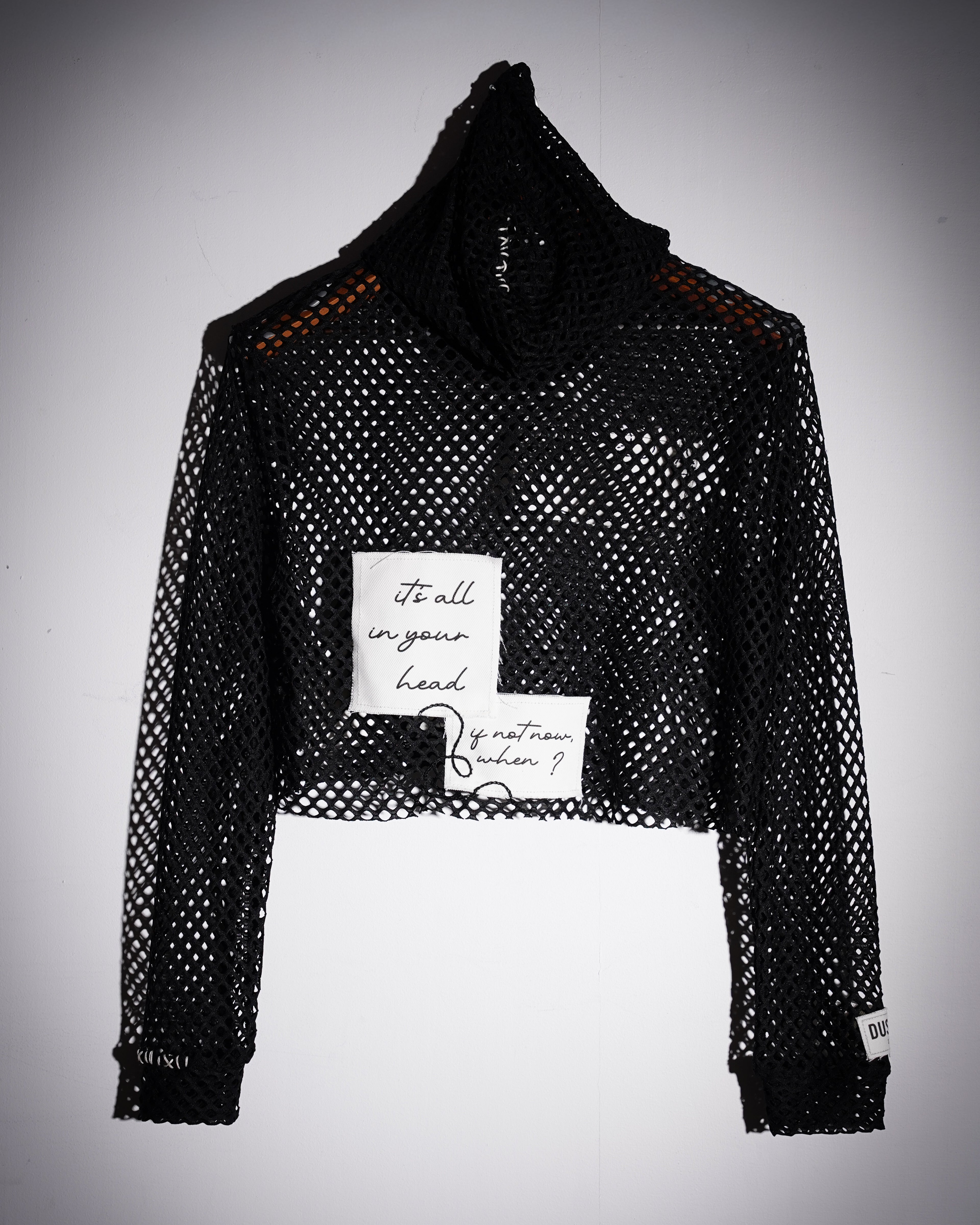 Mesh Long-Sleeve Shirt. Adaptable Face Covering. Embroidered Patchwork. 1 of 1