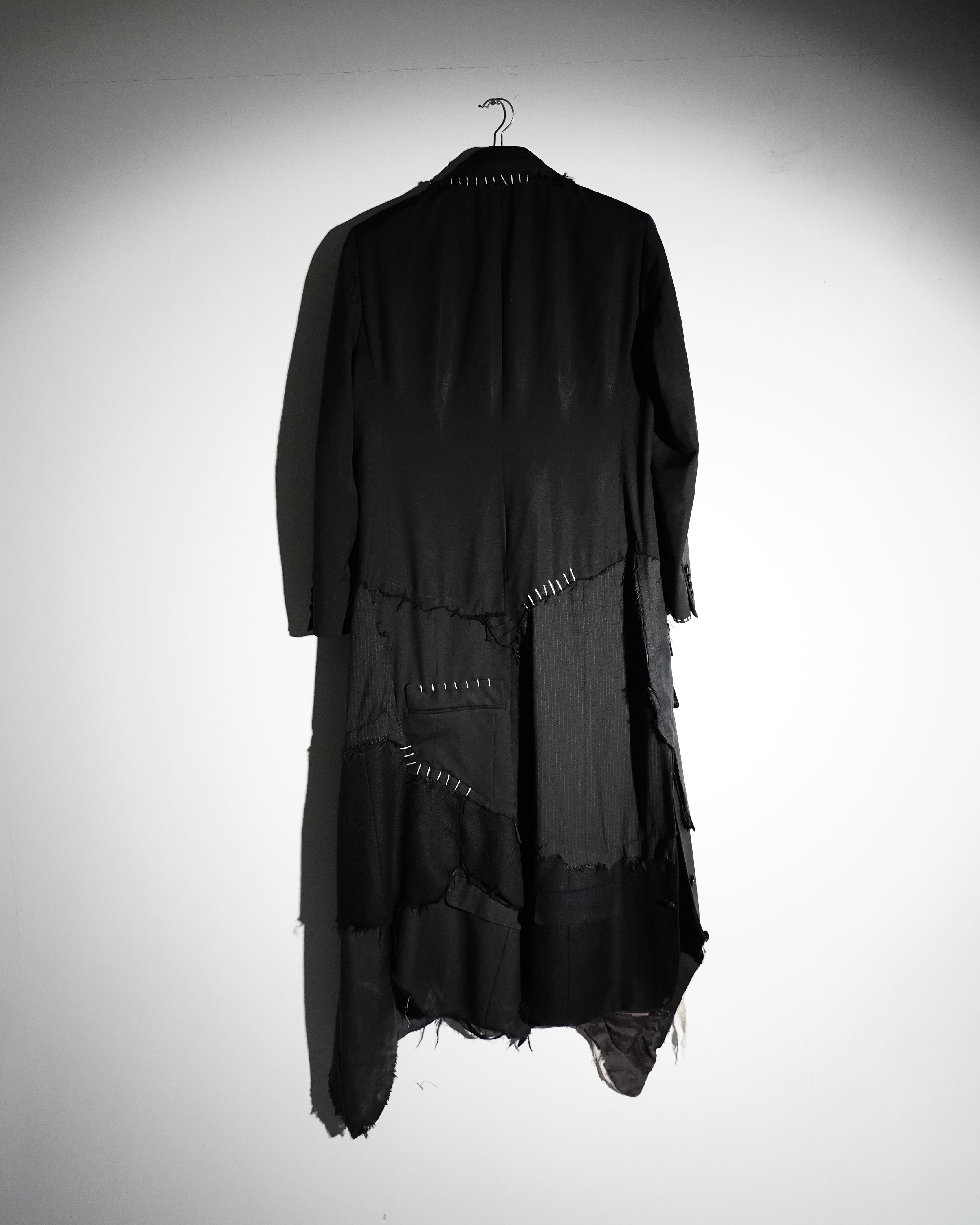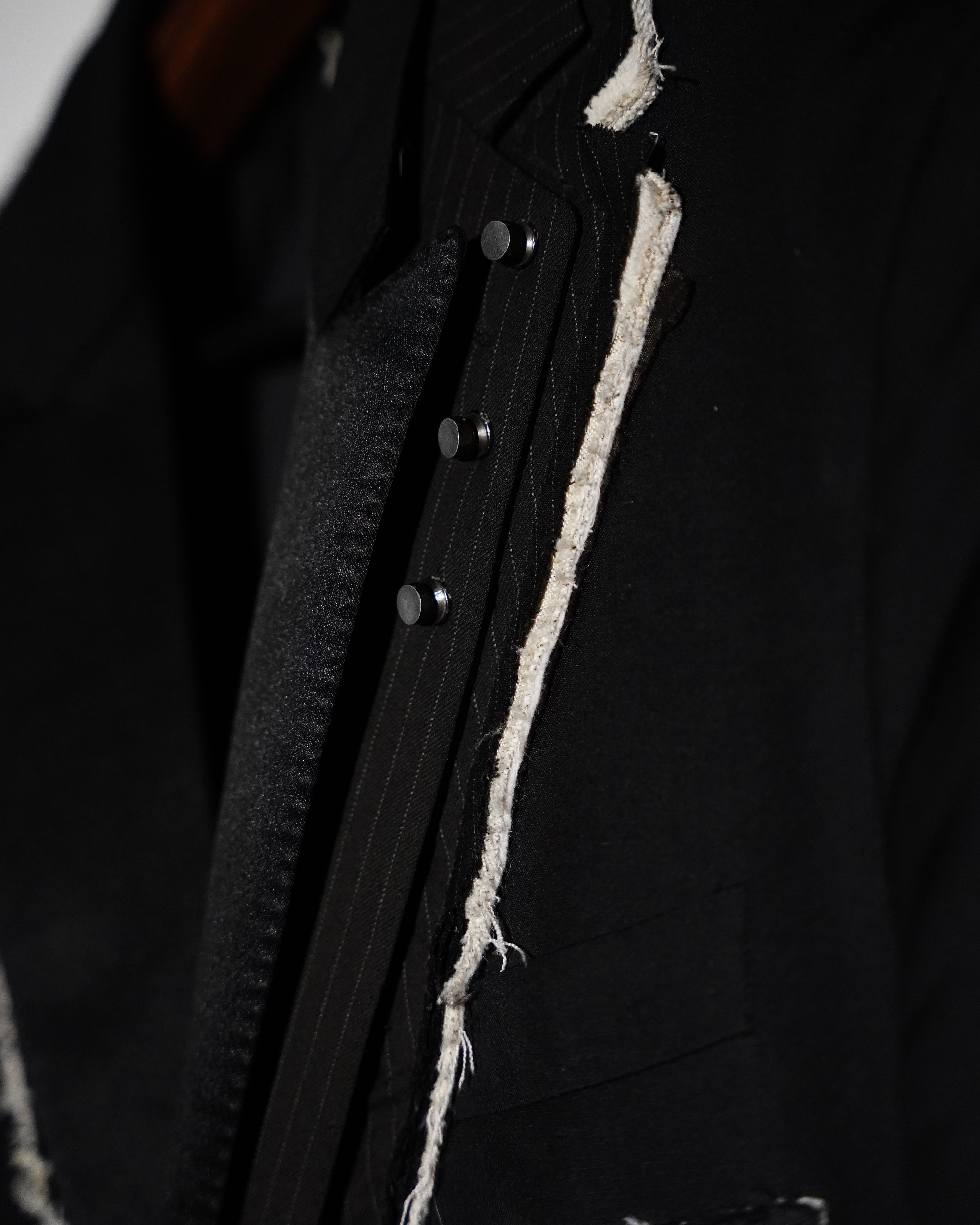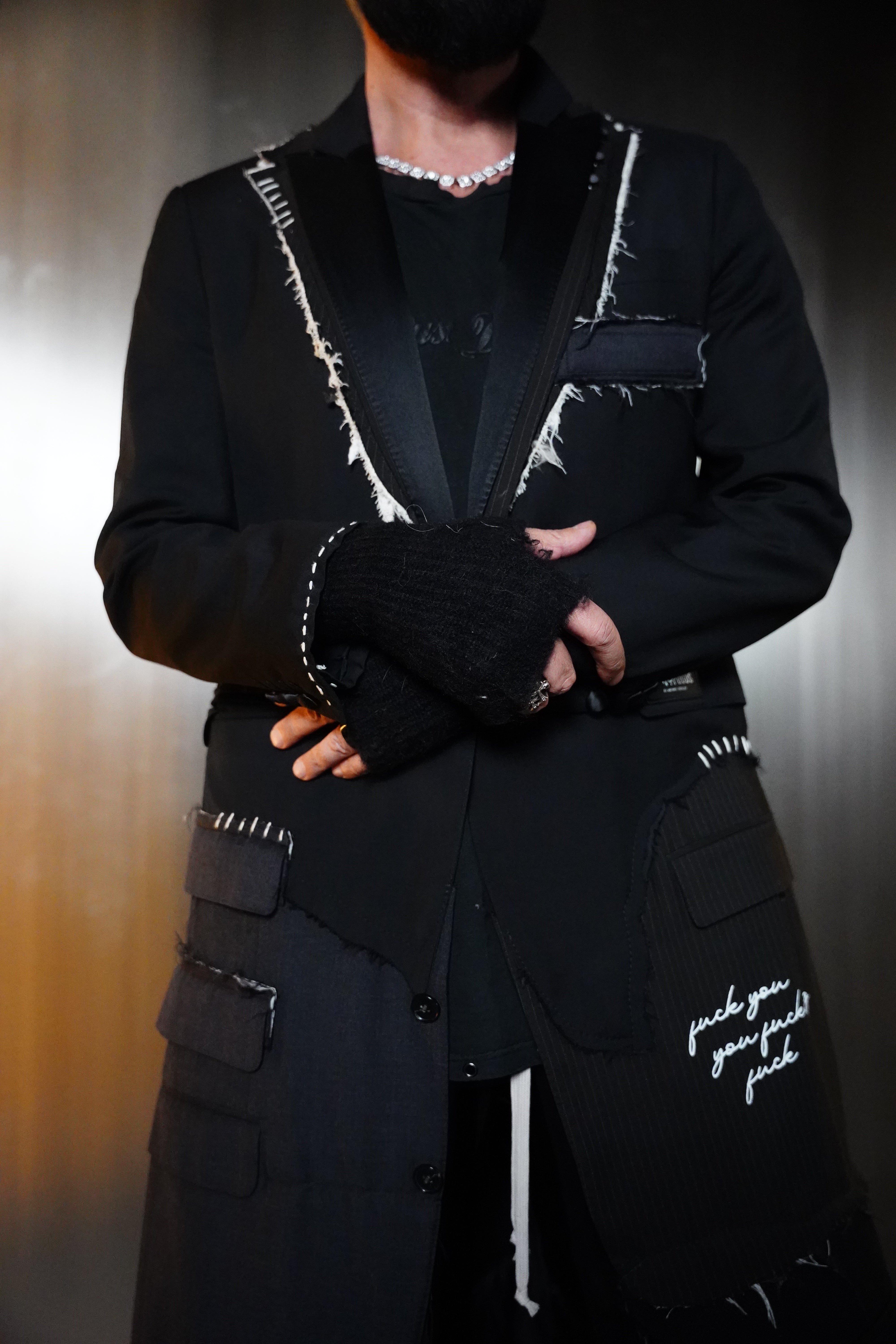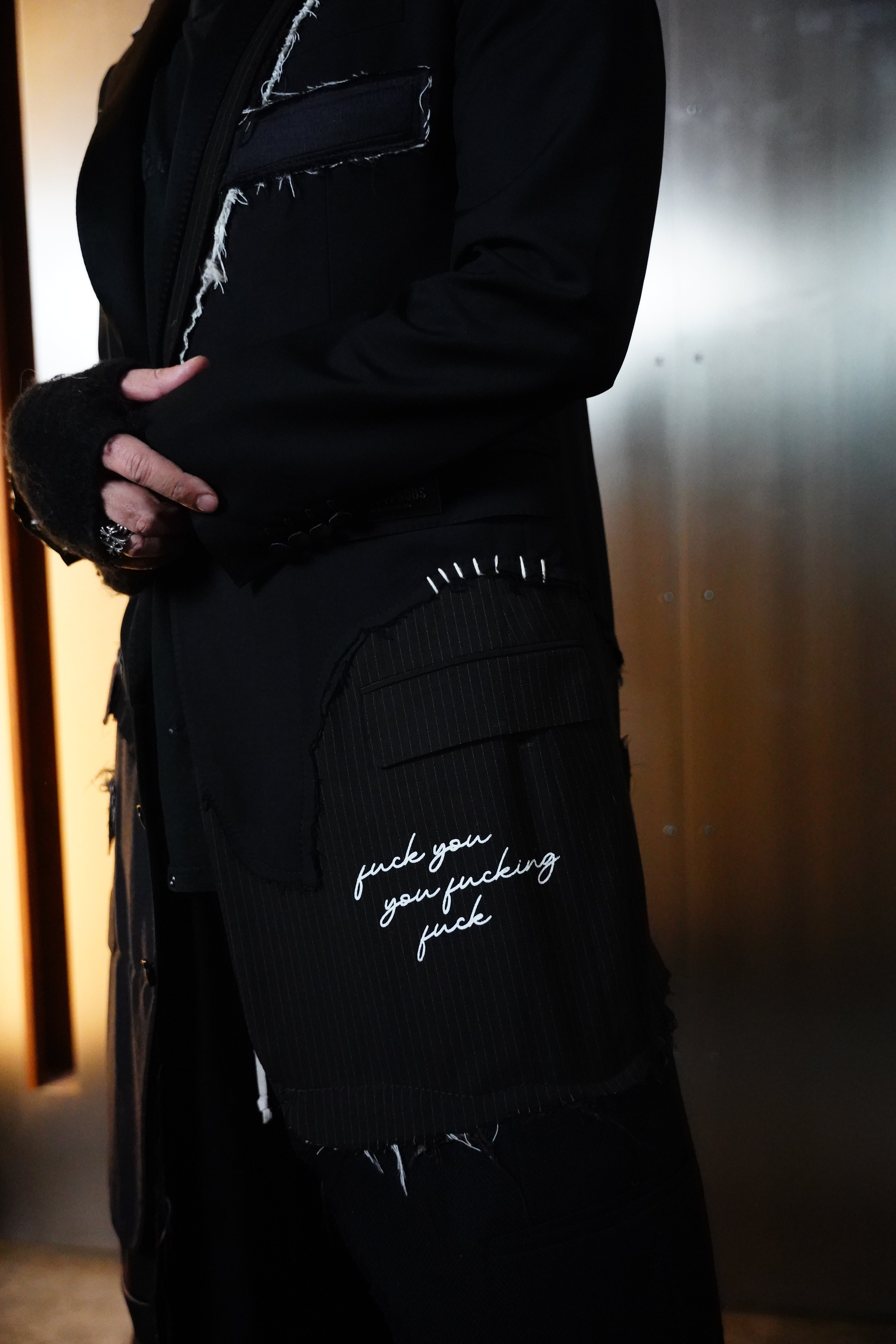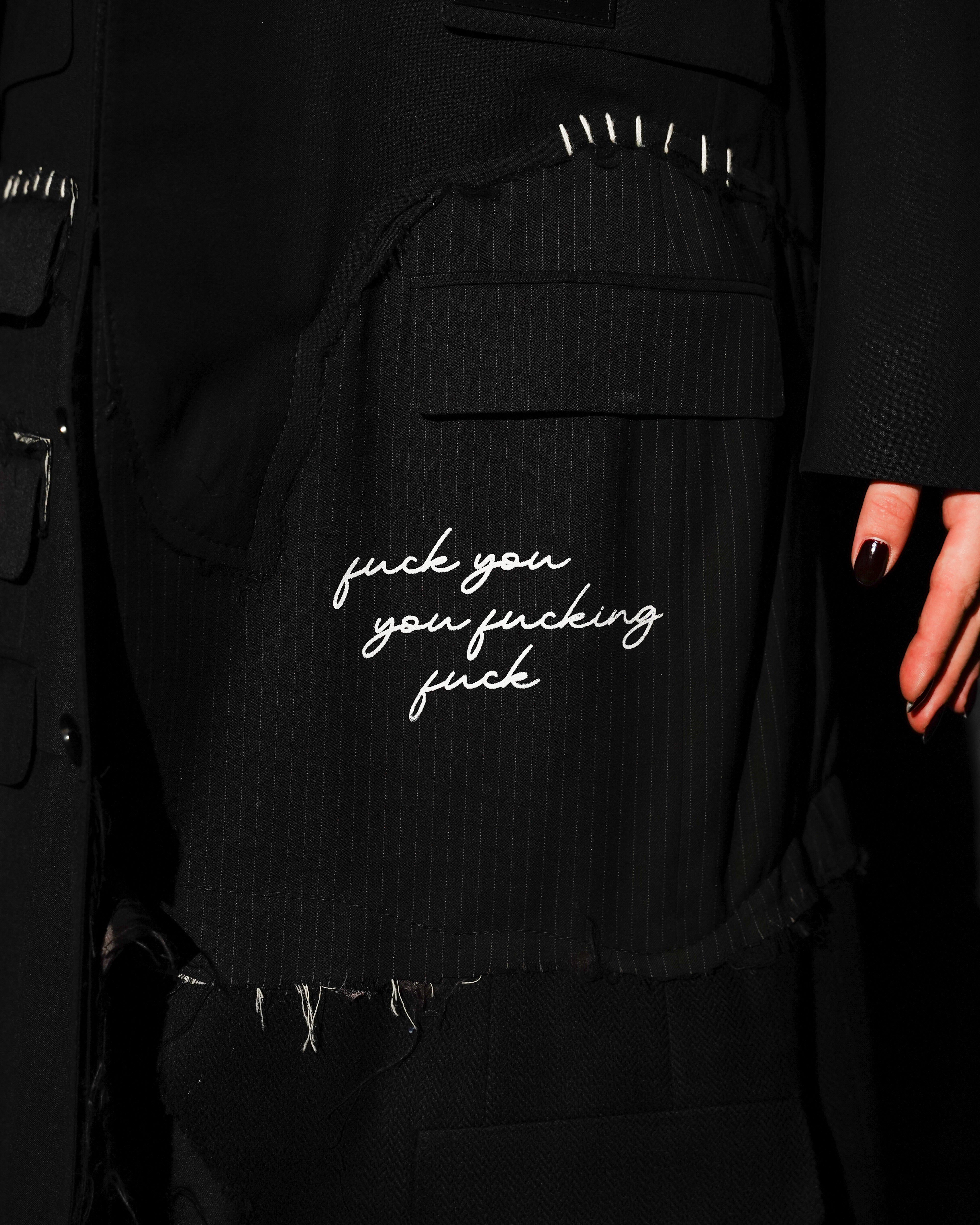 1-OF-1. L-XL. Multi-Deconstructed Blazer. Embroidery Details. Distressed Lapel, Pockets, Abstracted Writing Detail mentioning "Fuck You You Fucking Fuck"