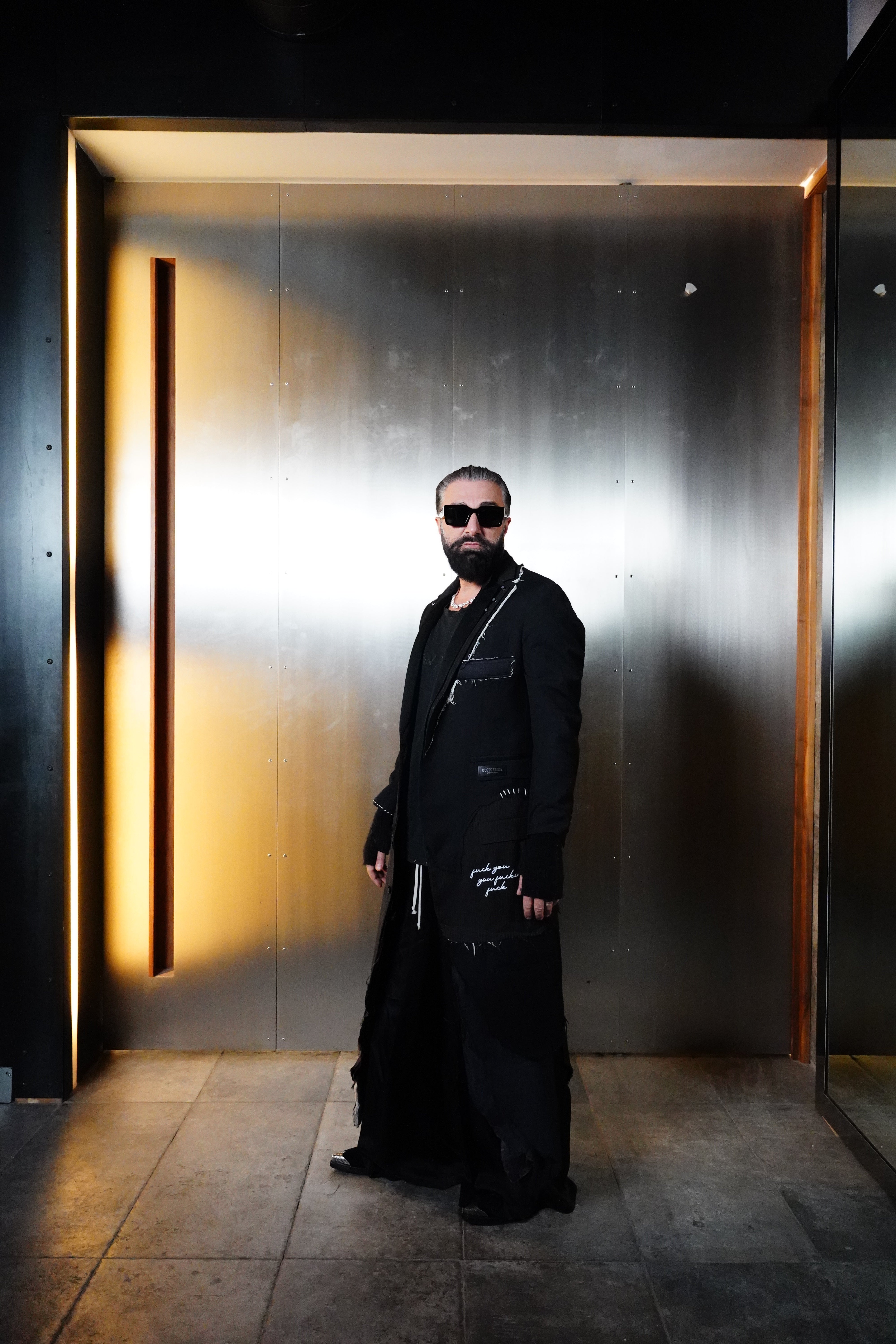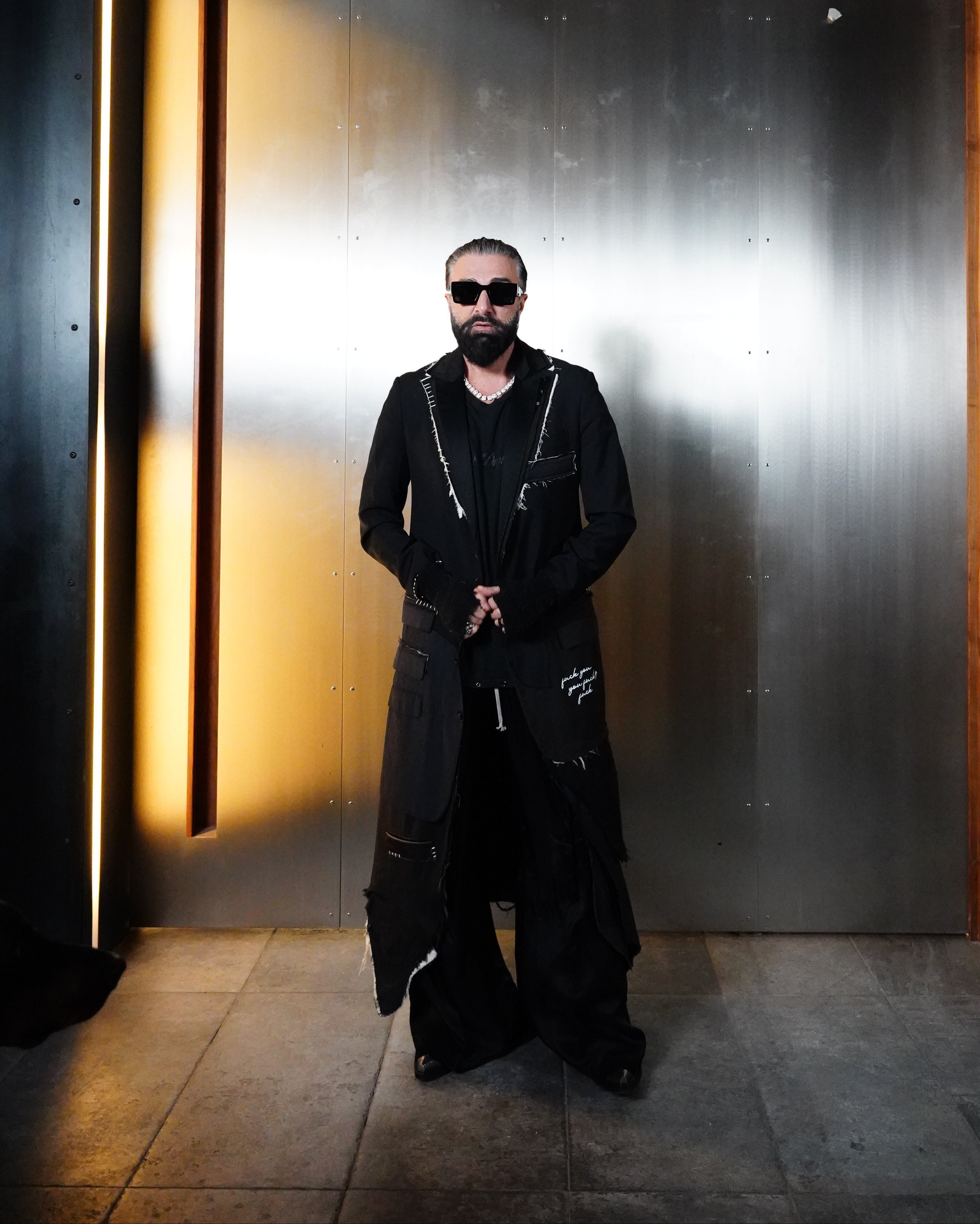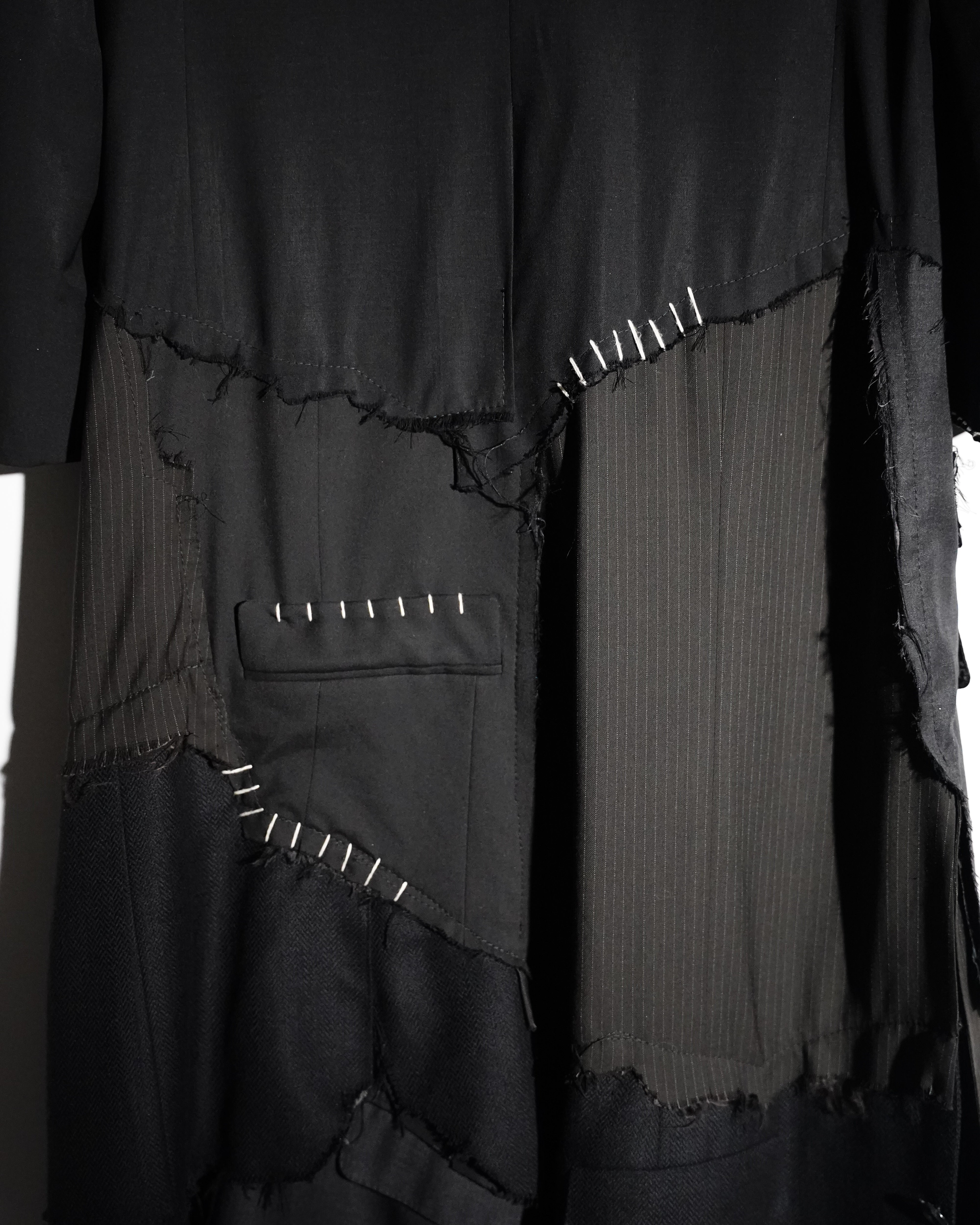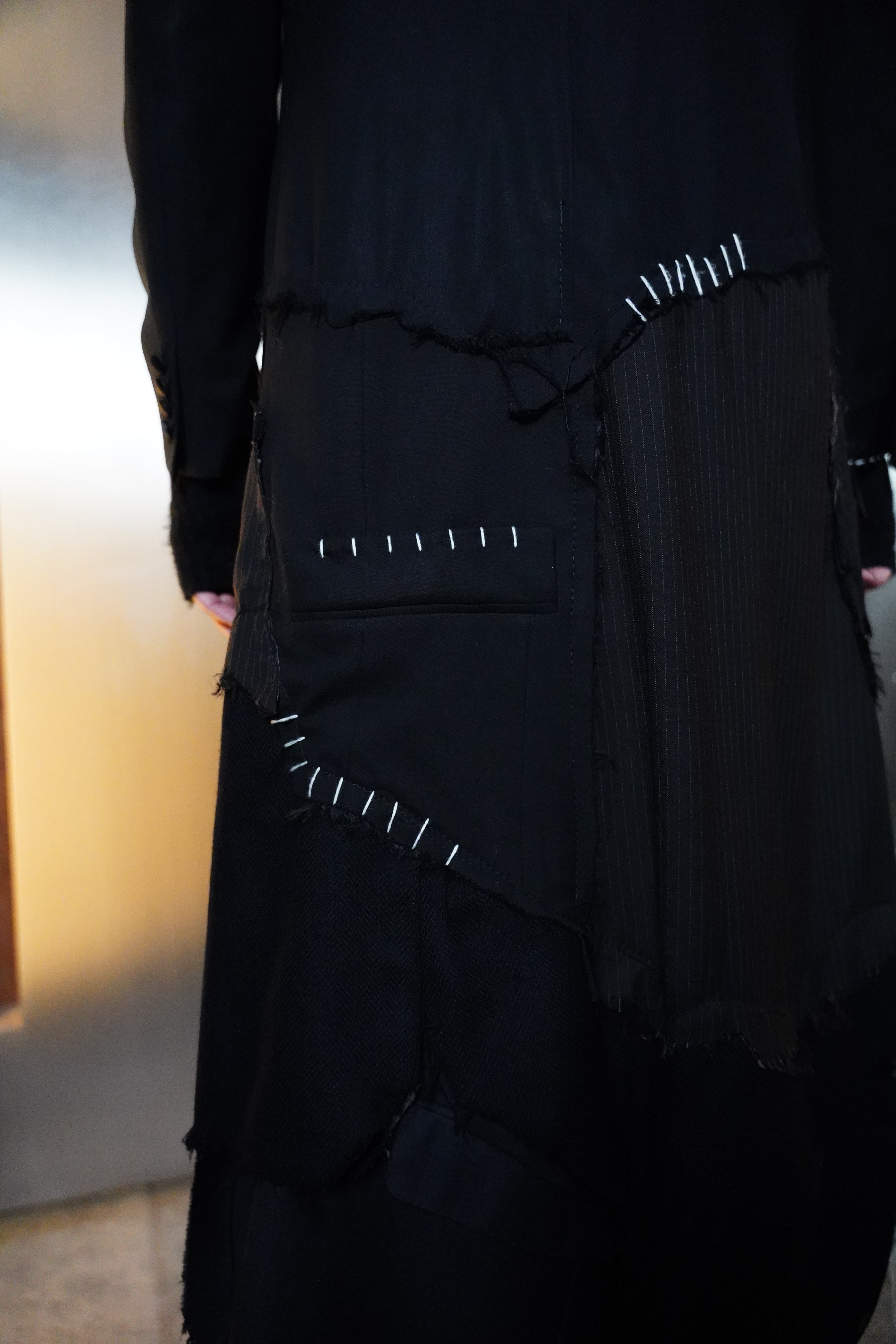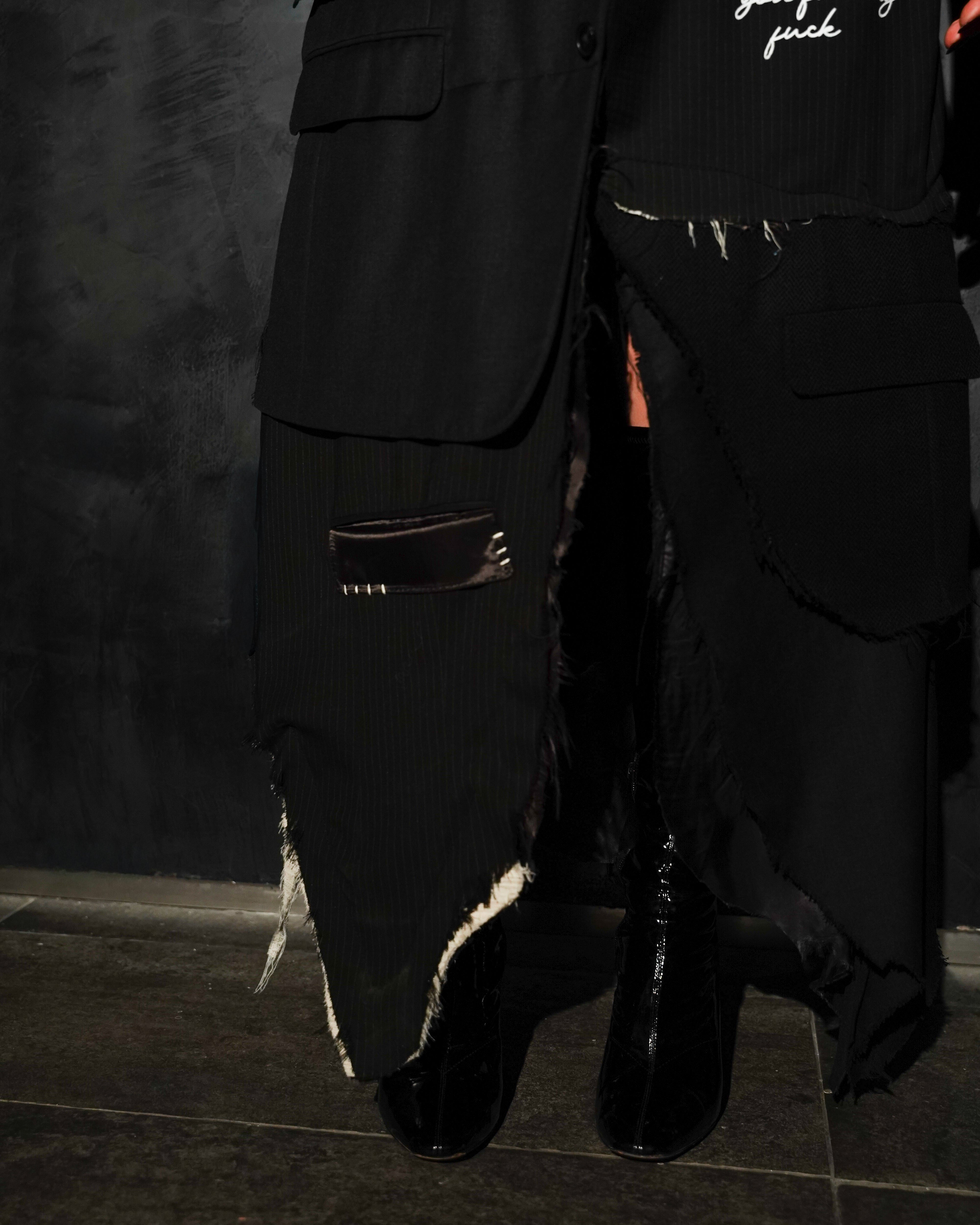 1-OF-1. L-XL. Multi-Deconstructed Blazer. Embroidery Details. Distressed Lapel, Pockets, Abstracted Writing Detail mentioning "Fuck You You Fucking Fuck"