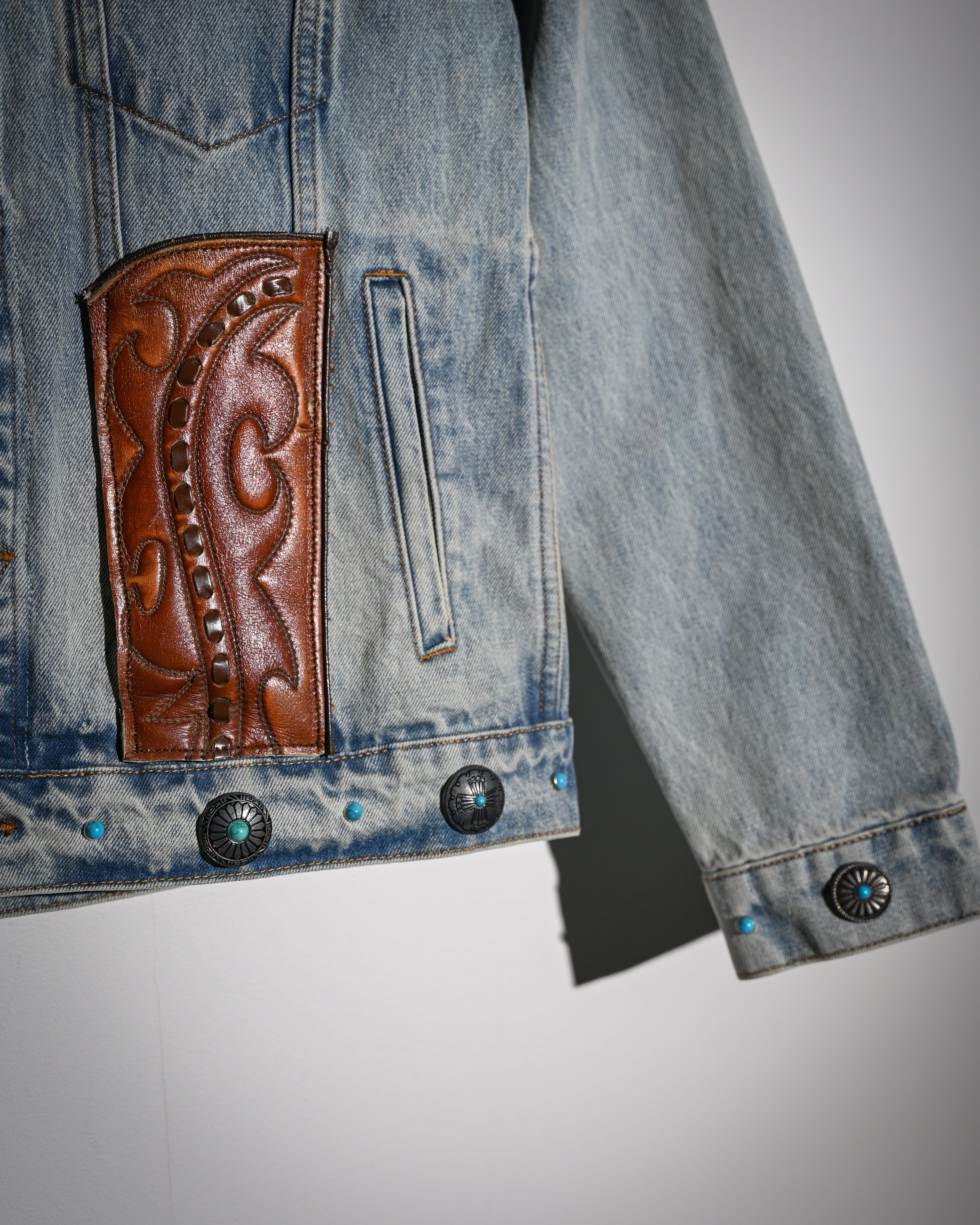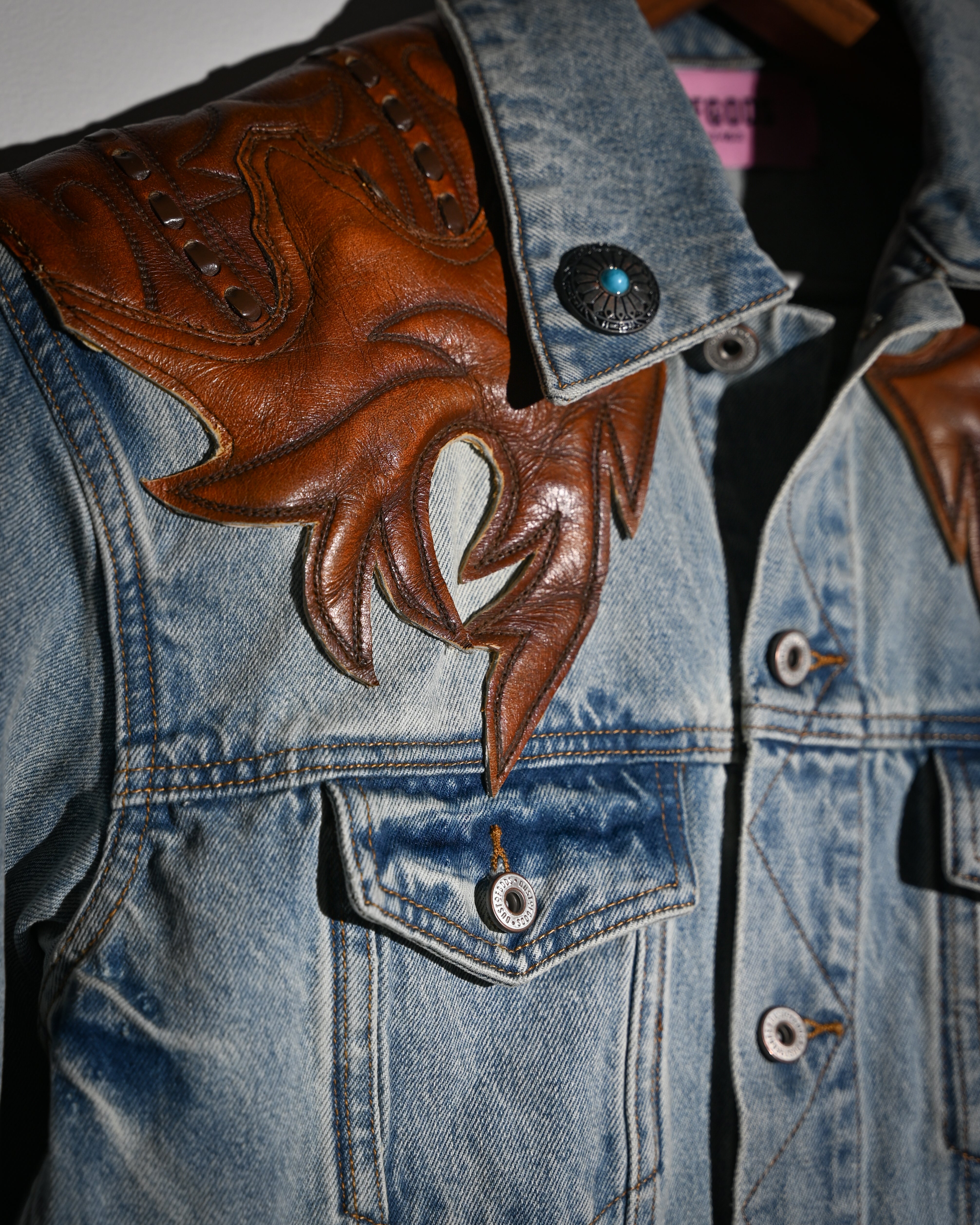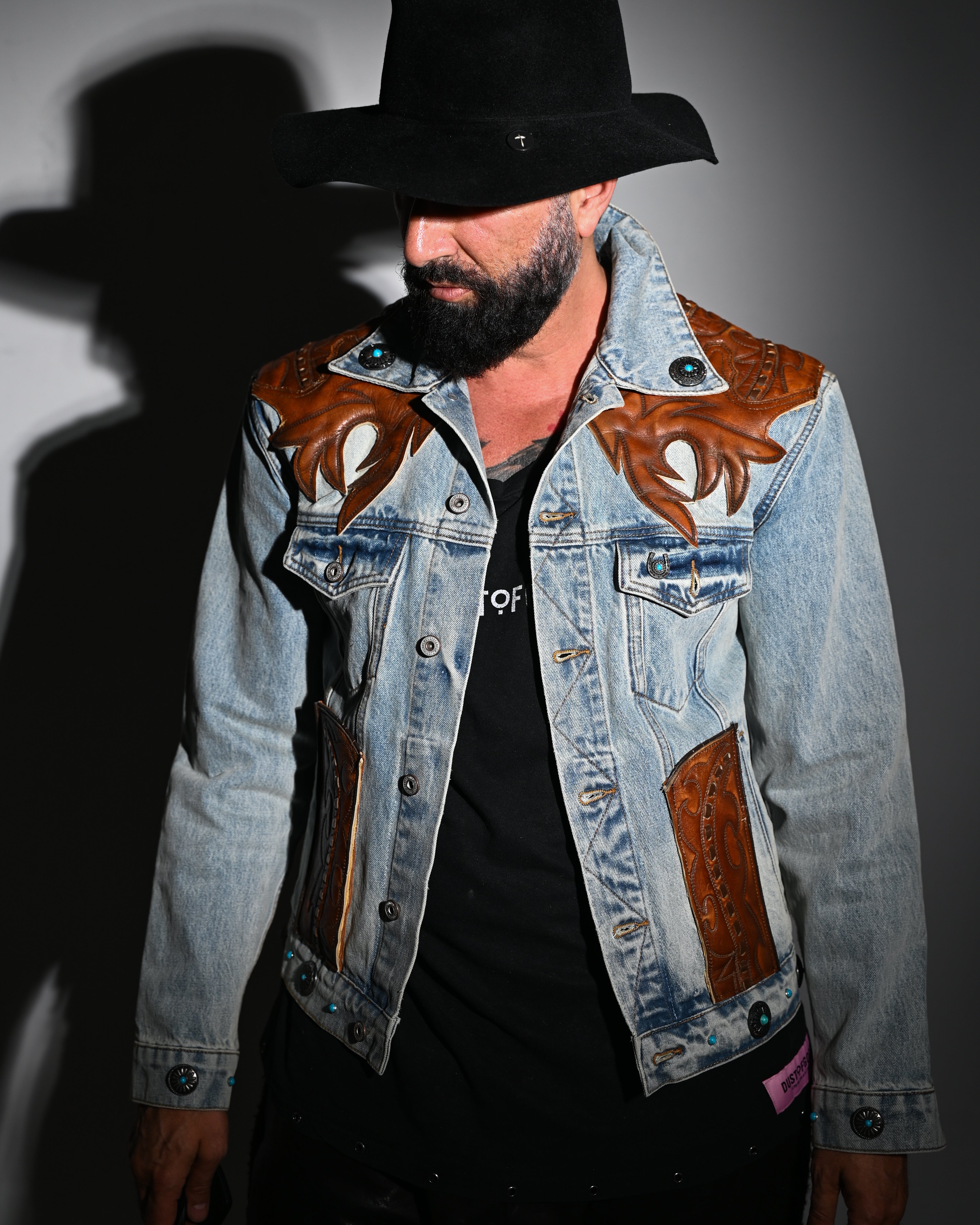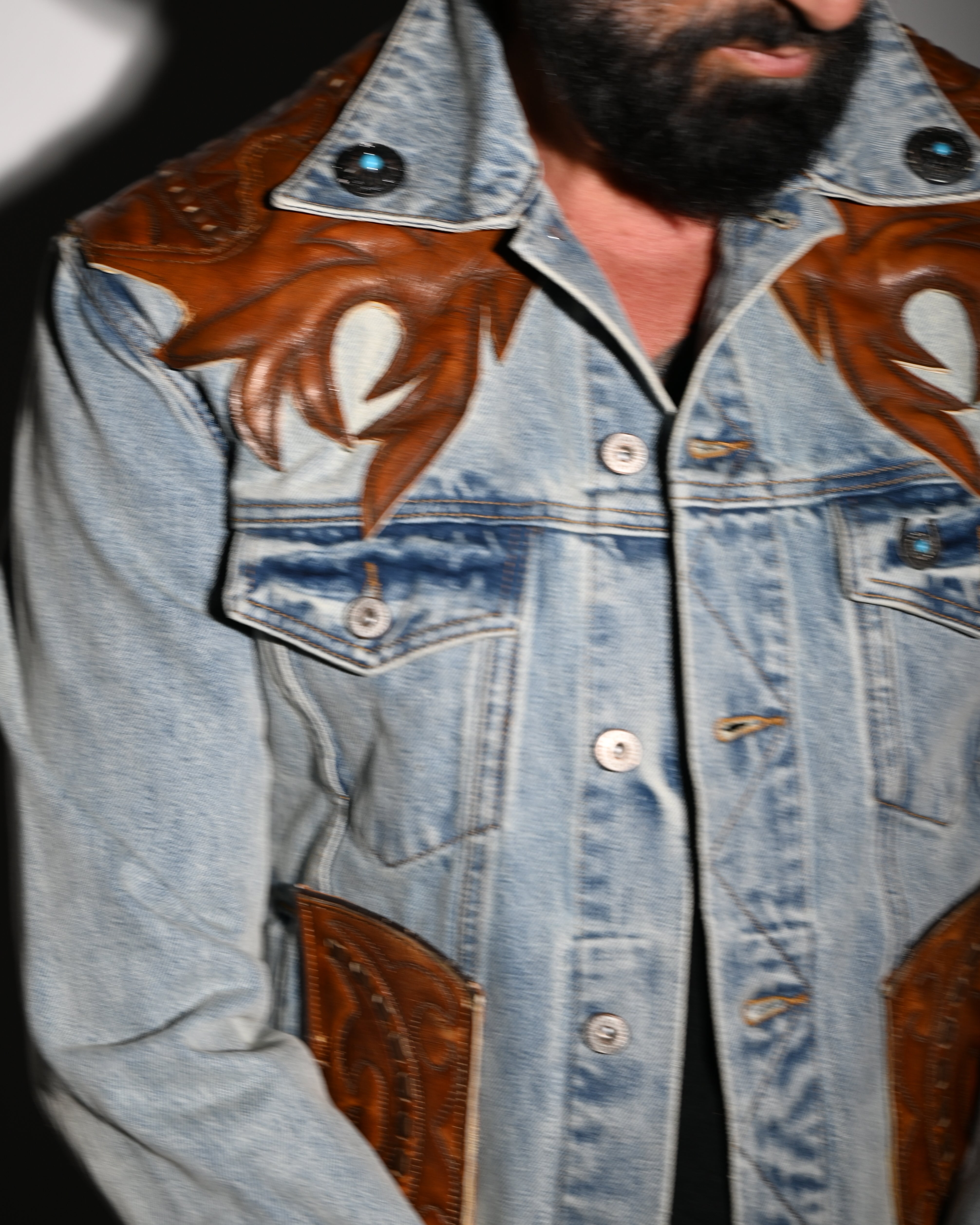 The jacket is built with repurposed leather panels, cut directly from a vintage cowboy boot and integrated into the shoulders and pockets. The tooling, texture, and patina of the leather bring the authentic Western craftsmanship into the design without romanticizing it.