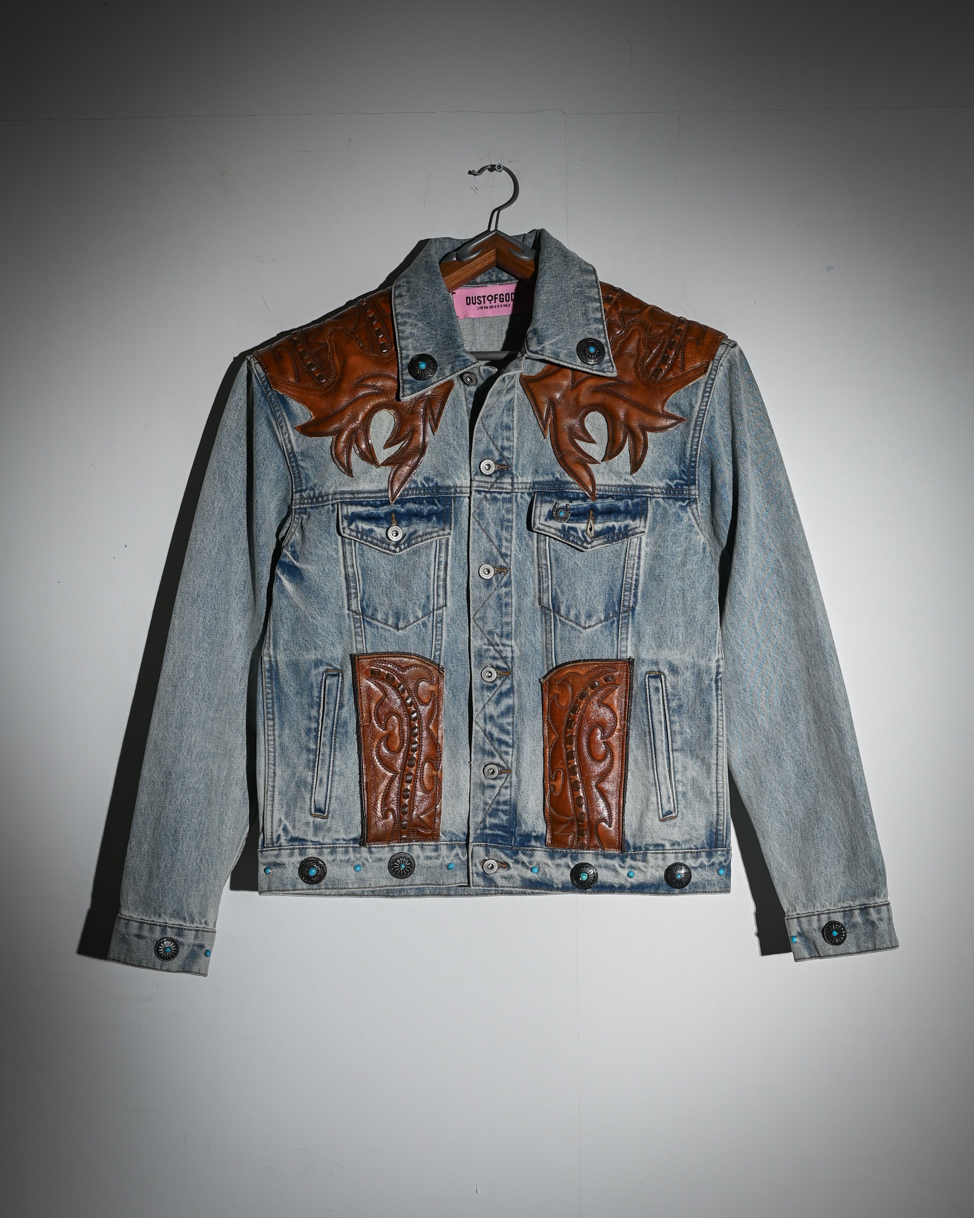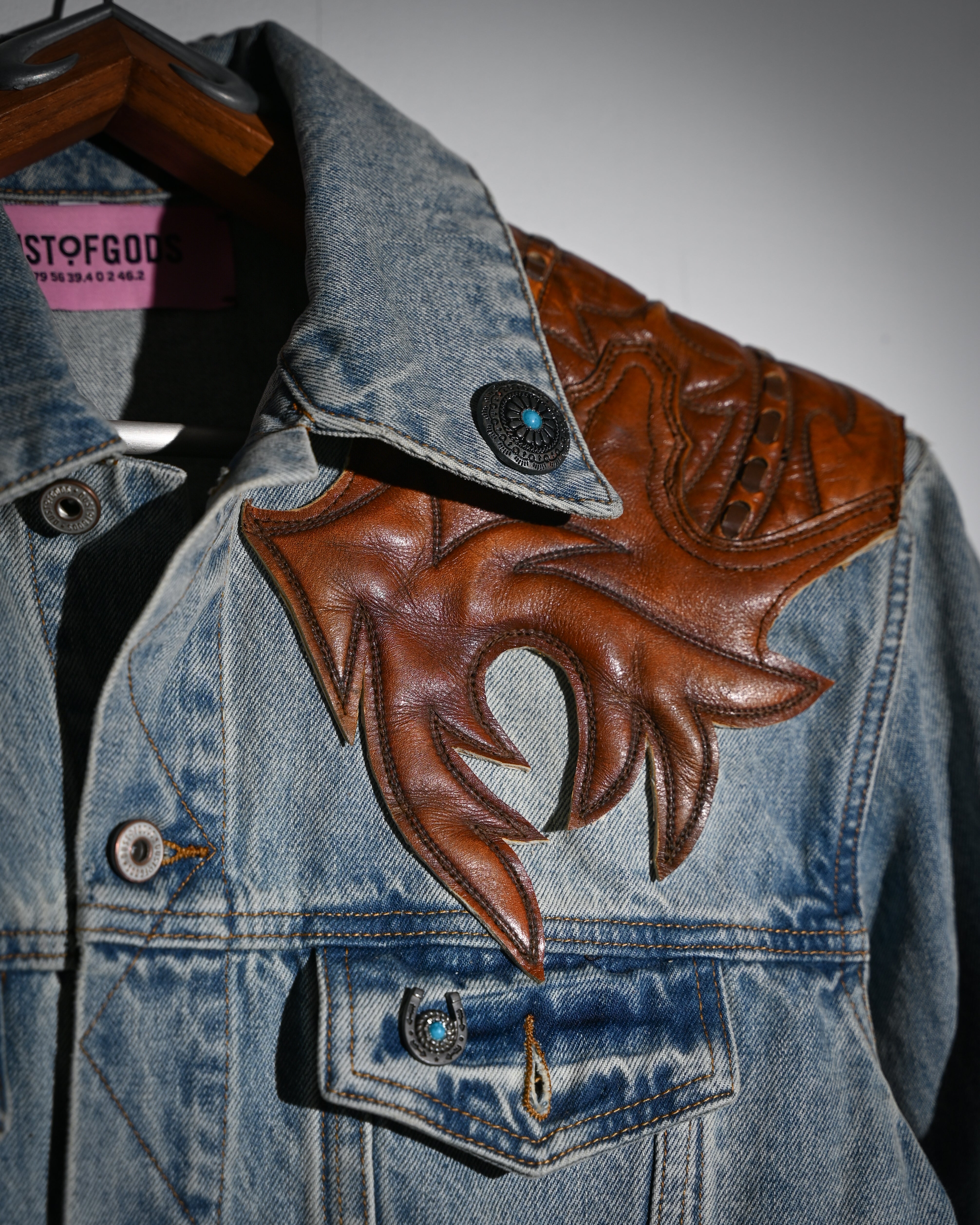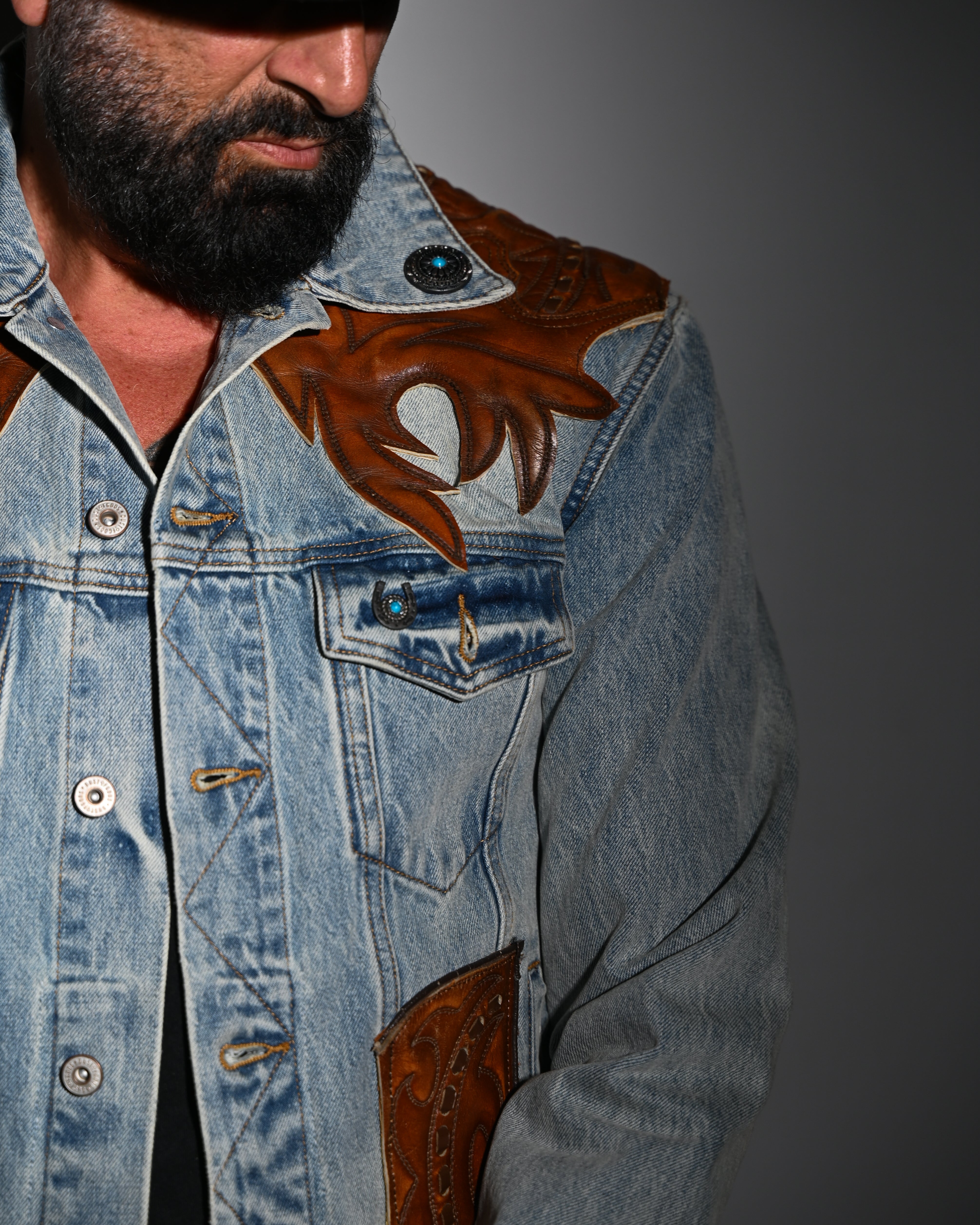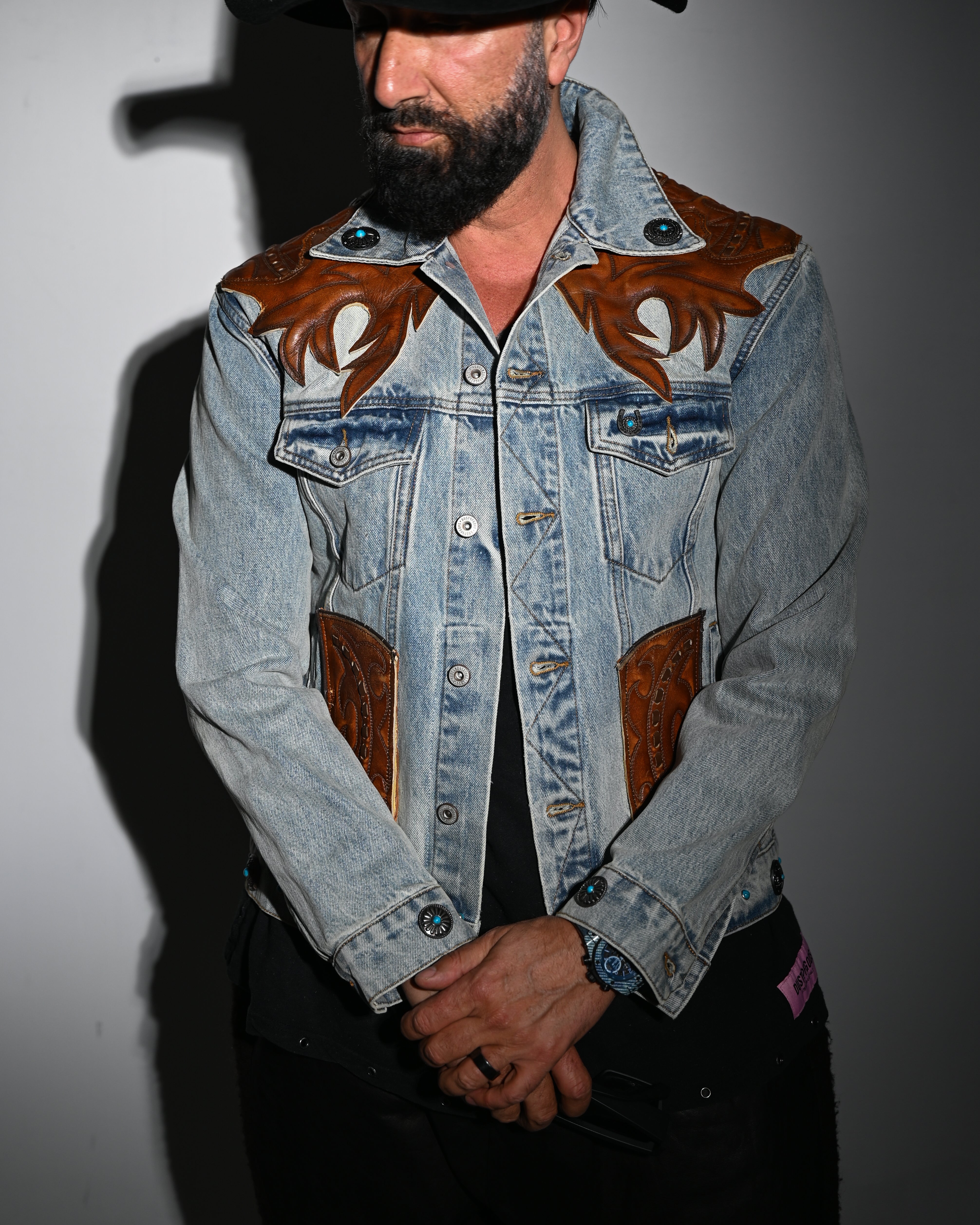 The jacket is built with repurposed leather panels, cut directly from a vintage cowboy boot and integrated into the shoulders and pockets. The tooling, texture, and patina of the leather bring the authentic Western craftsmanship into the design without romanticizing it.