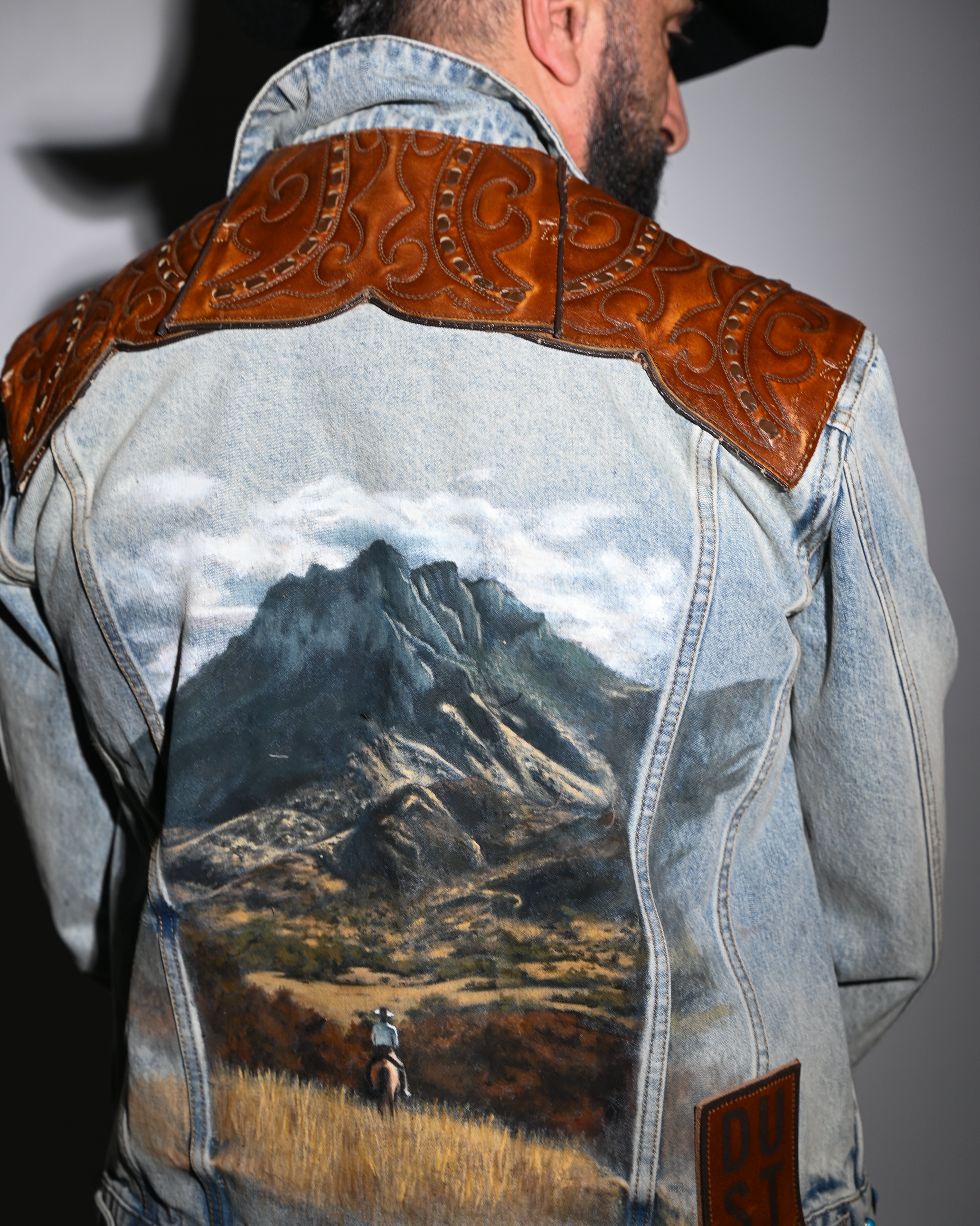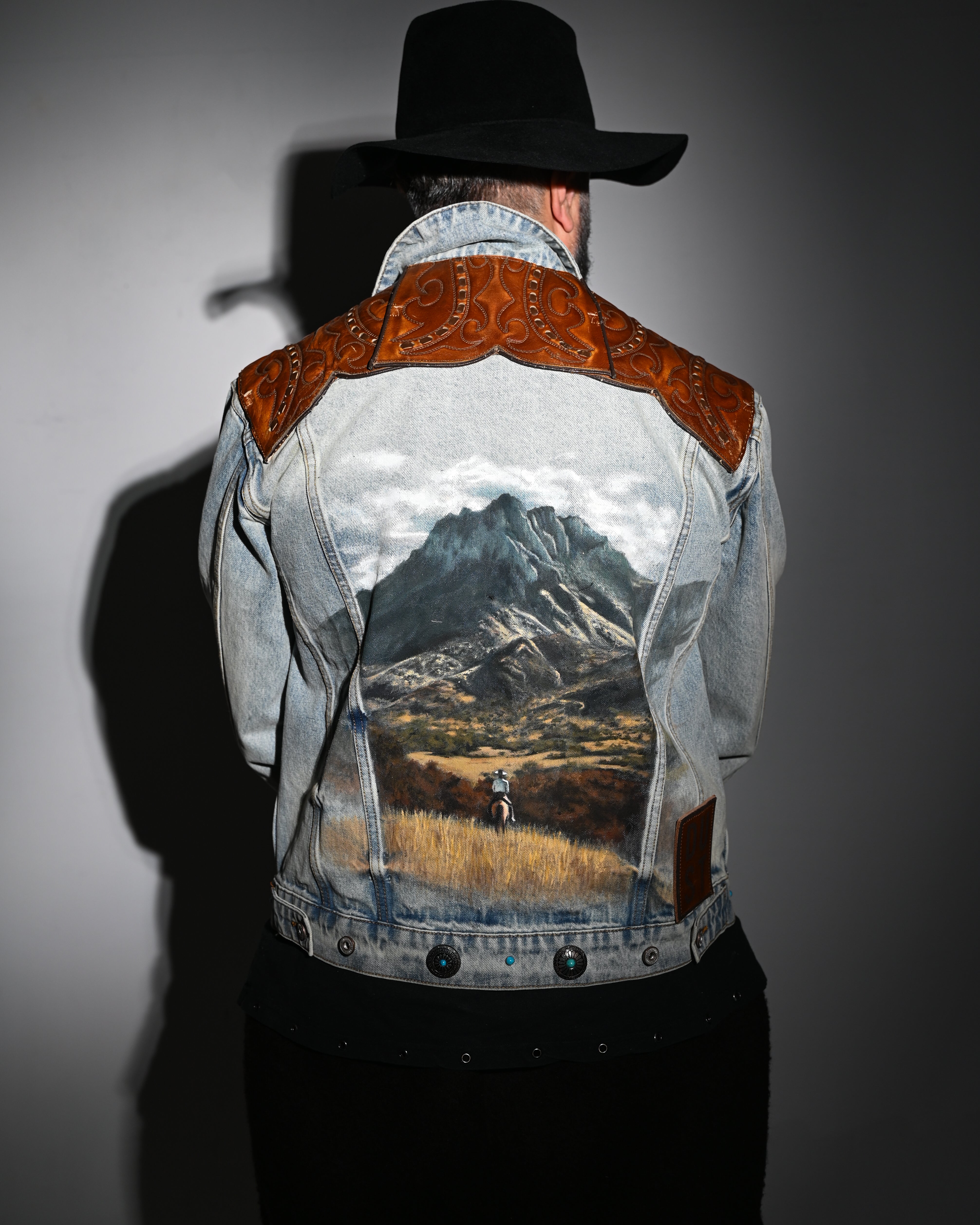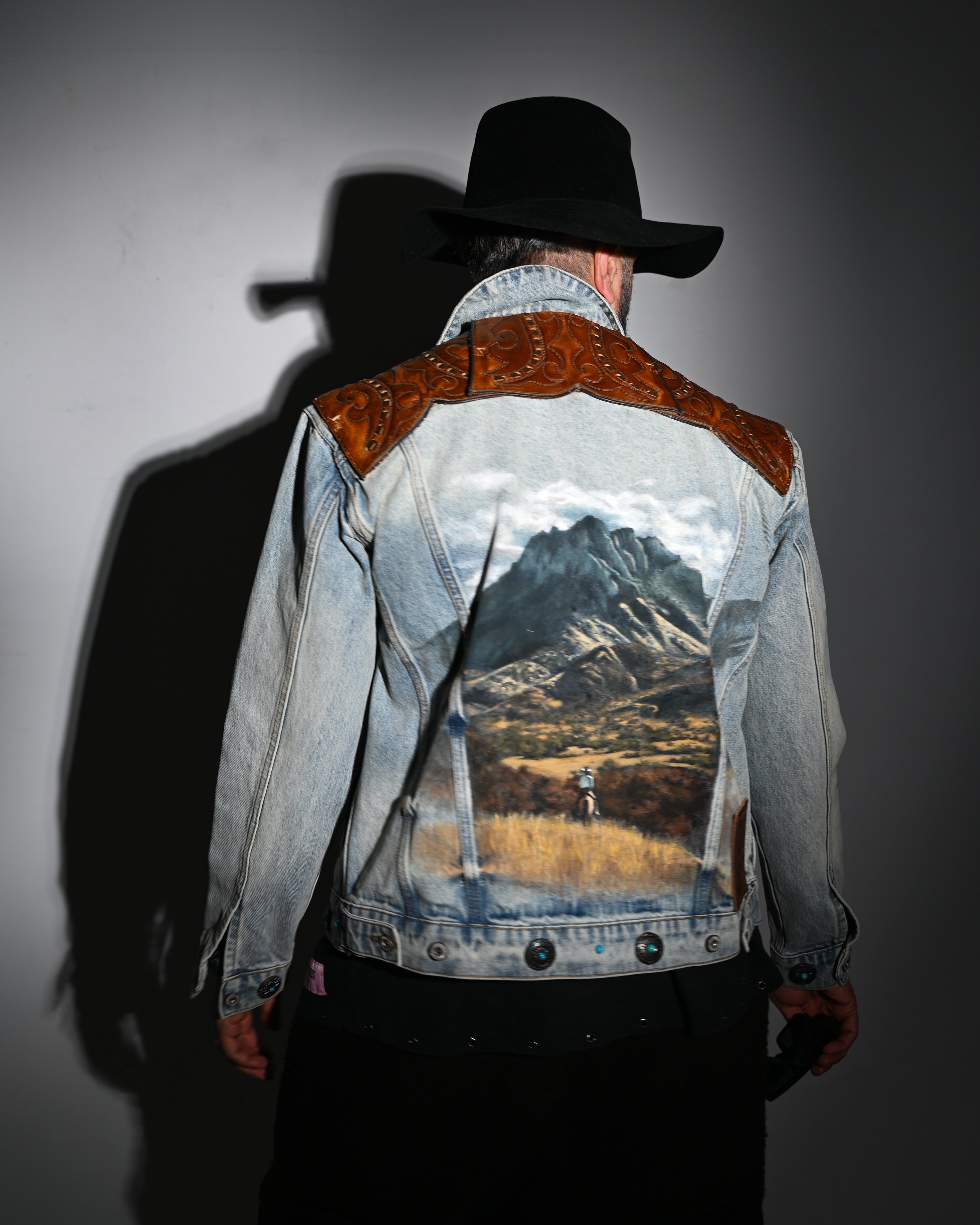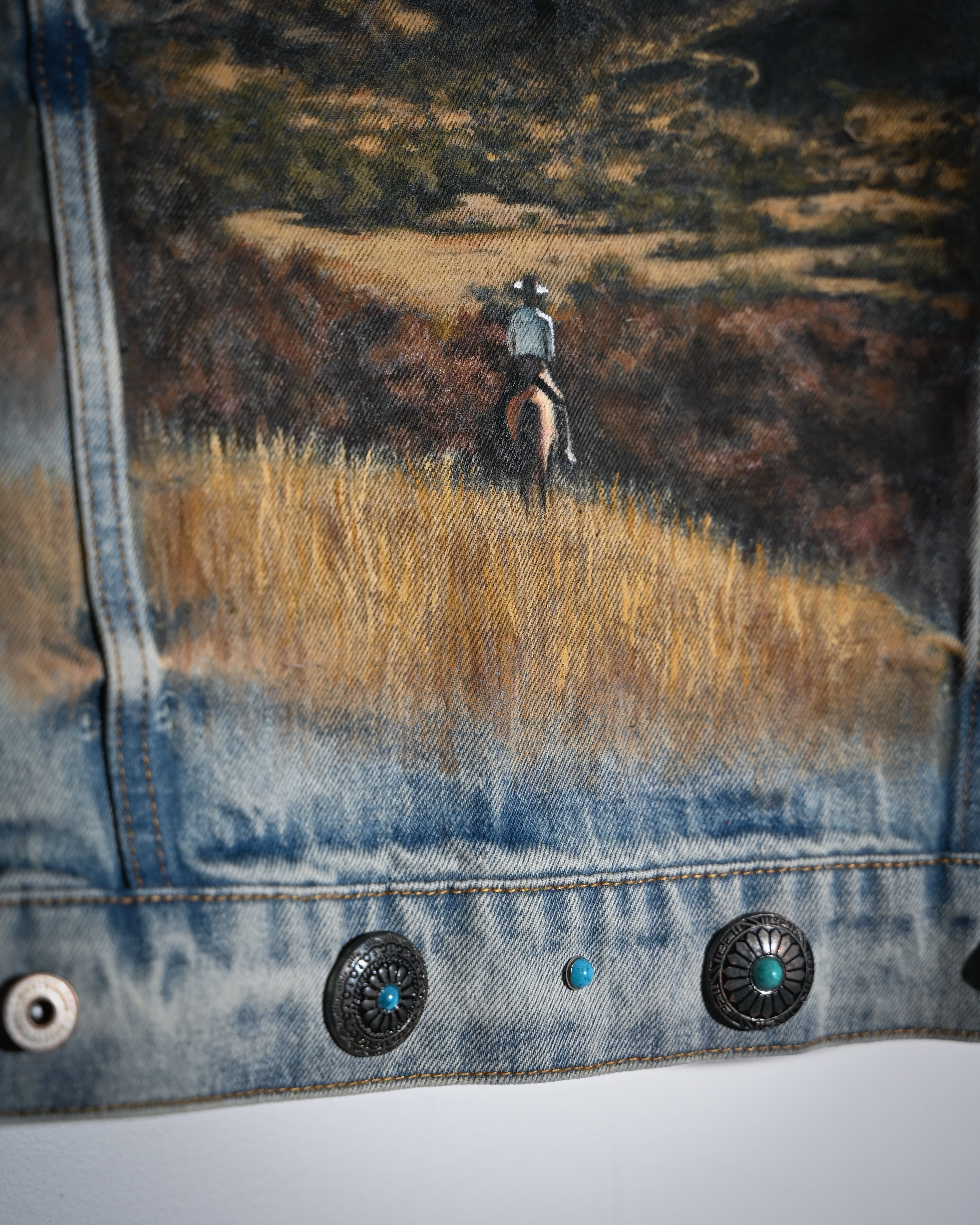 This hand-painted denim jacket captures a familiar take on the "Western" lifestyle. The back features a detailed landscape.. open fields, sharp mountains, and a rider who's alone, moving through the scene. It is quiet, expansive, and intentionally grounded in the realism of the West.