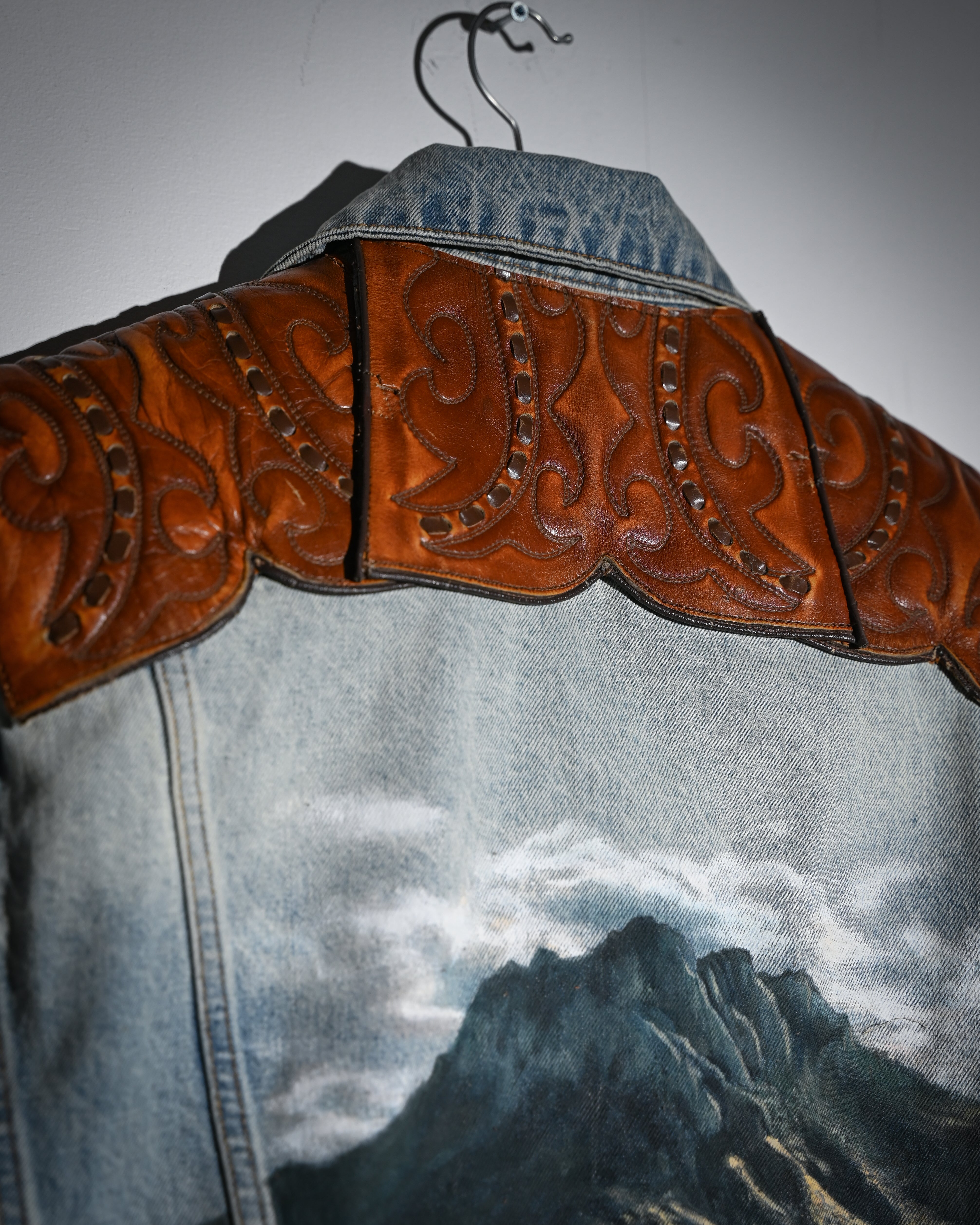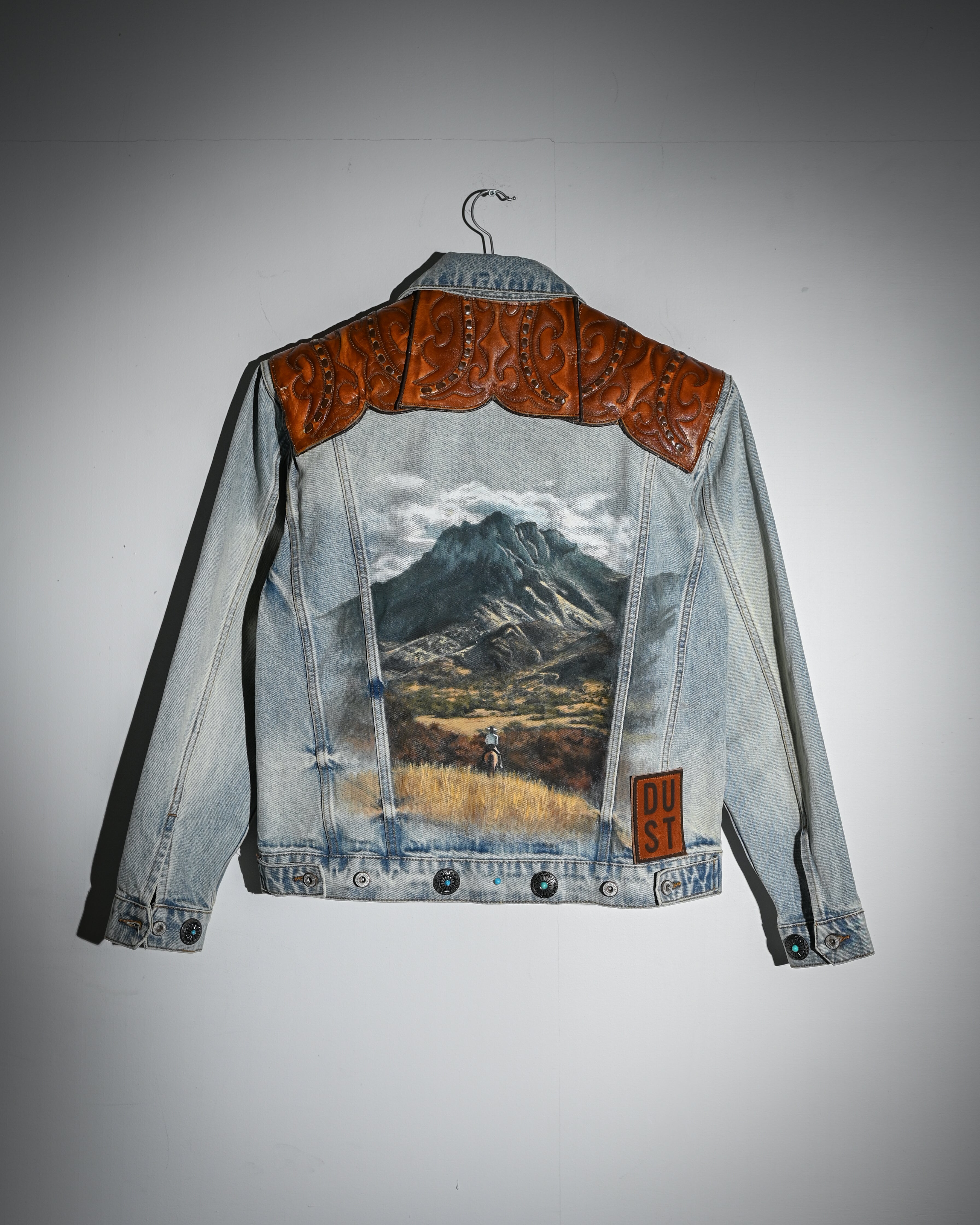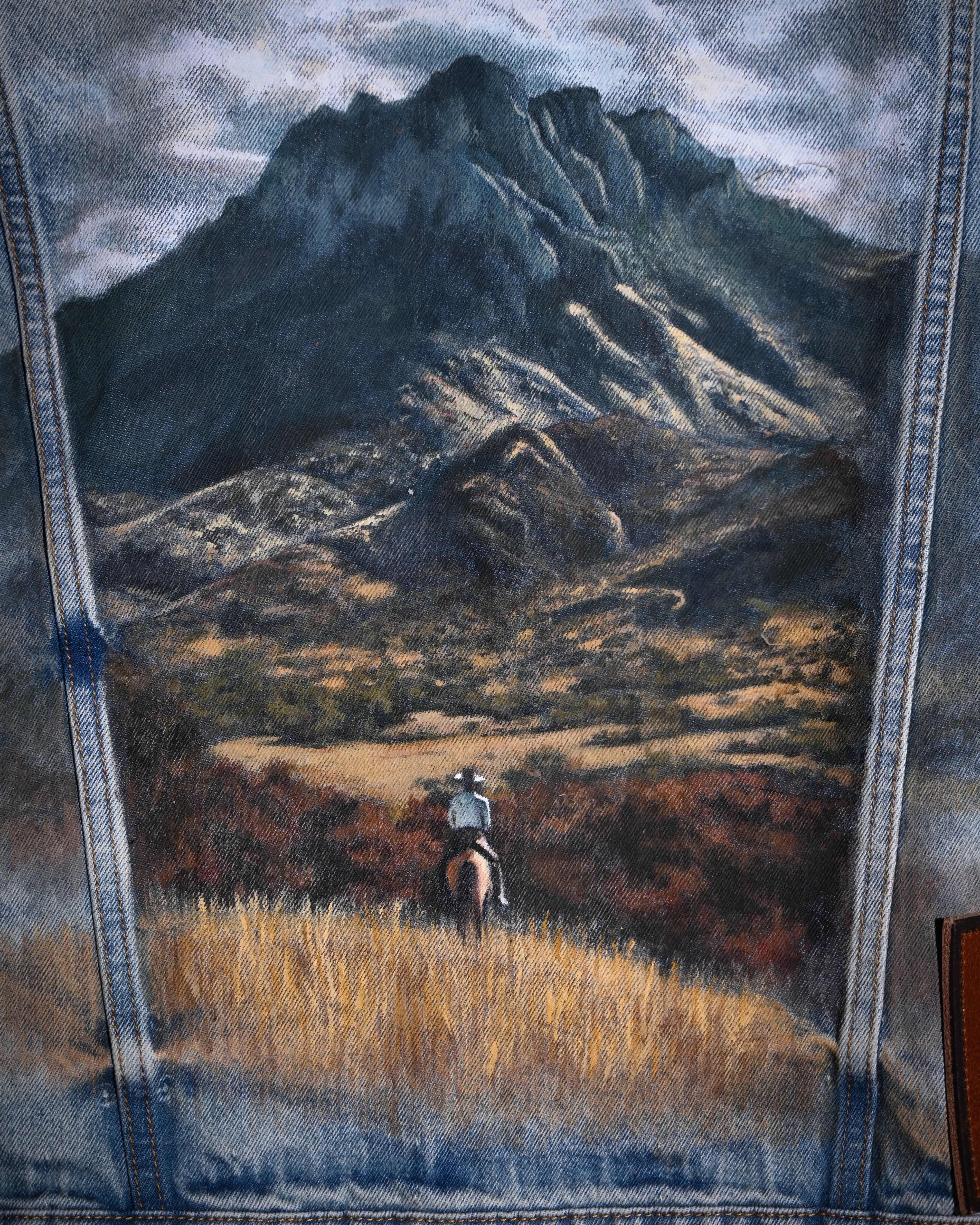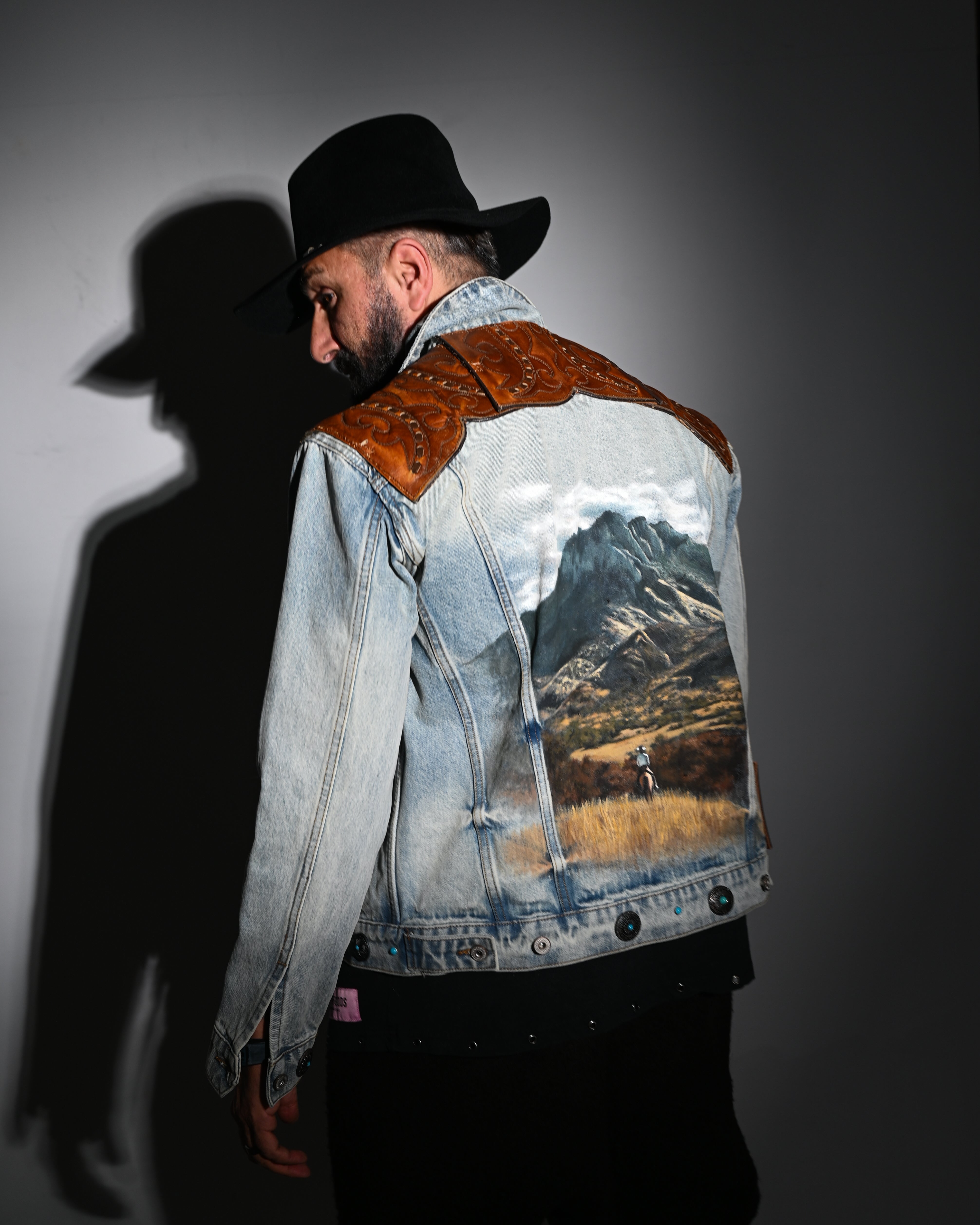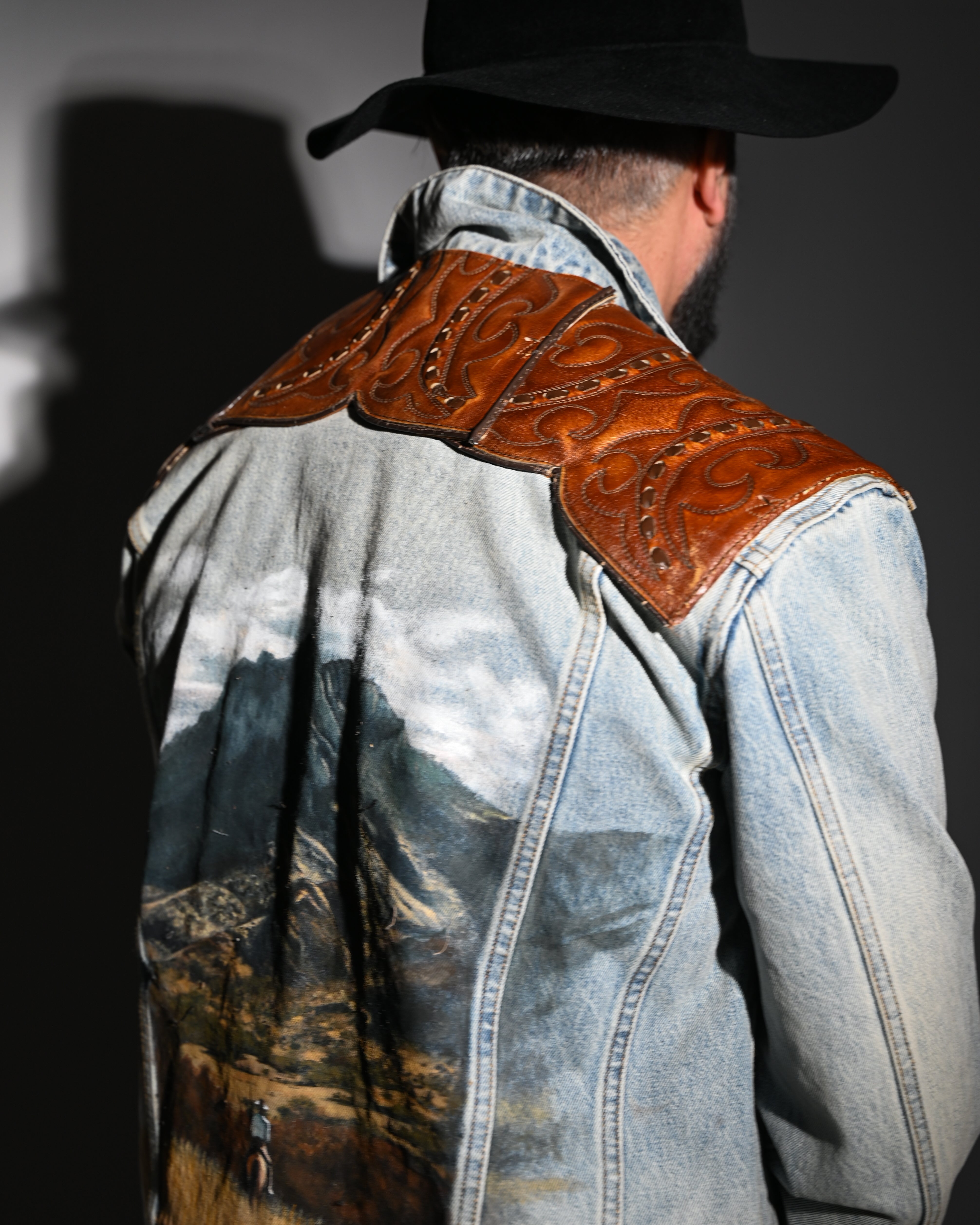 This hand-painted denim jacket captures a familiar take on the "Western" lifestyle. The back features a detailed landscape.. open fields, sharp mountains, and a rider who's alone, moving through the scene. It is quiet, expansive, and intentionally grounded in the realism of the West.