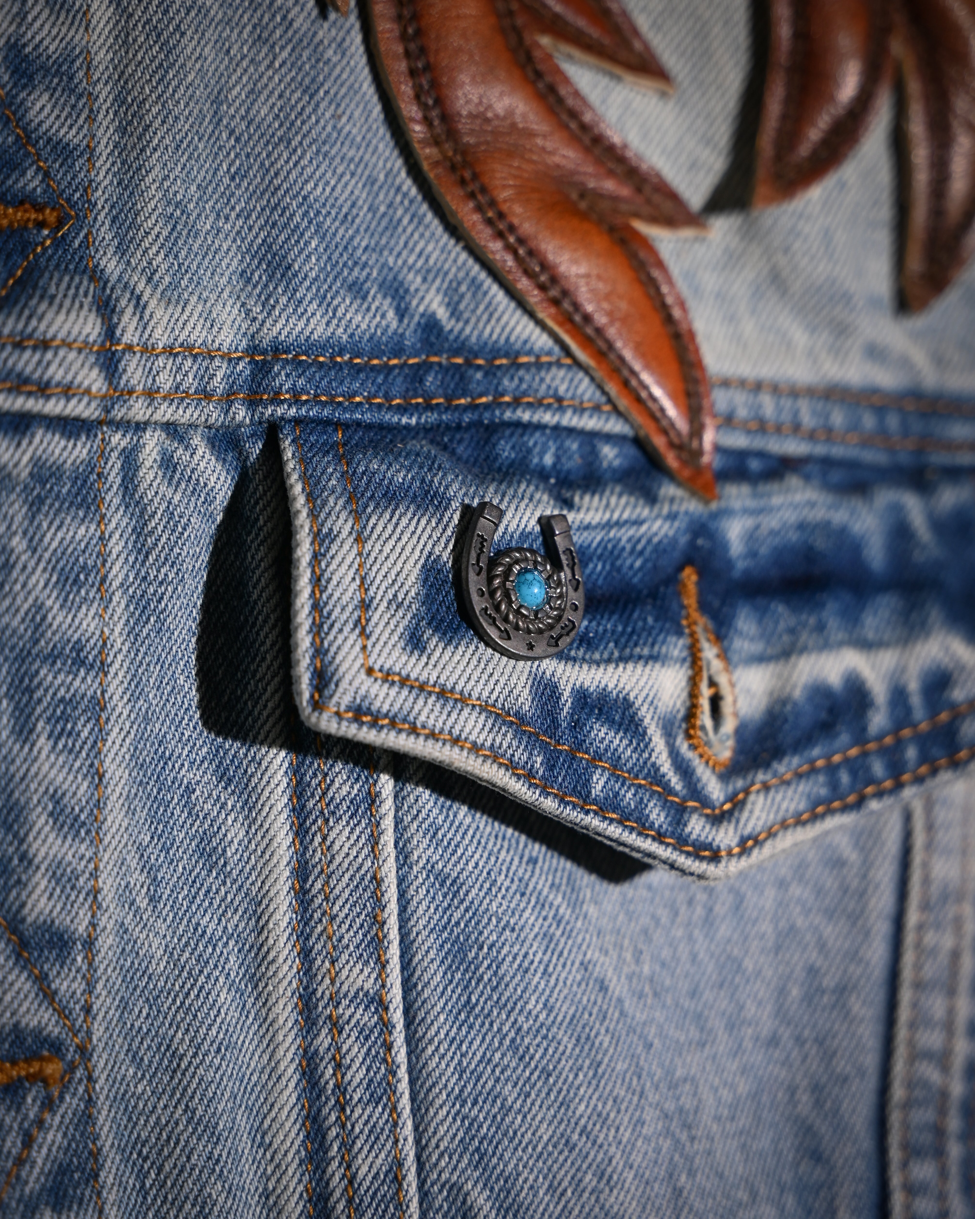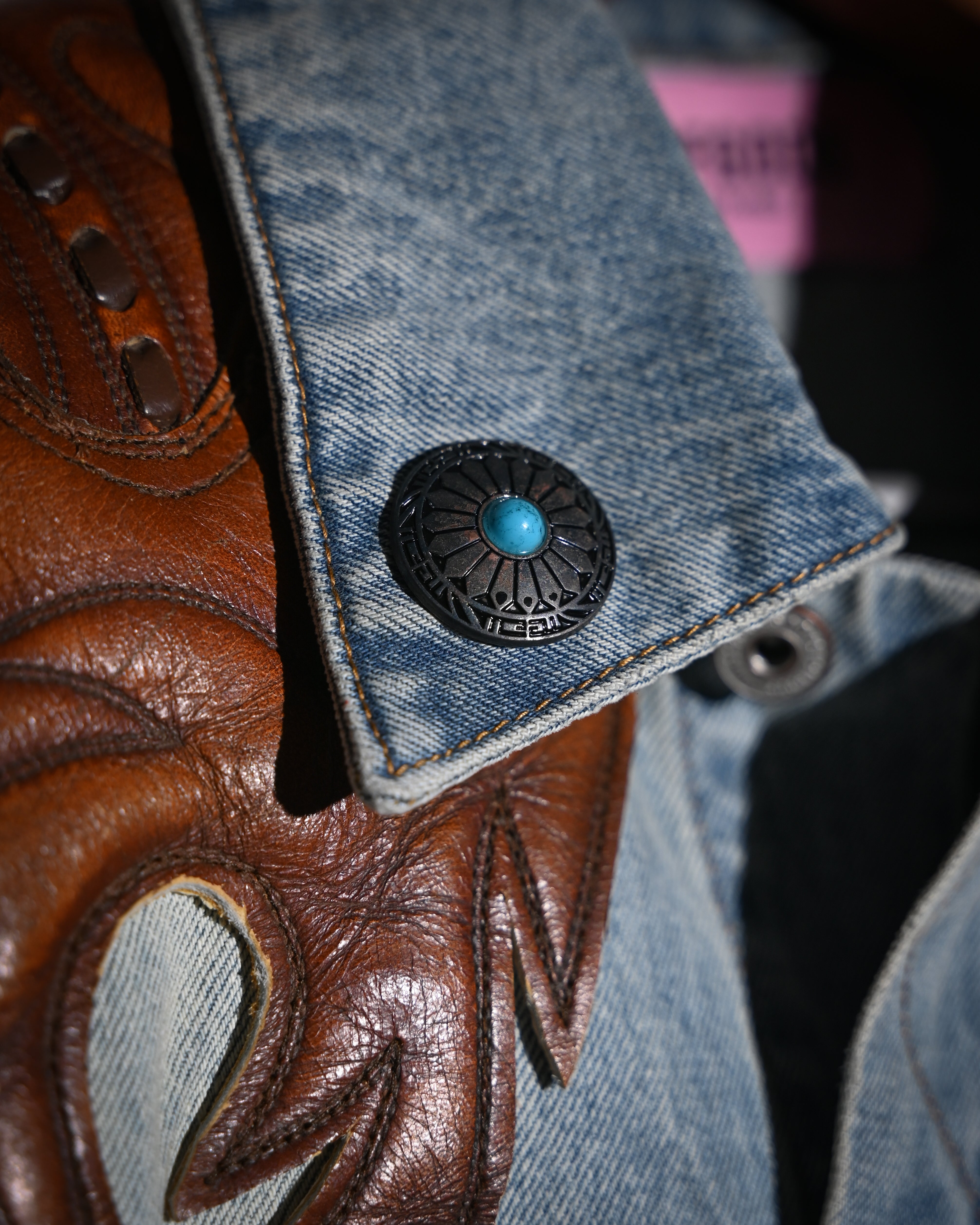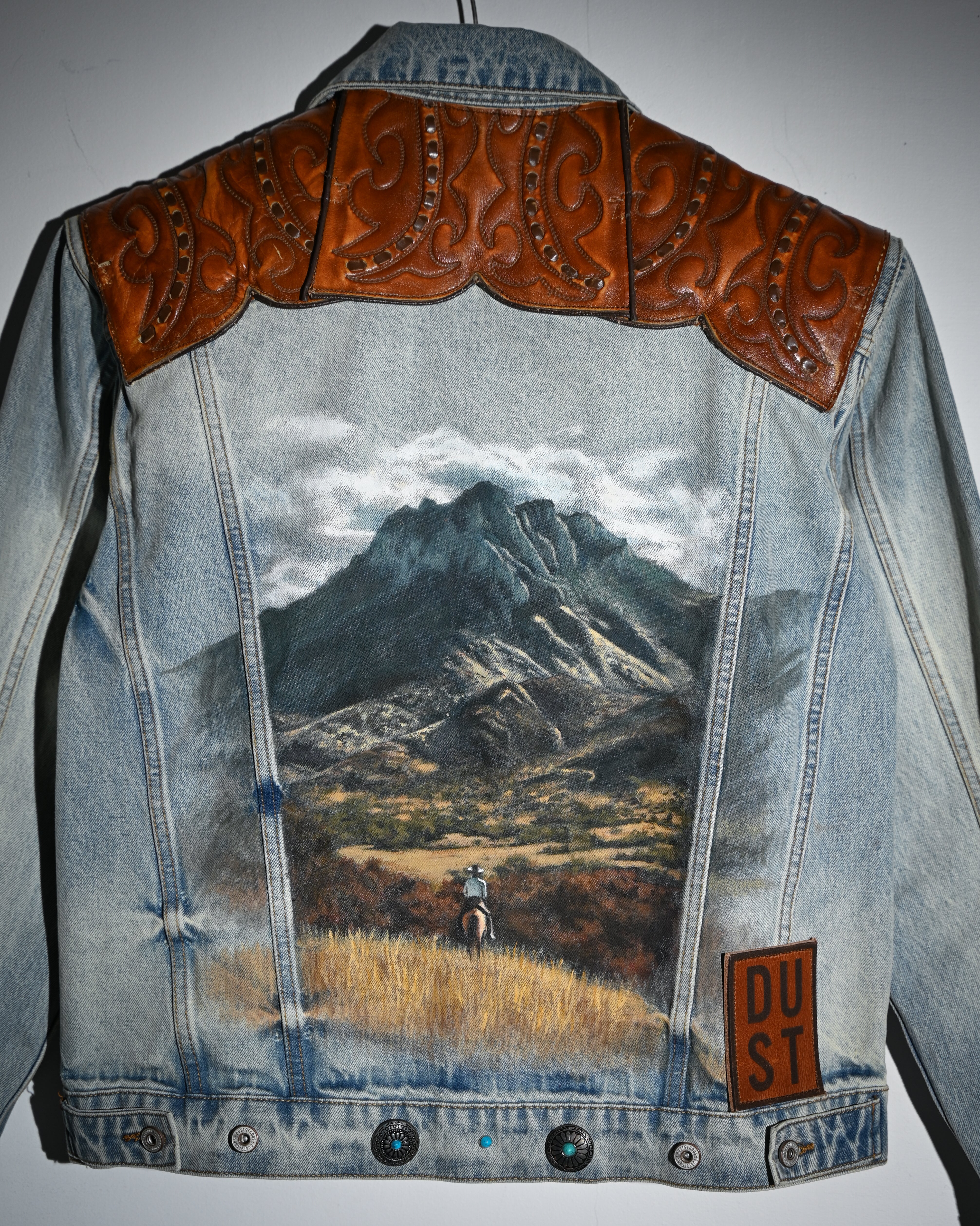 Custom turquoise accents and concho-inspired detailing are placed along the hem and sleeves for subtle contrast, while a DUST leather tab anchors the piece.