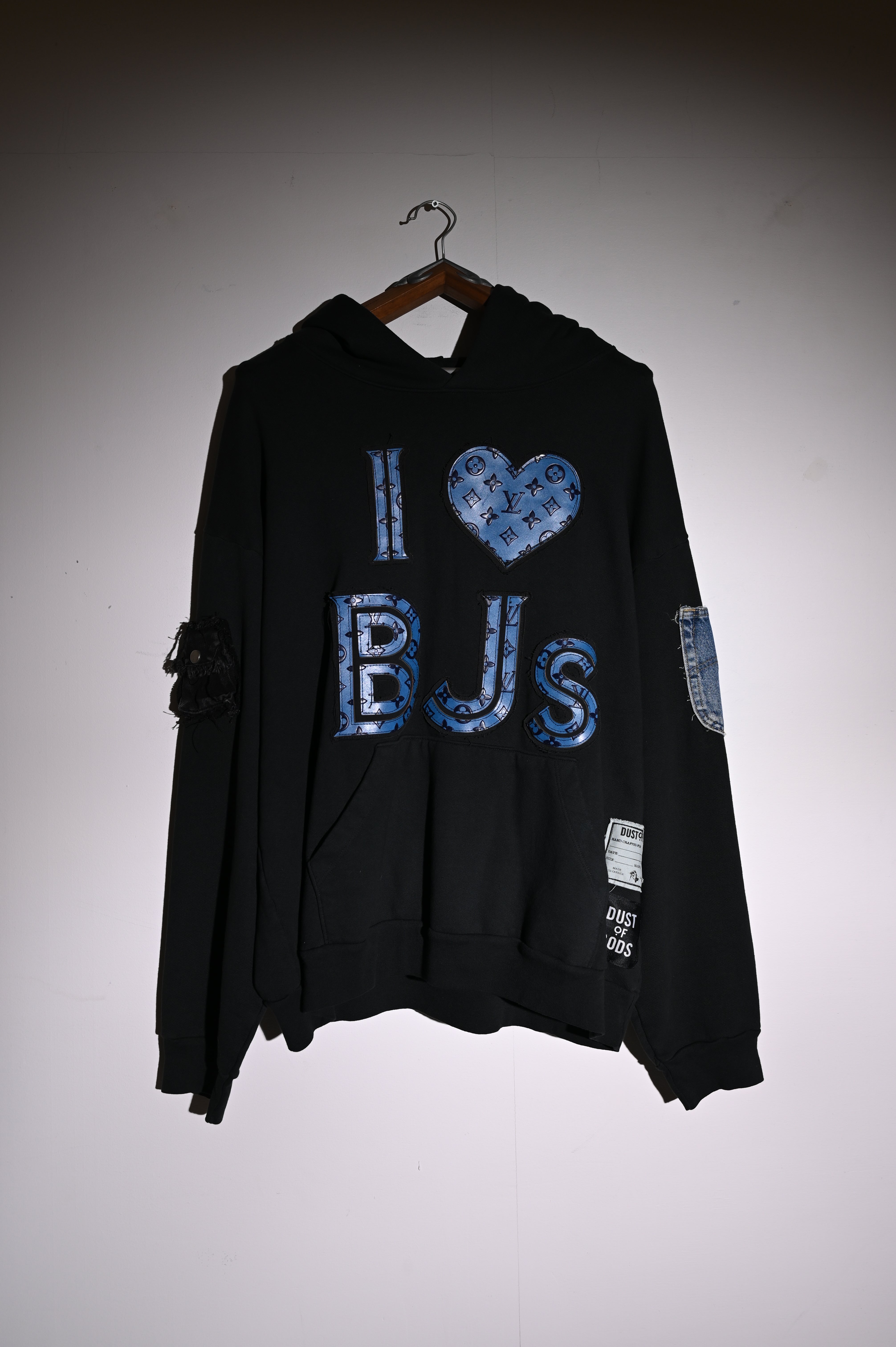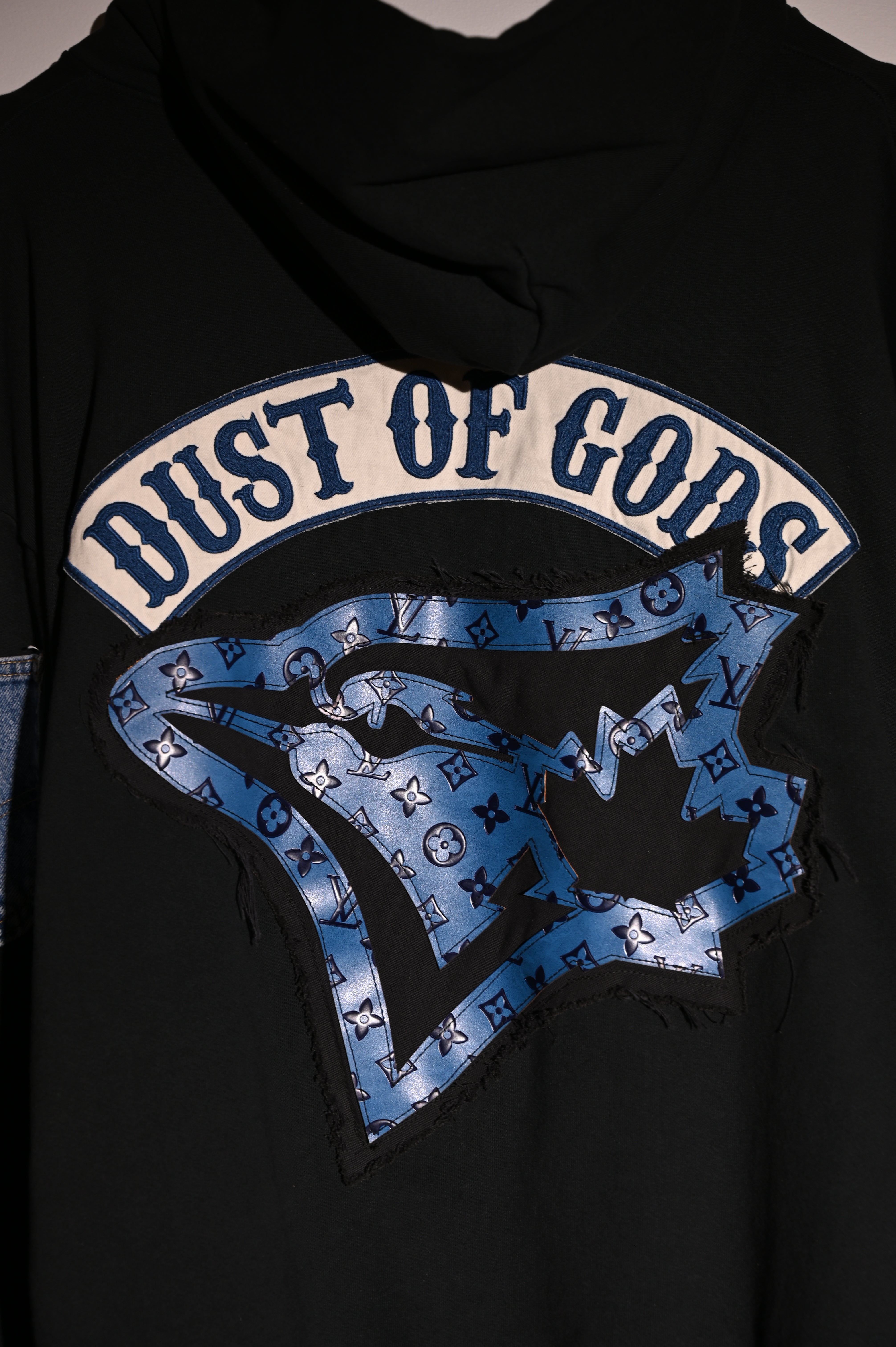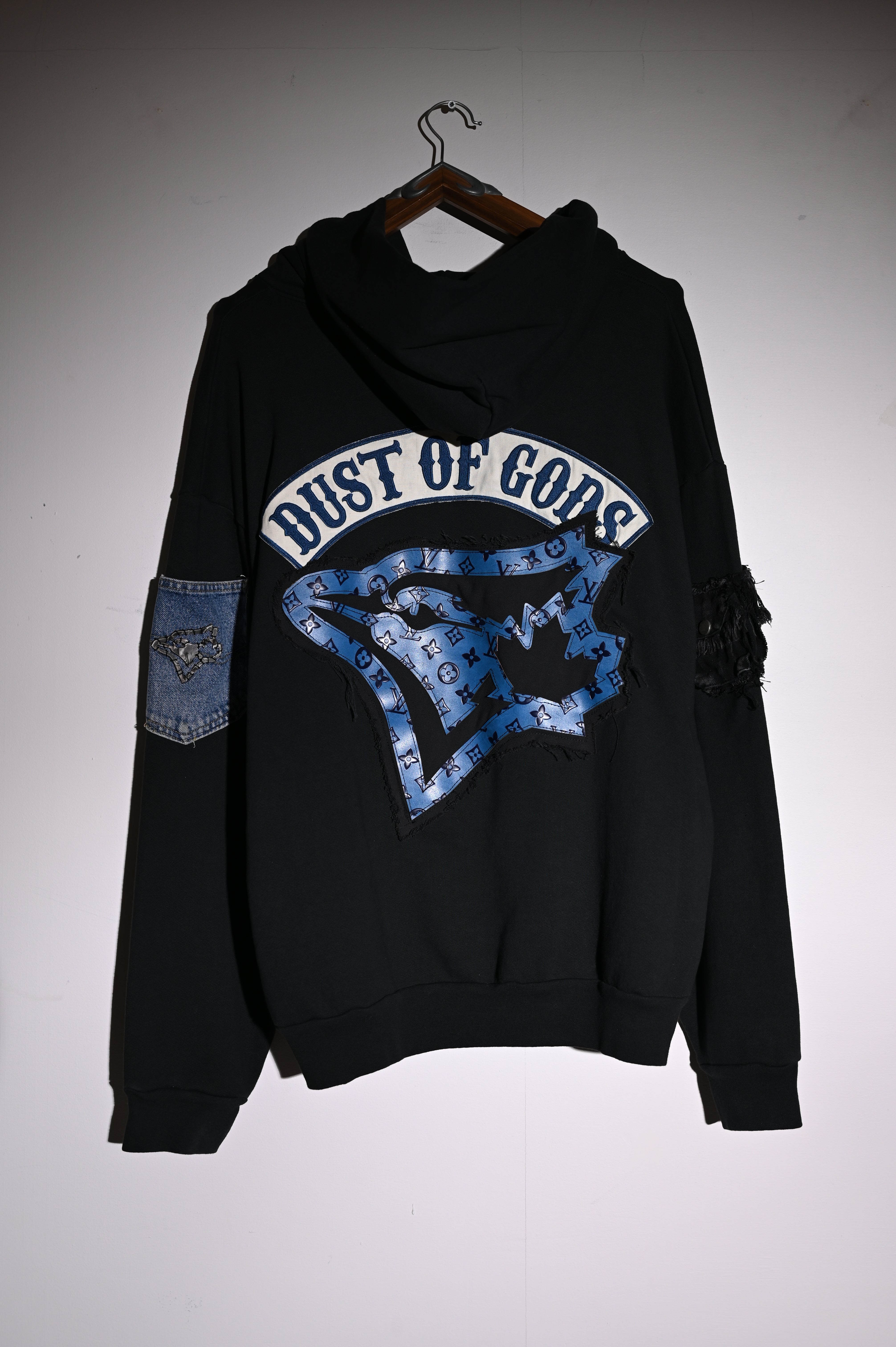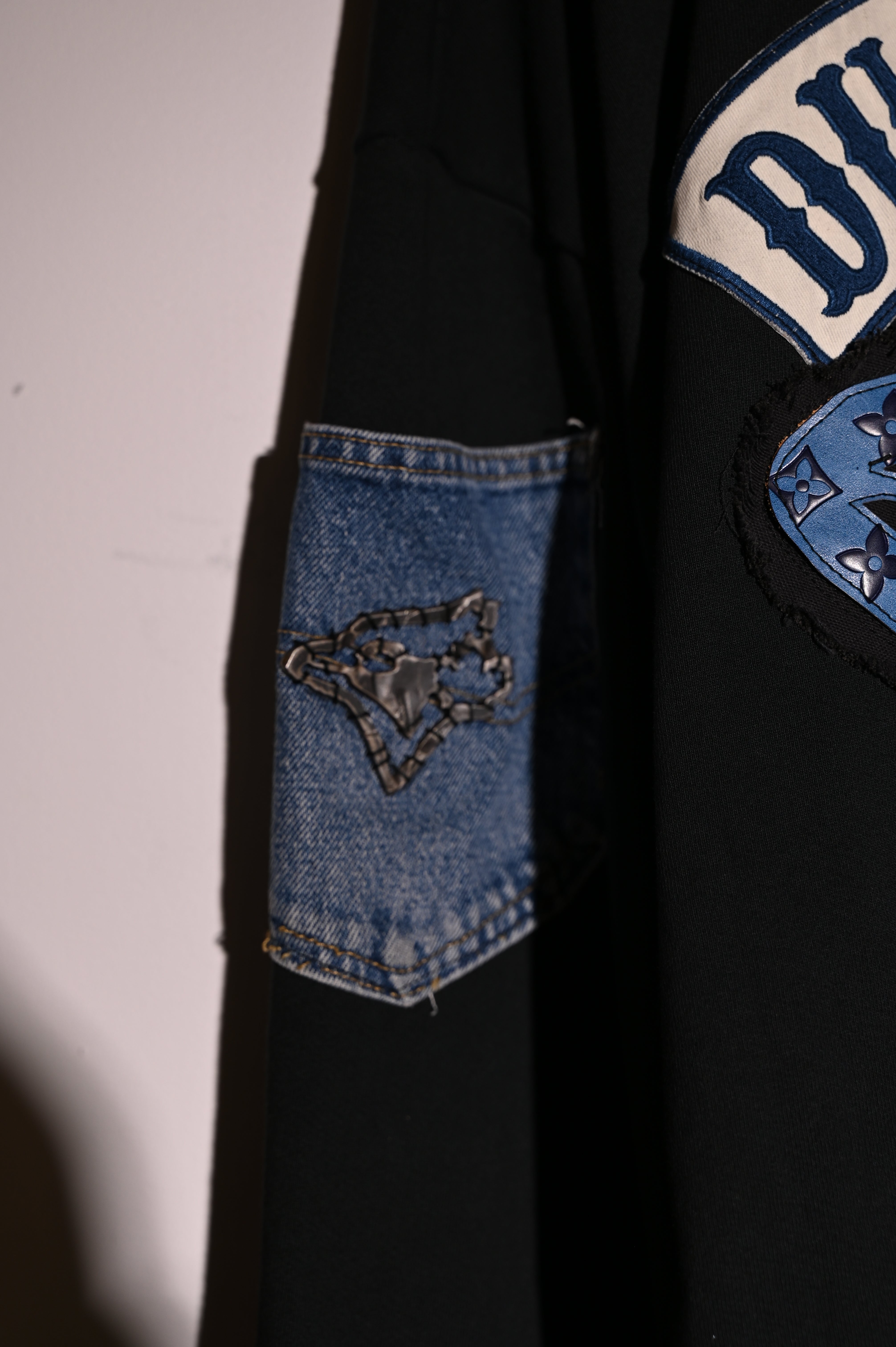 1 Of 1 Black Hoodie, Upcycled Fabric, Metal Emblem, Deconstructed Patches