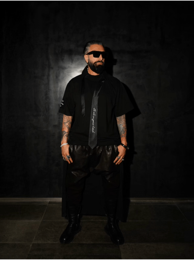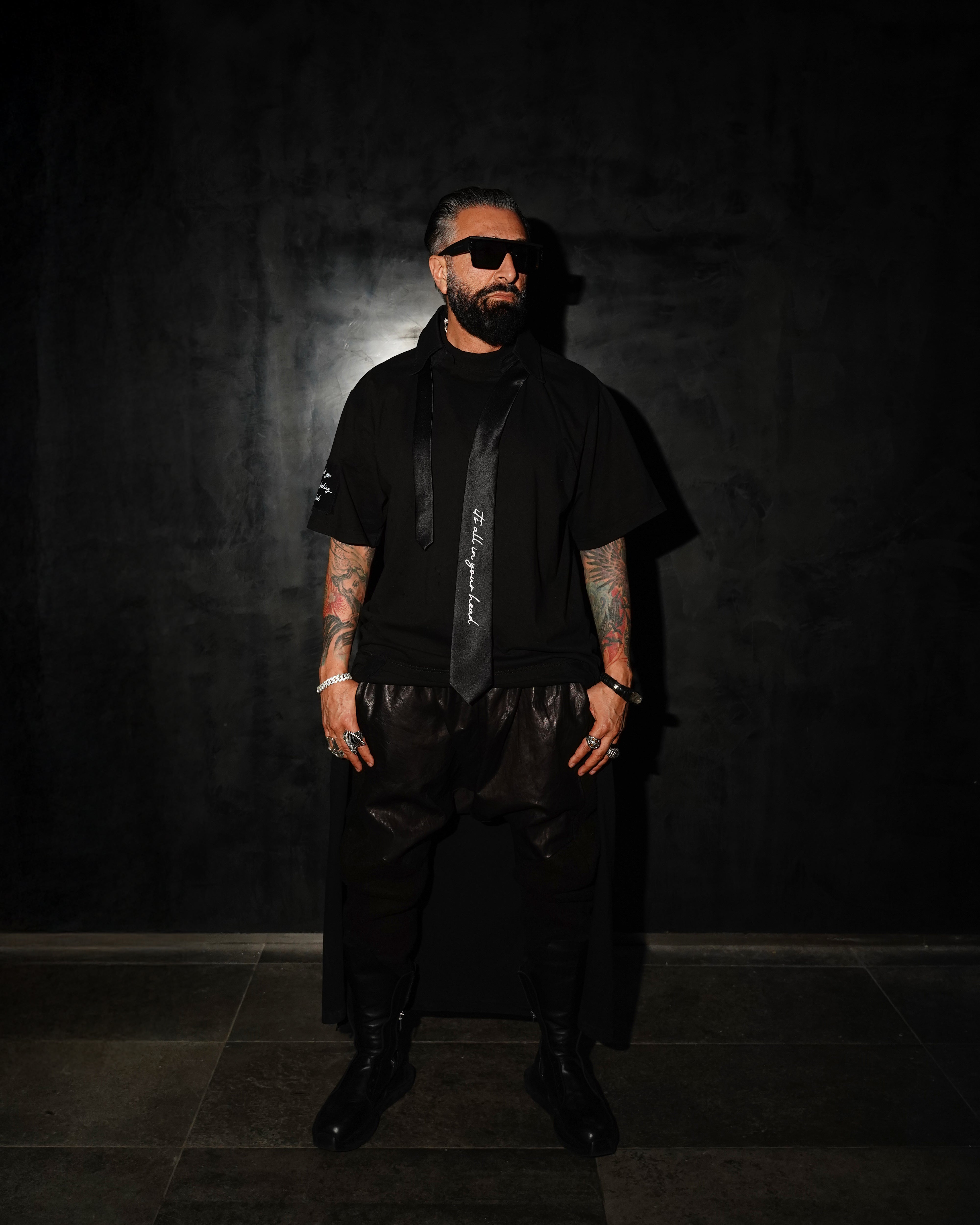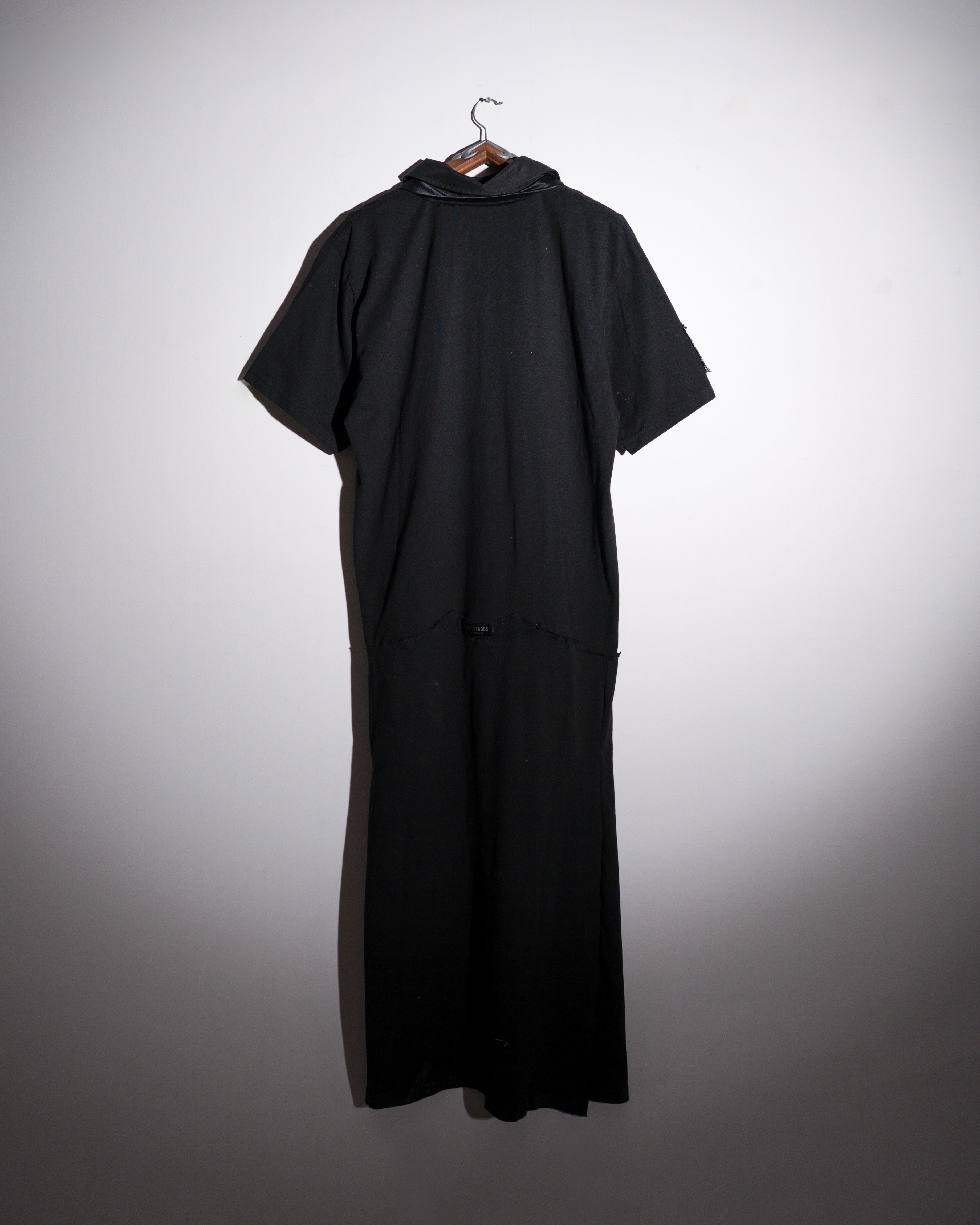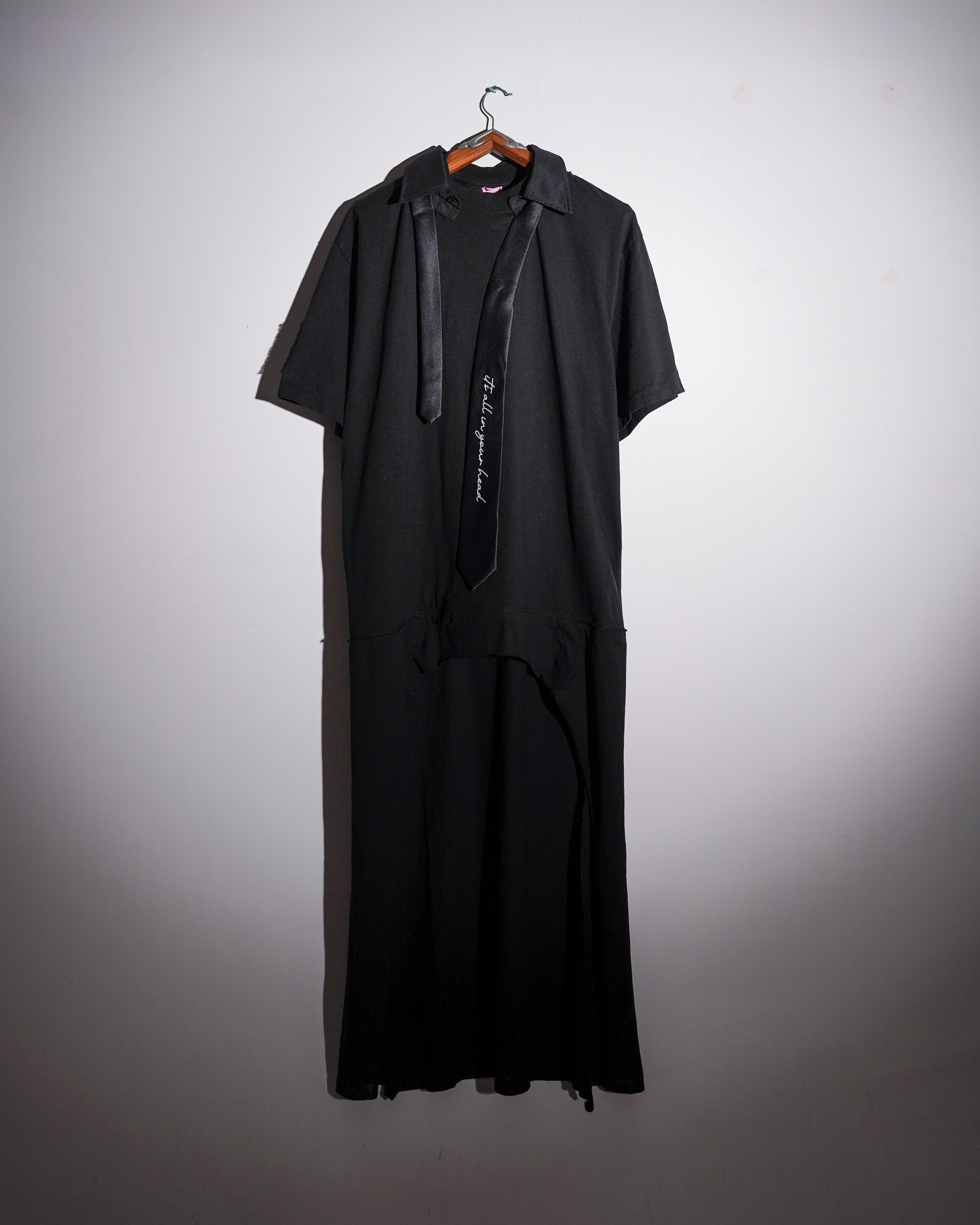 Extended Black T-Shirt. Embedded Necktie. Neck Collar. "It's All In Your Head" Graphic embellishment.