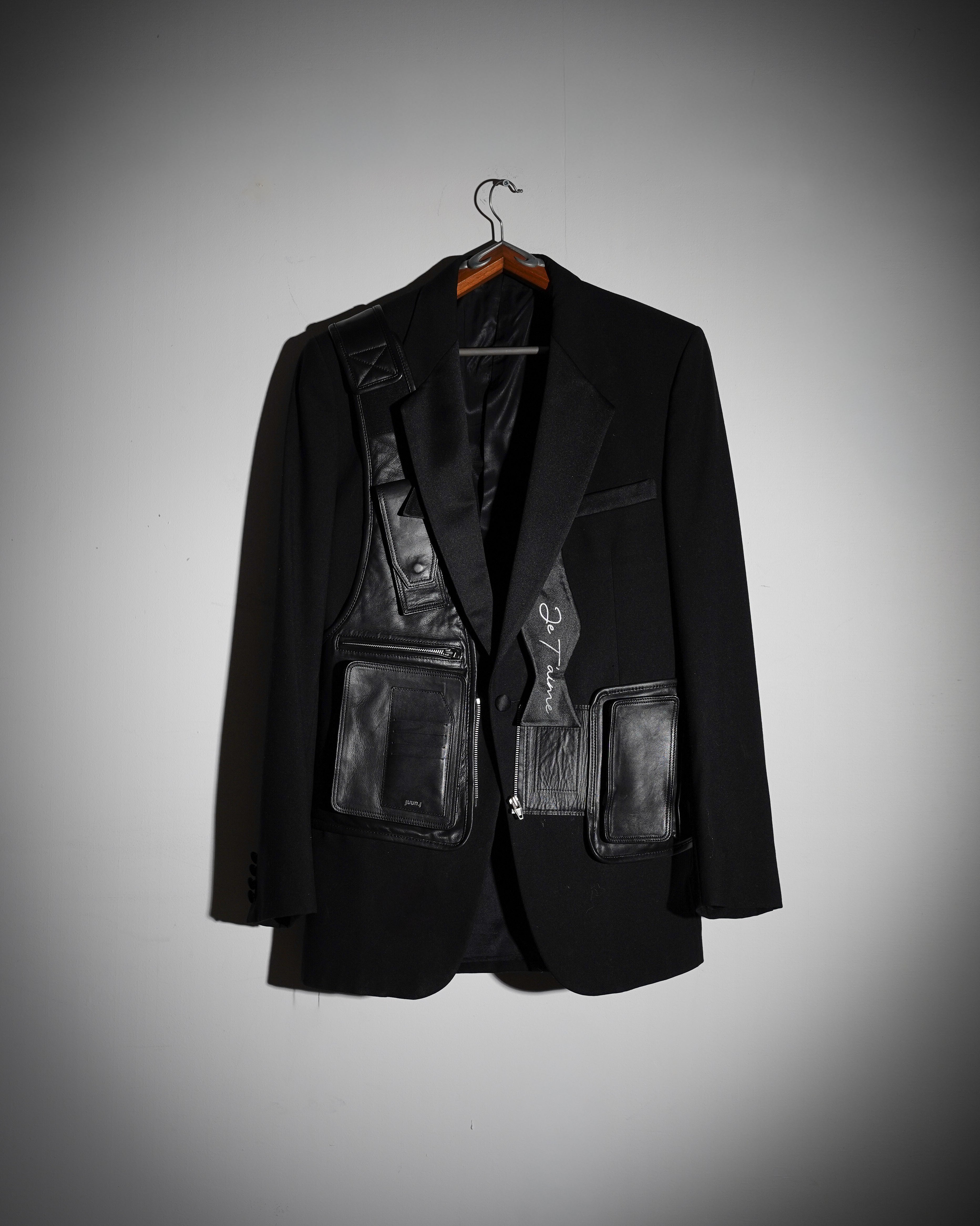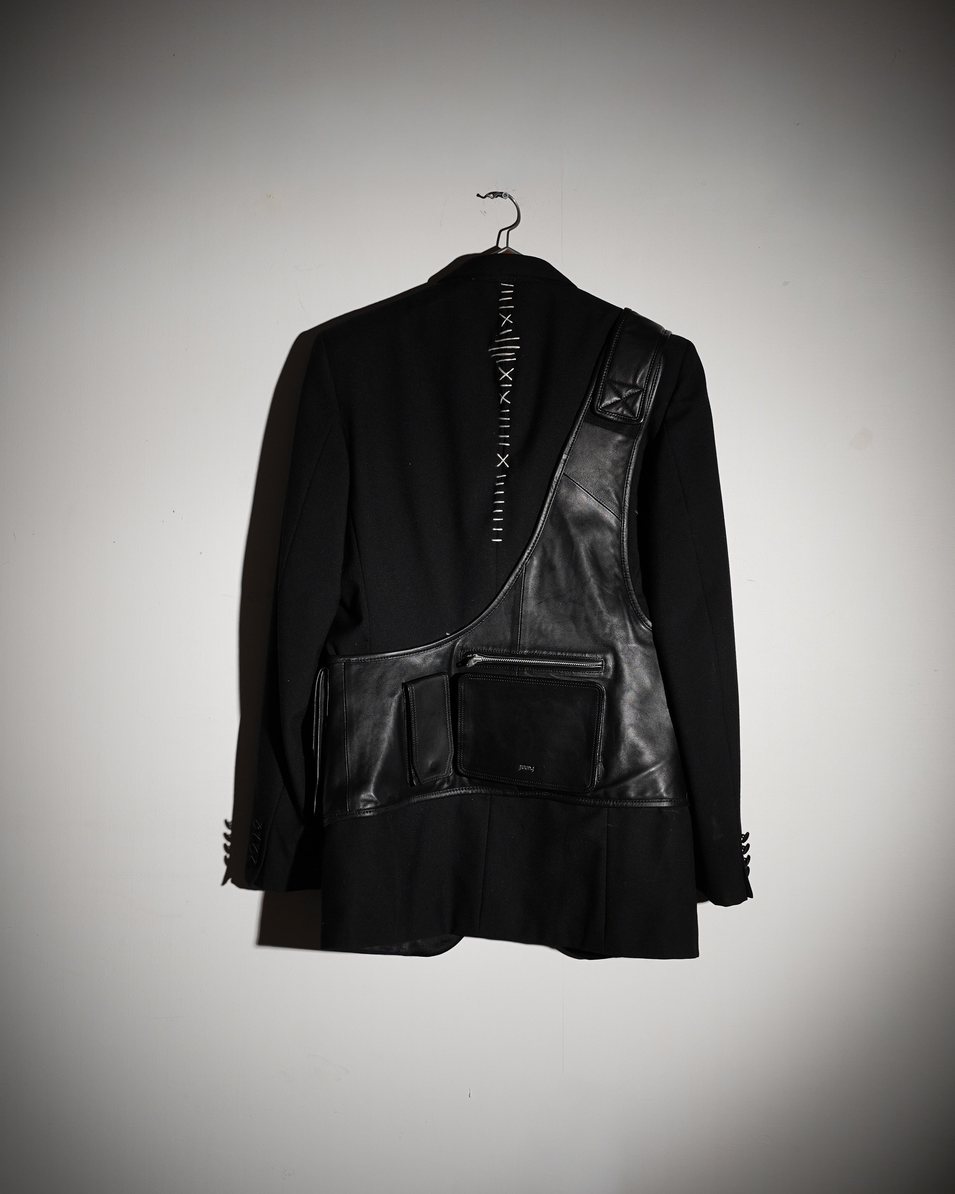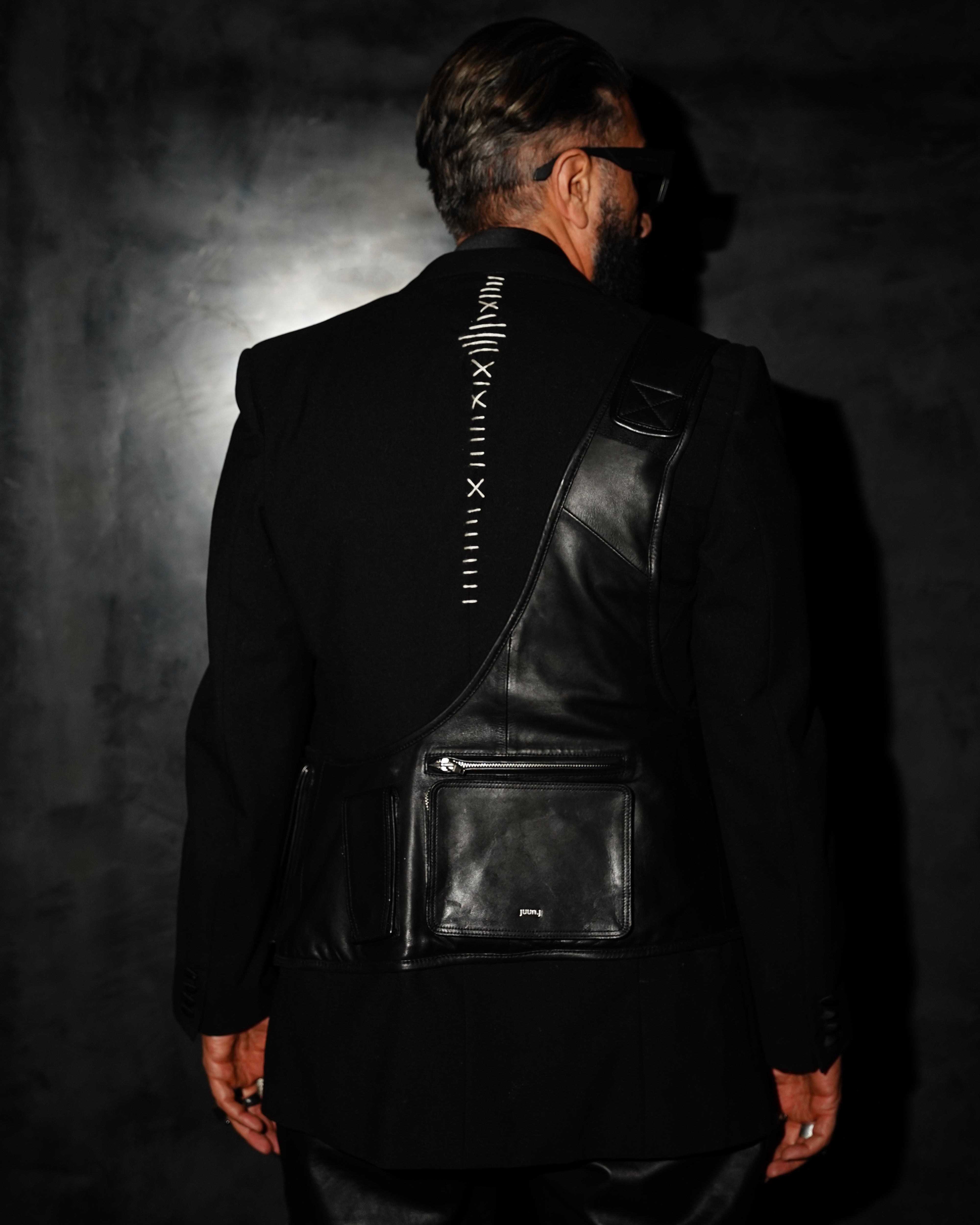 1-OF-1. M/L. Black Blazer, Embroidery Details, Upcycled Leather Pocket Detail.