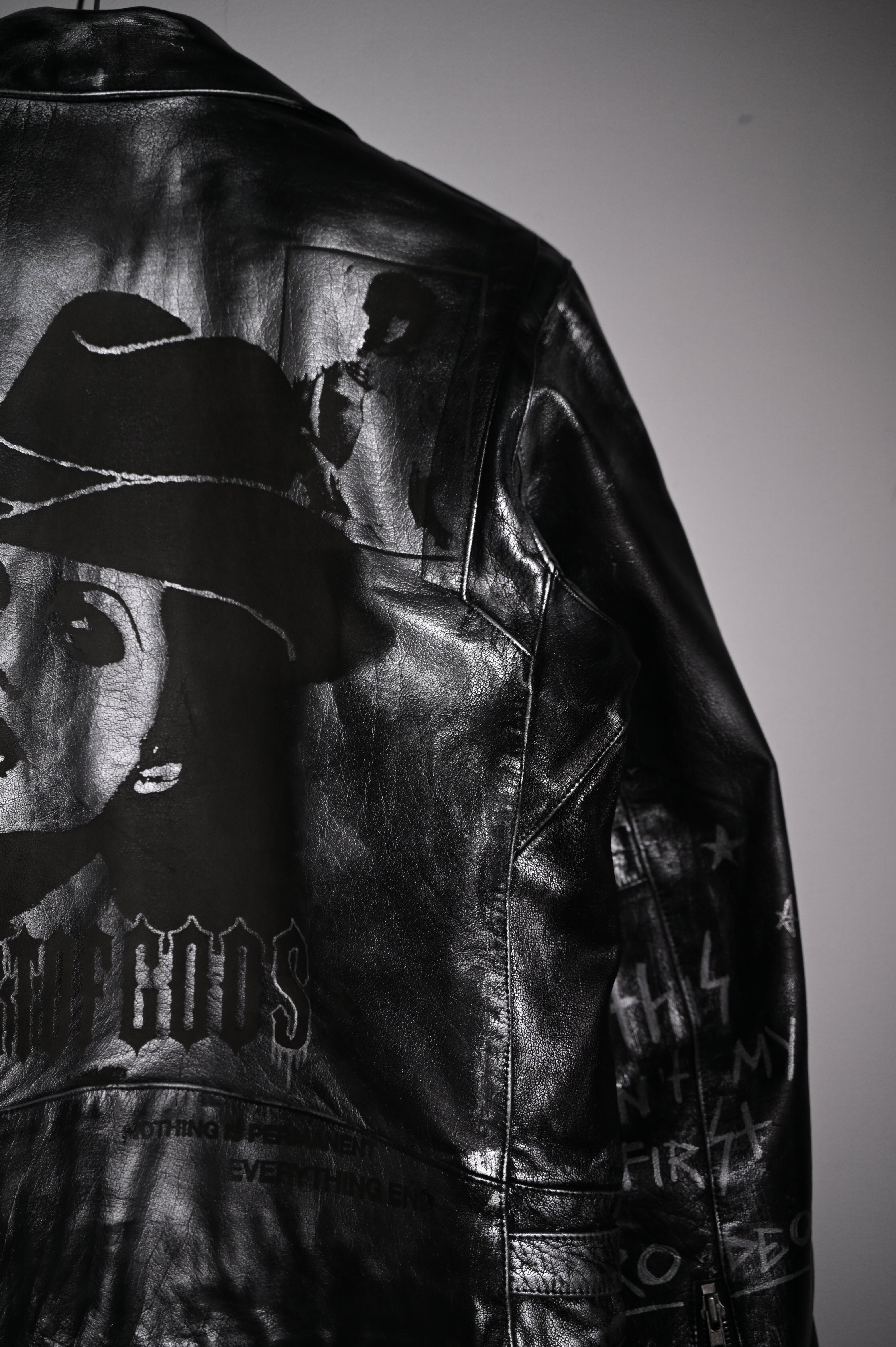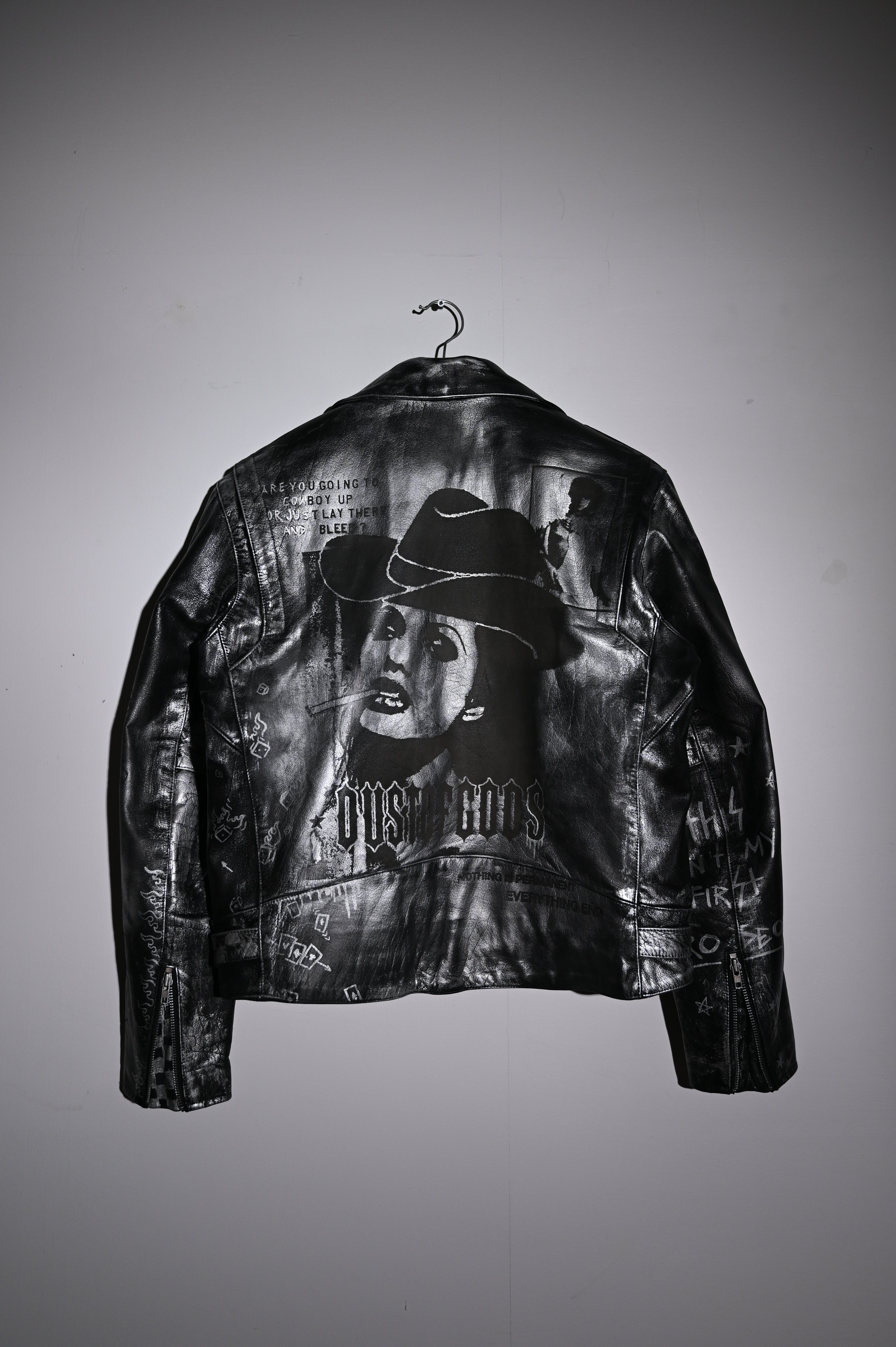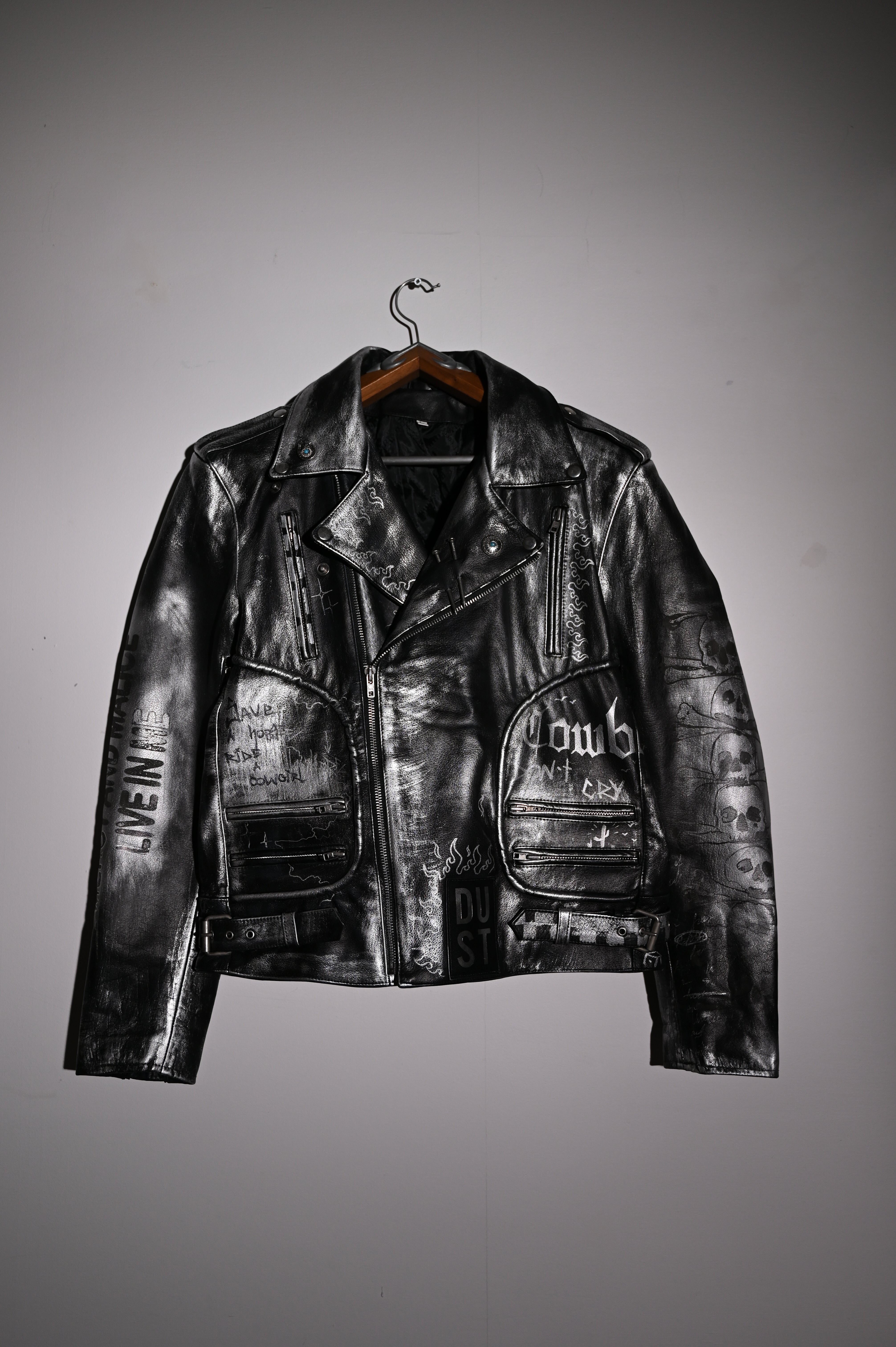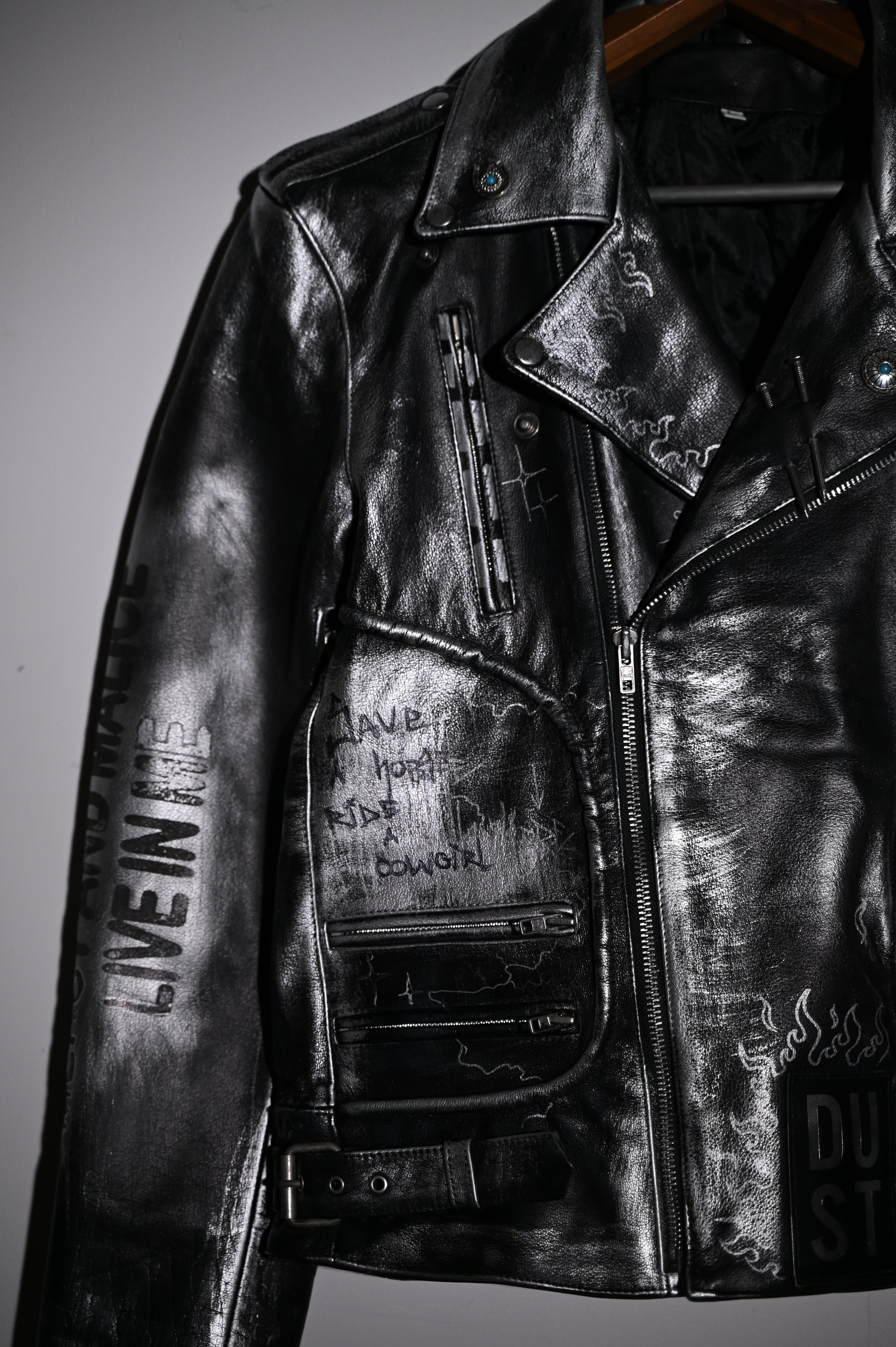 Built on the DOG Biker Jacket, this piece carries painted graphics, layered handwriting, and dry-brushed textures across its leather shell....