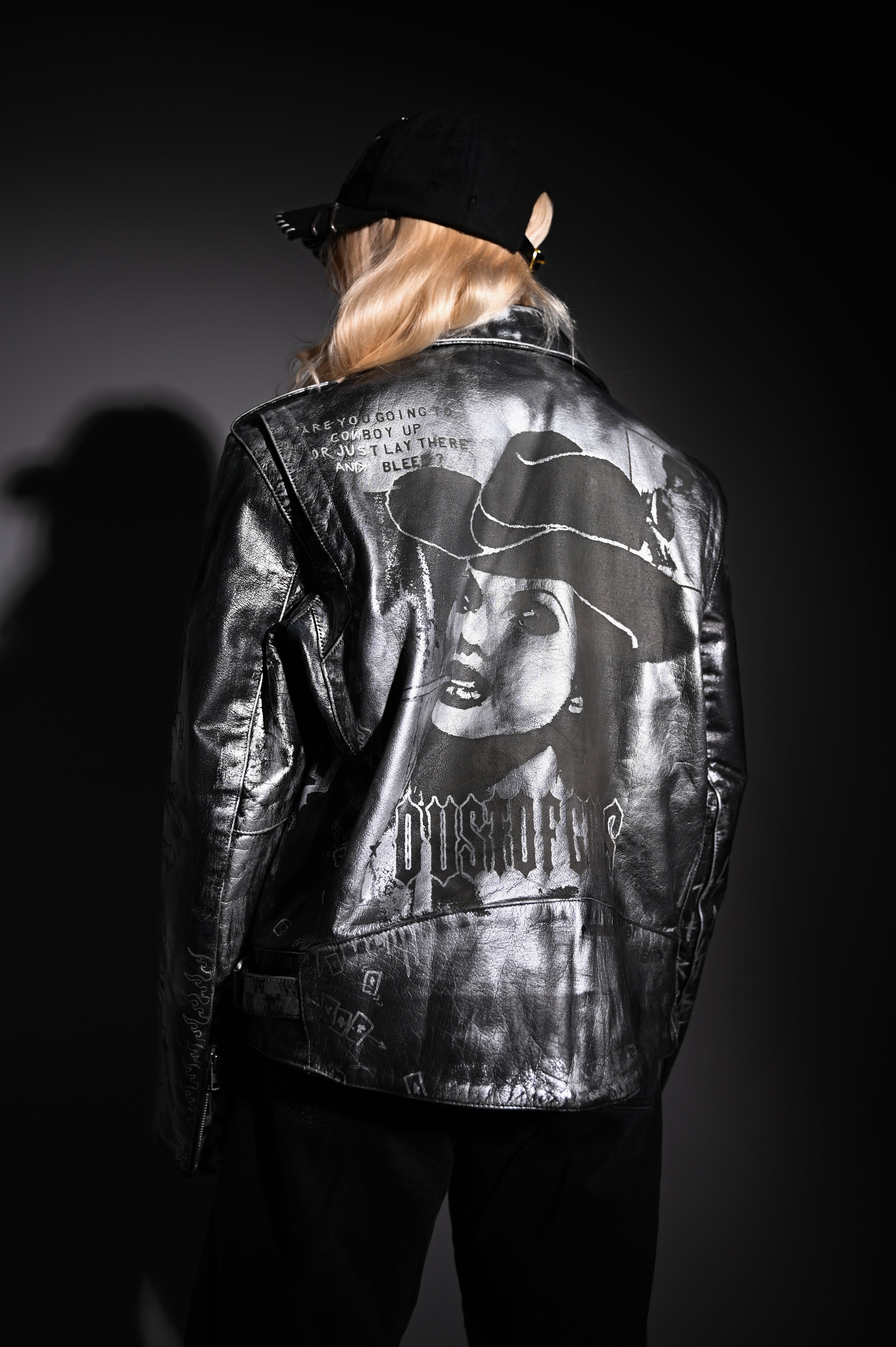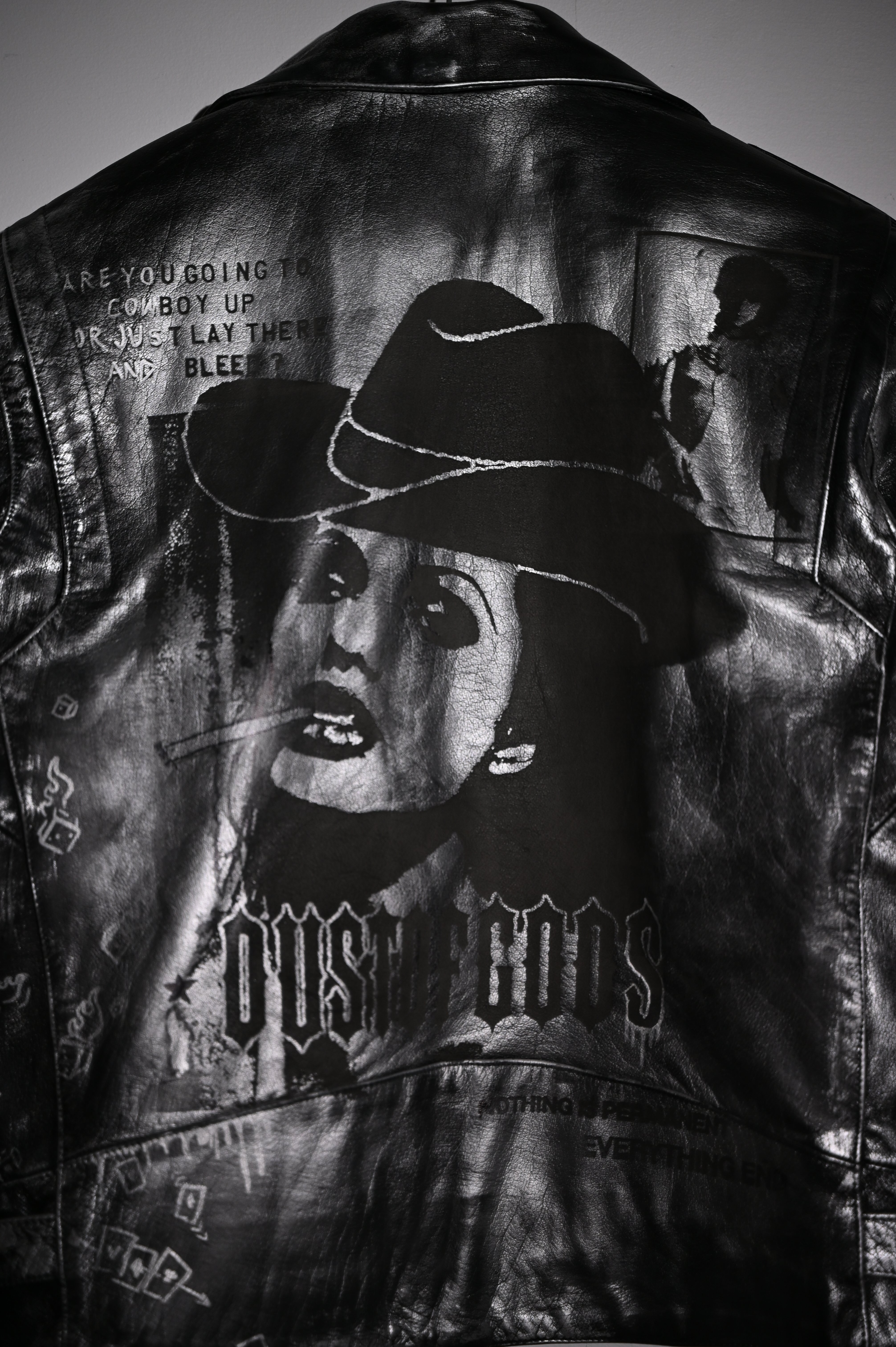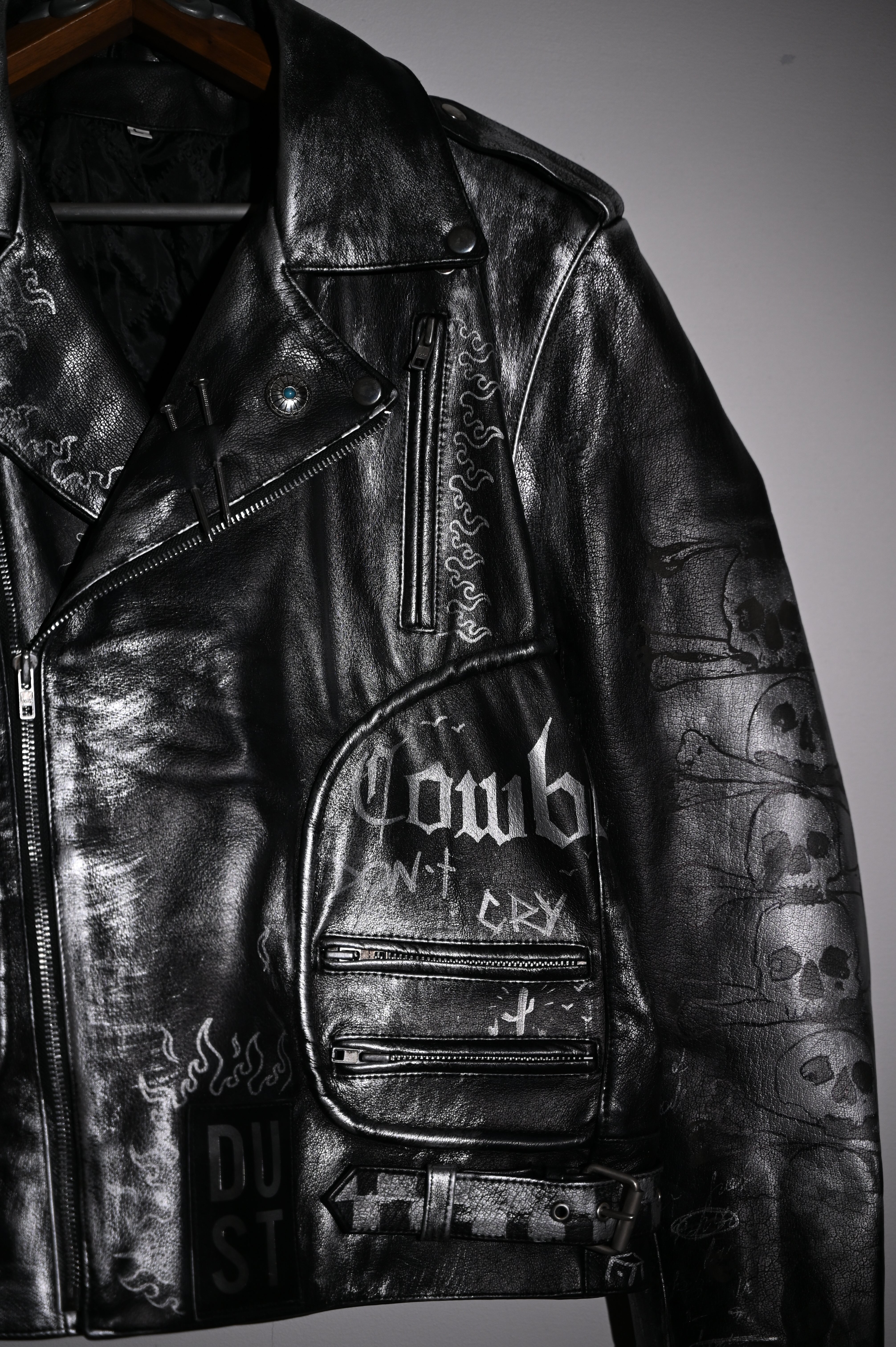 Built on the DOG Biker Jacket, this piece carries painted graphics, layered handwriting, and dry-brushed textures across its leather shell. A patinaed western heart beats through the surface, reinforced with rustic hardware, exposed wear, and a finish that feels lived-in yet defiant.