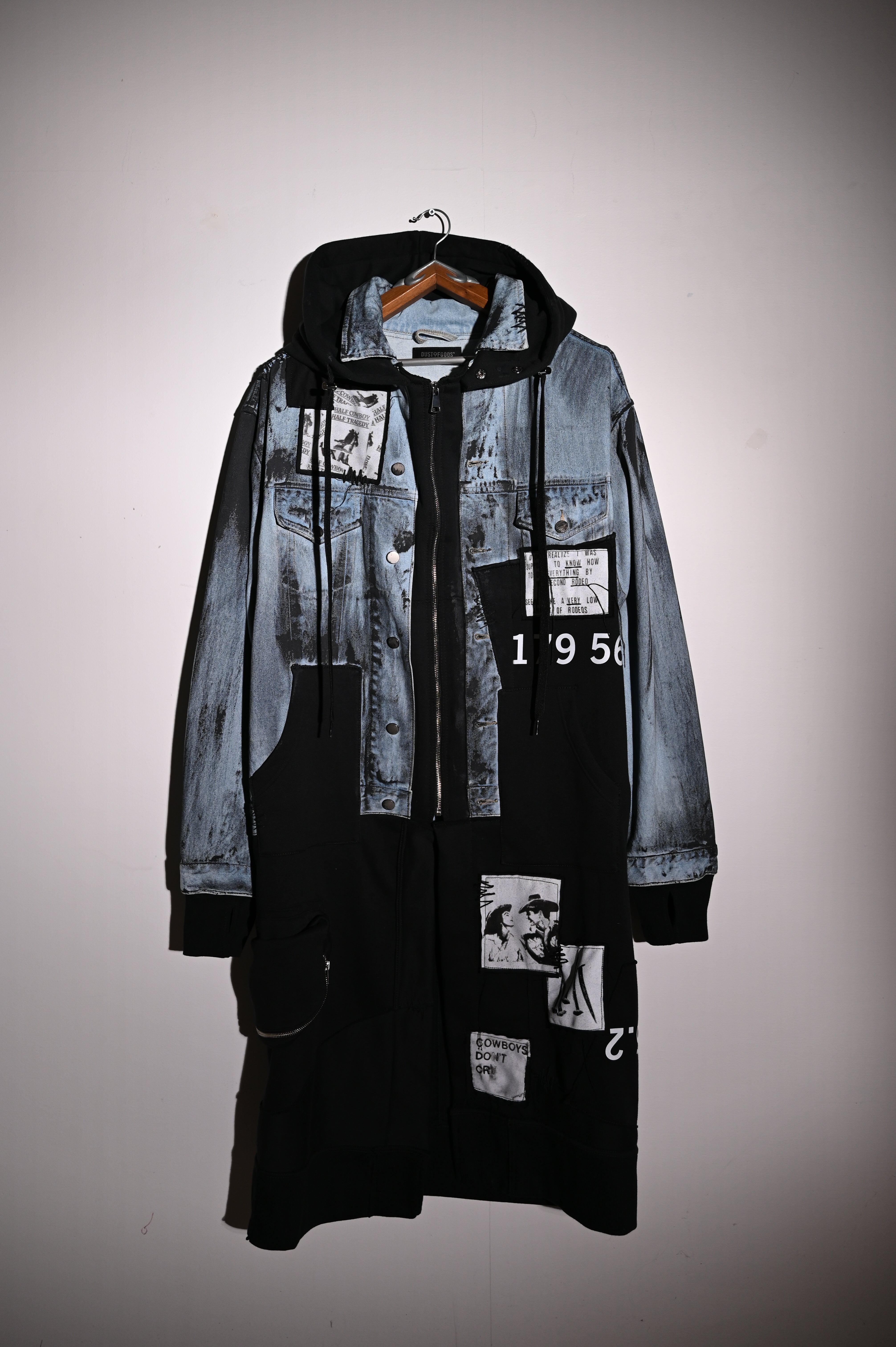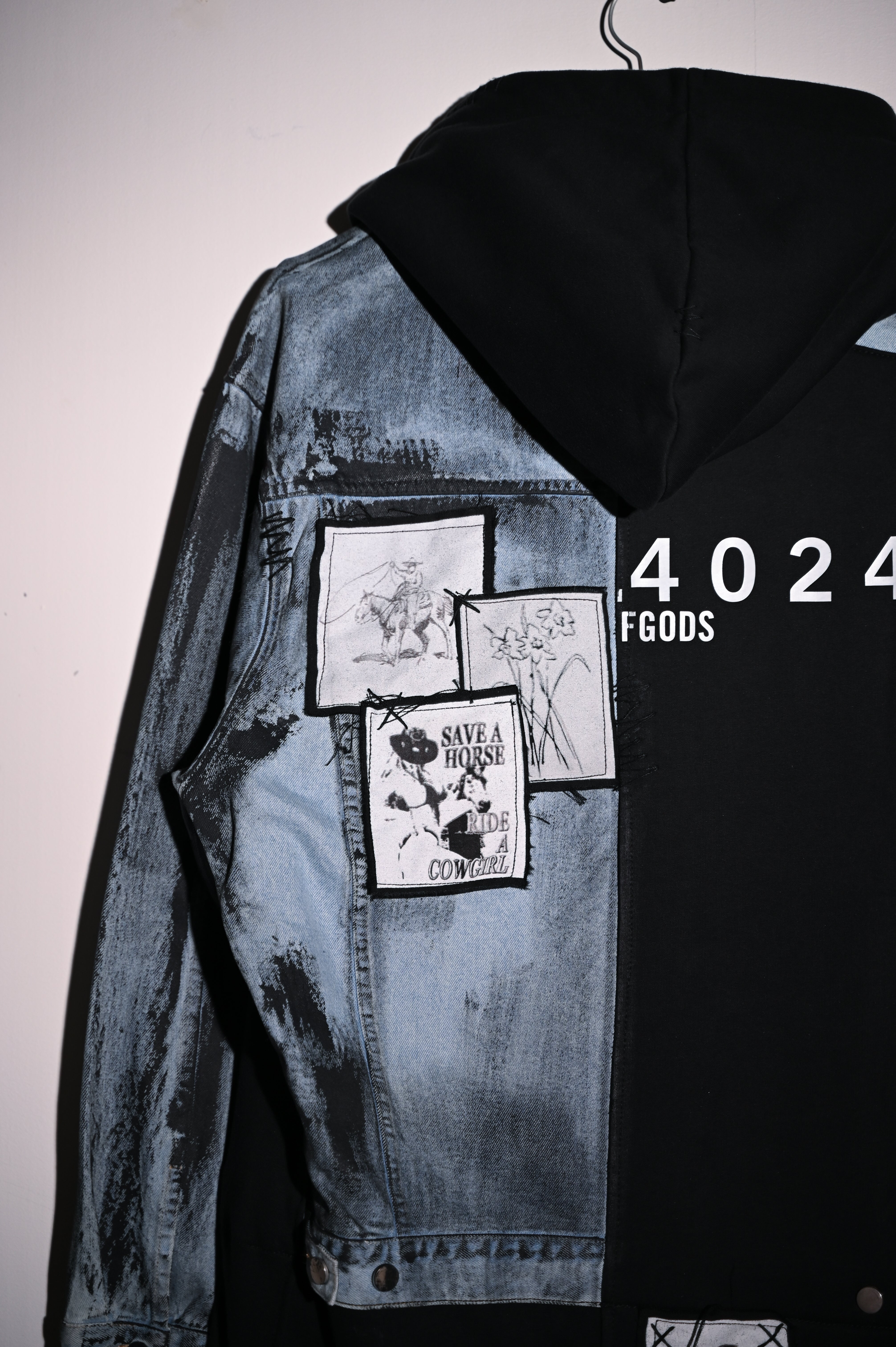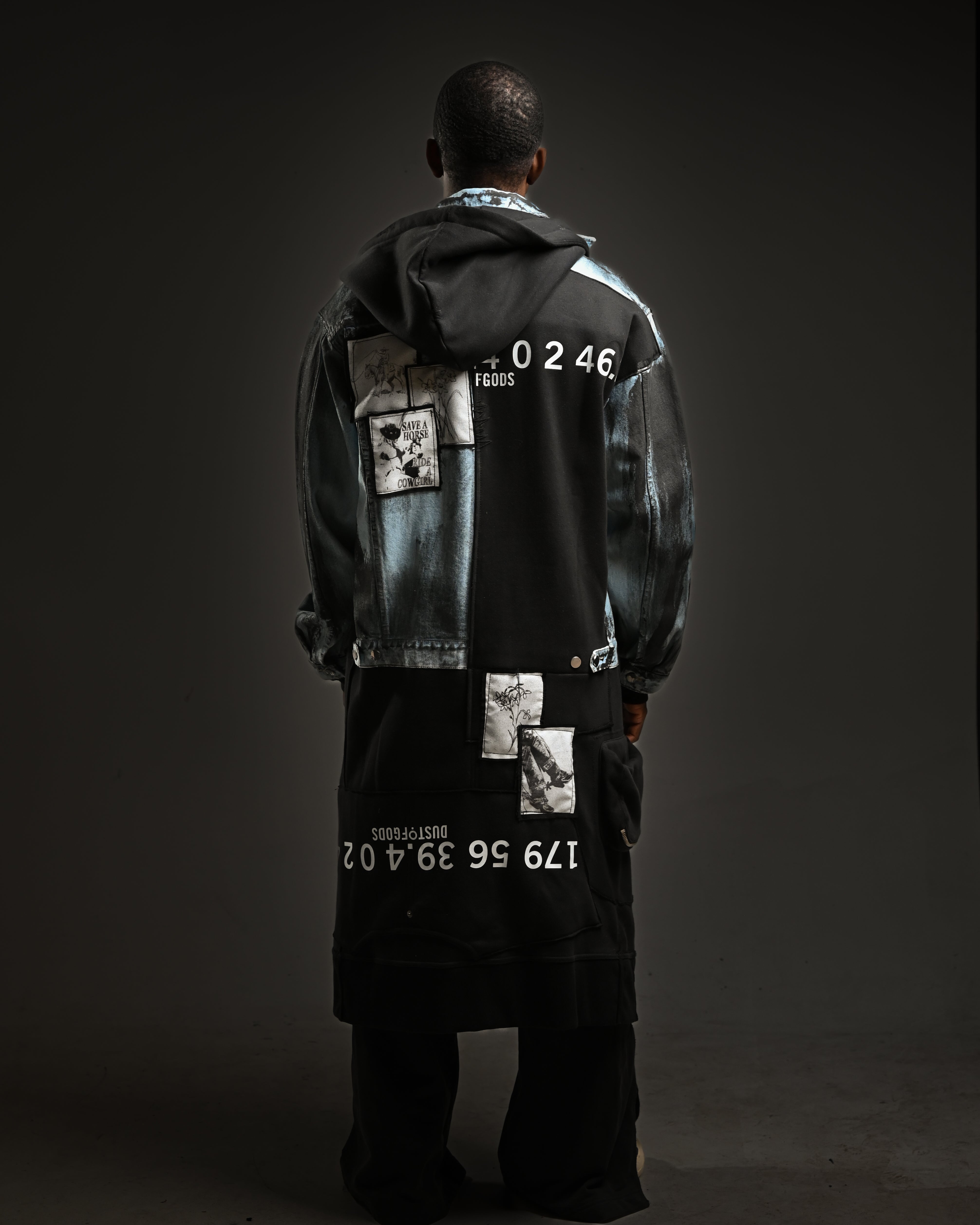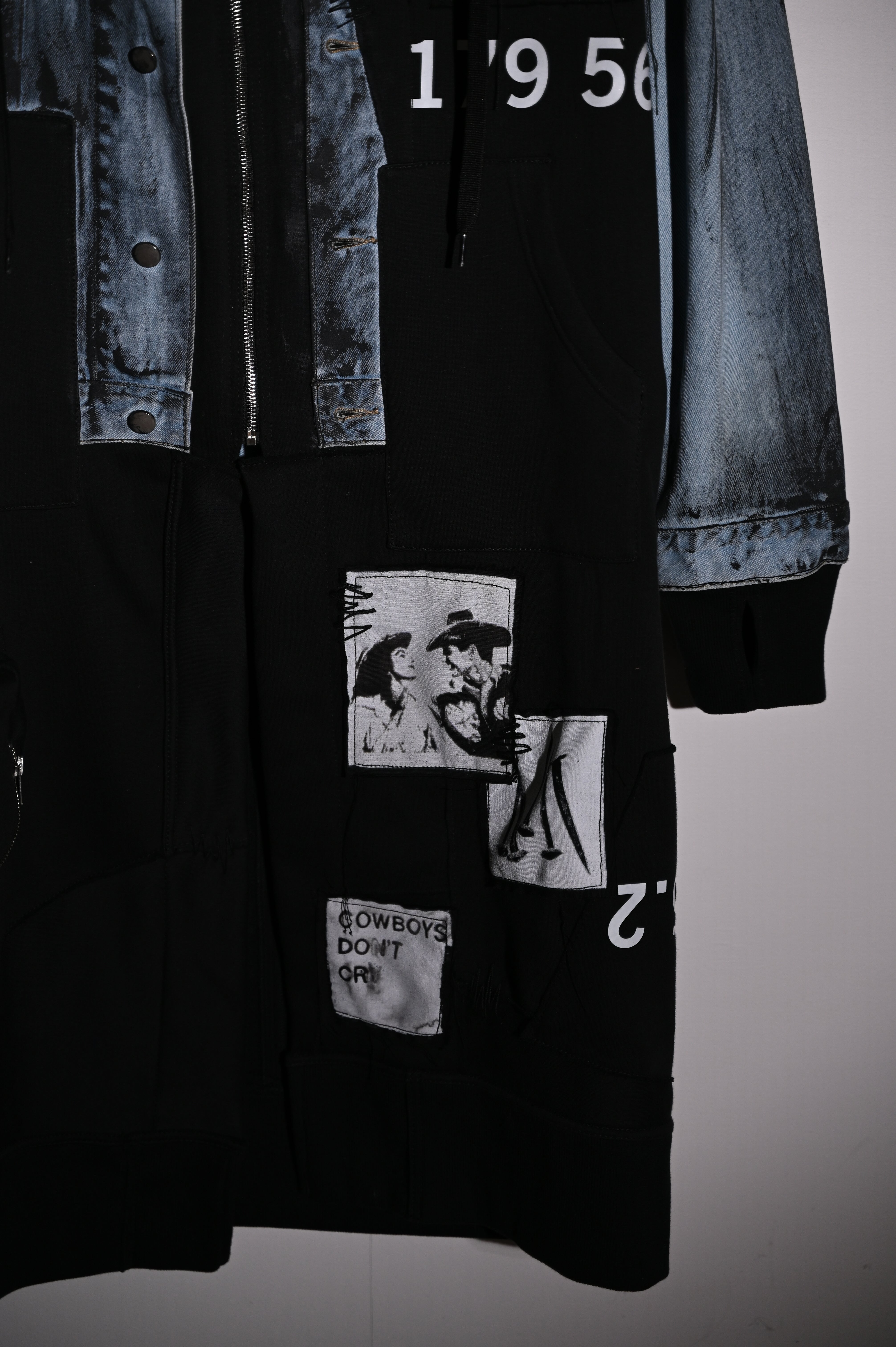 A fusion of denim and jersey into a single extended silhouette. Faded and dry-brushed denim collides with black hoodie fabric, stitched together with patchwork, exposed seams, and raw details. Graphic panels, text prints, and functional hardware turn the piece into a clash of utility and art.