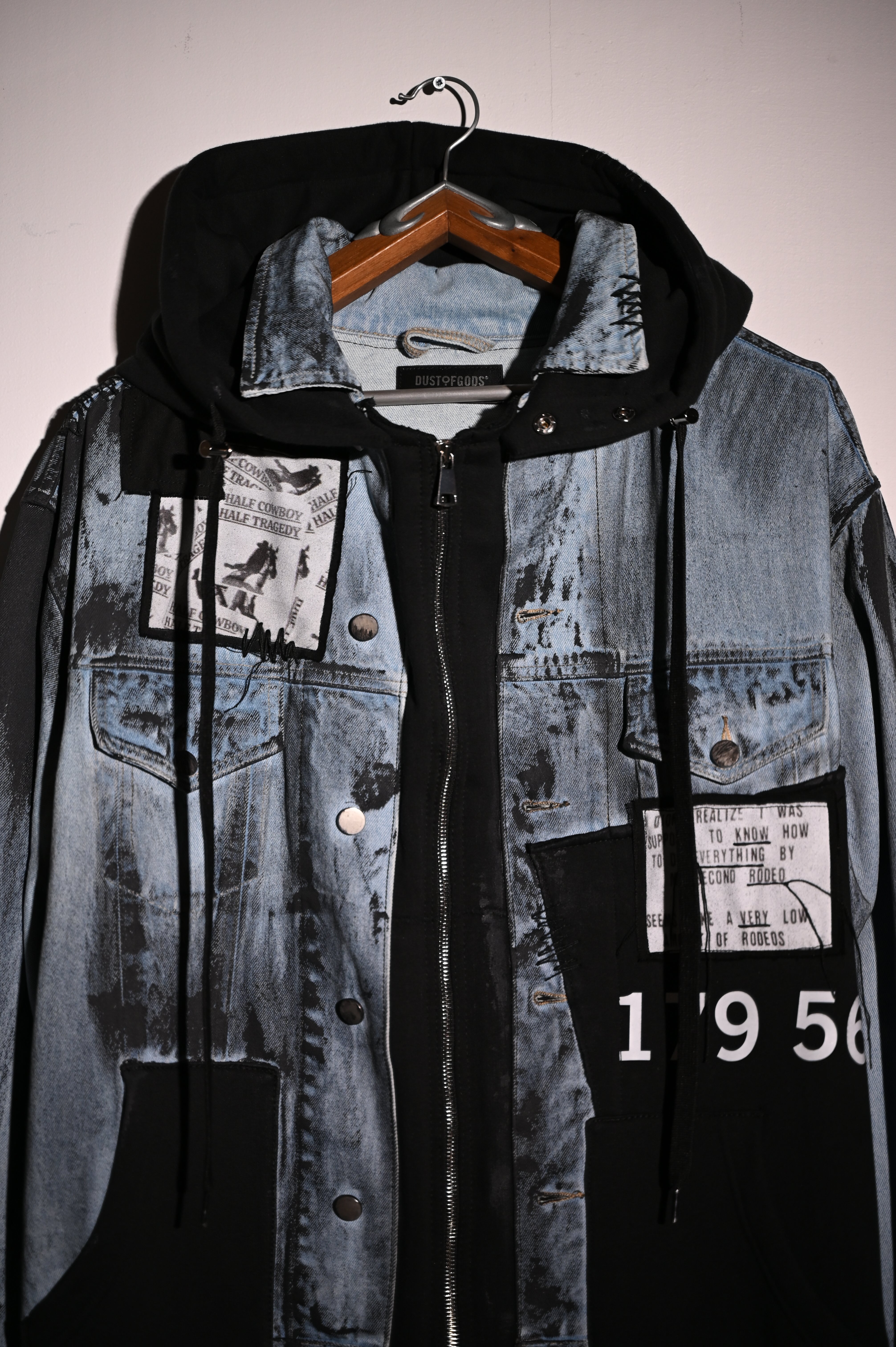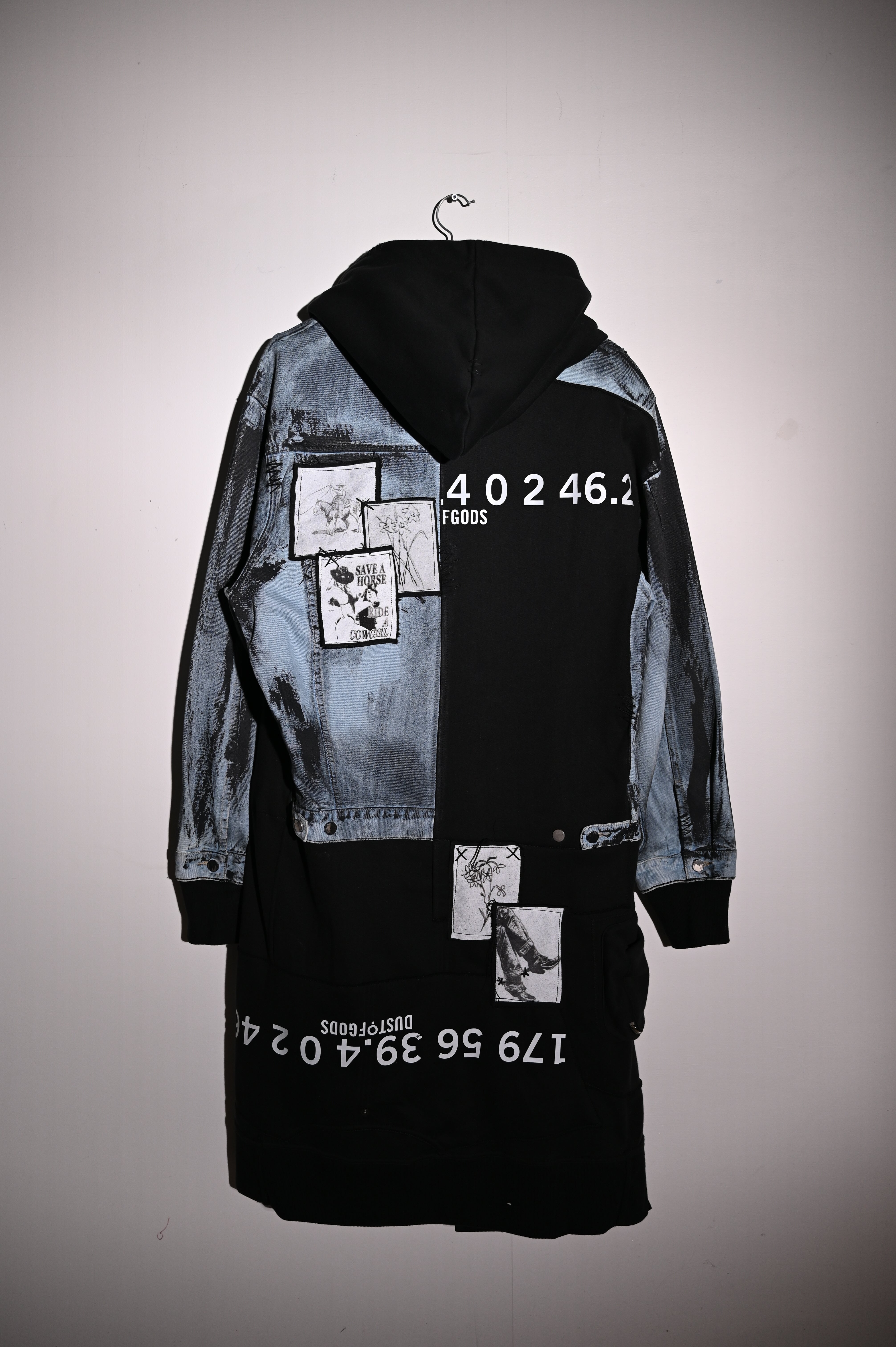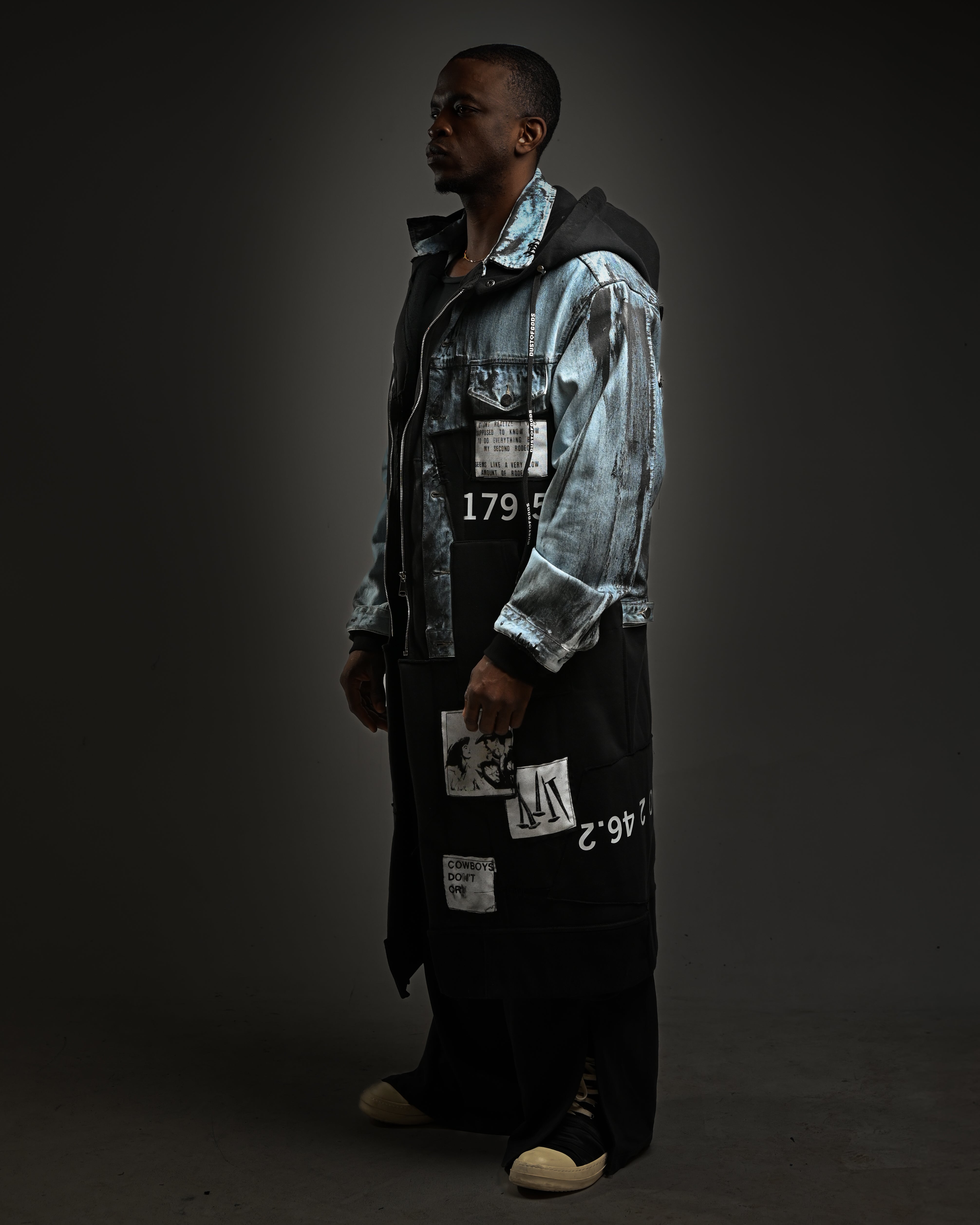 A fusion of denim and jersey into a single extended silhouette. Faded and dry-brushed denim collides with black hoodie fabric, stitched together with patchwork, exposed seams, and raw details. Graphic panels, text prints, and functional hardware turn the piece into a clash of utility and art.