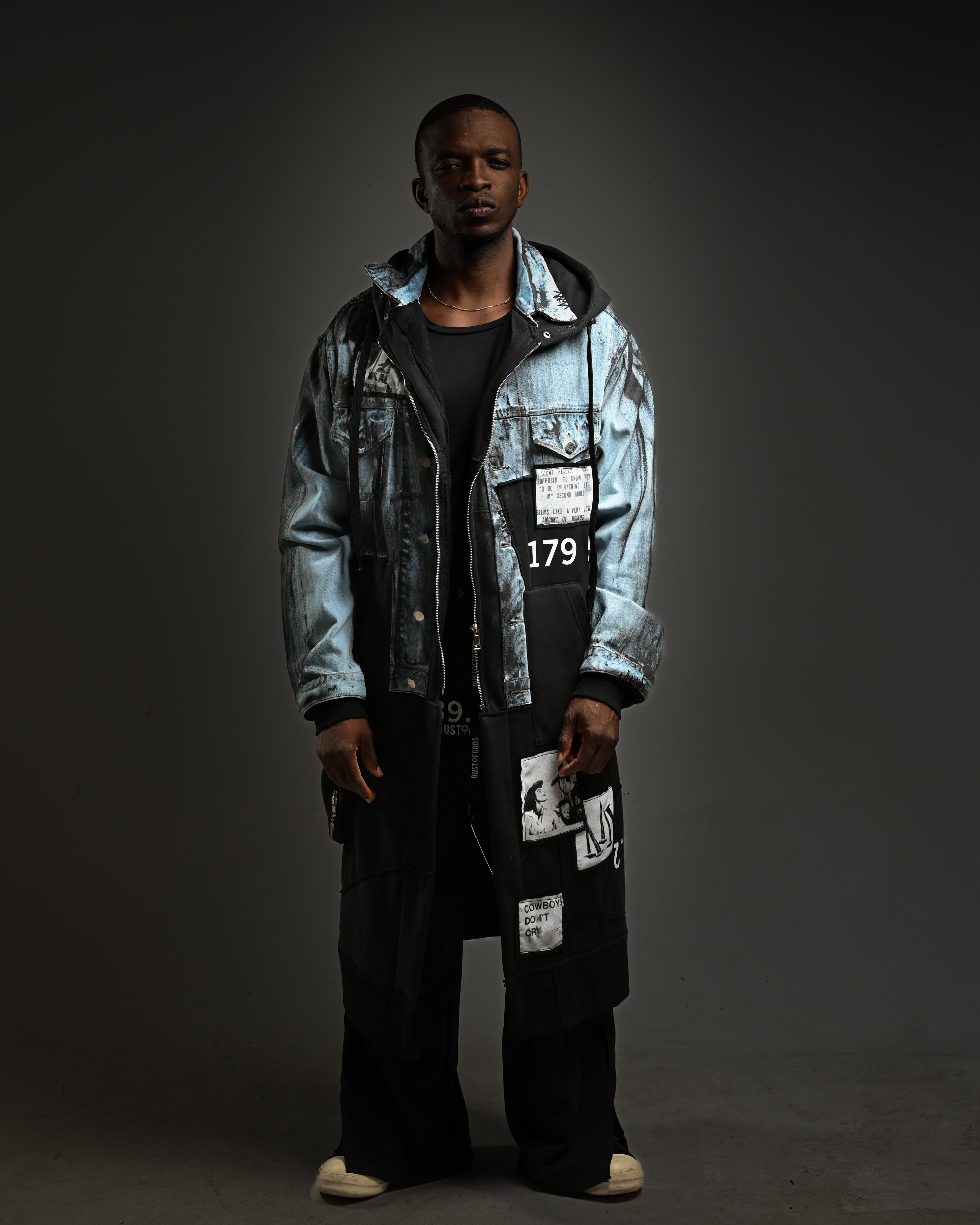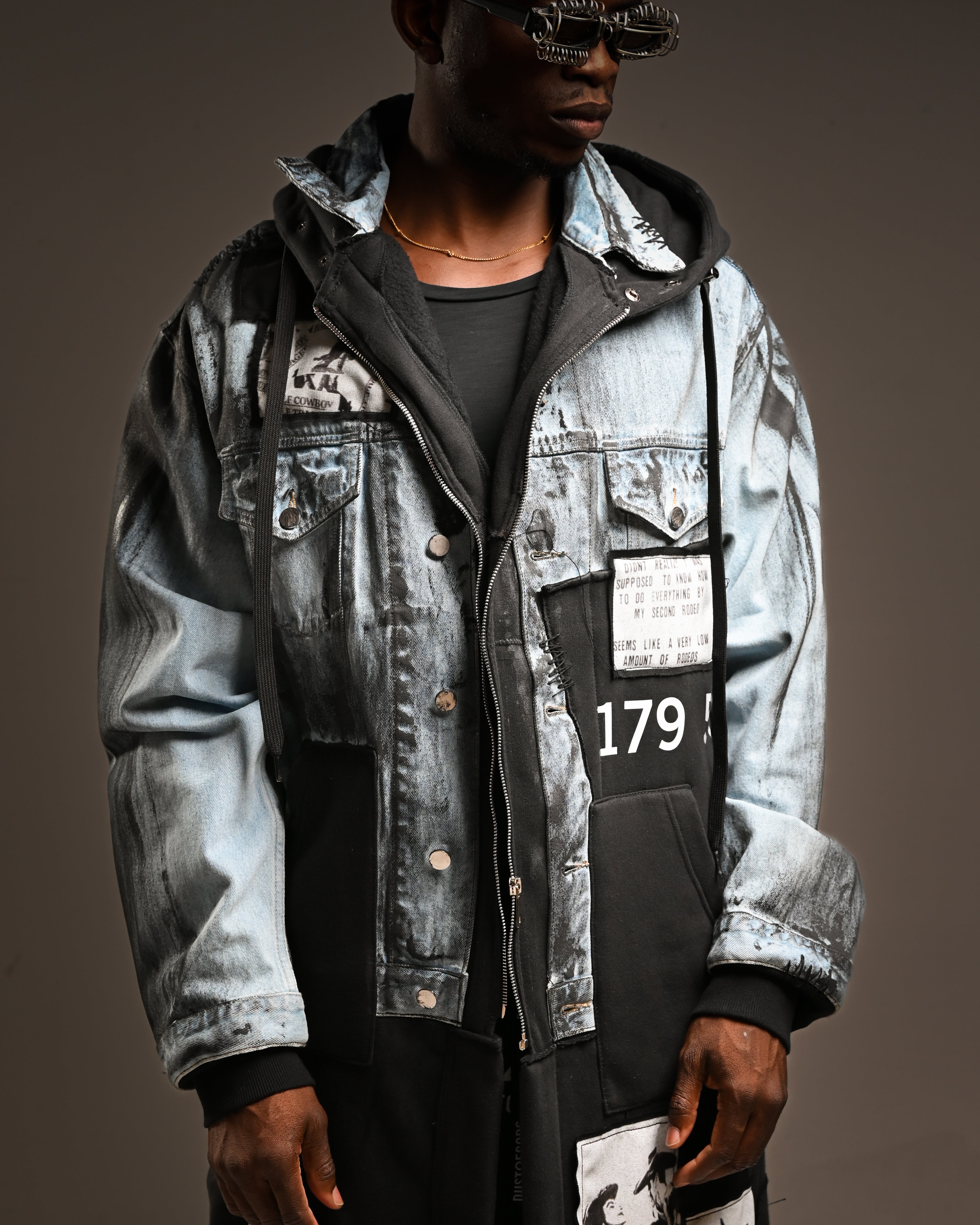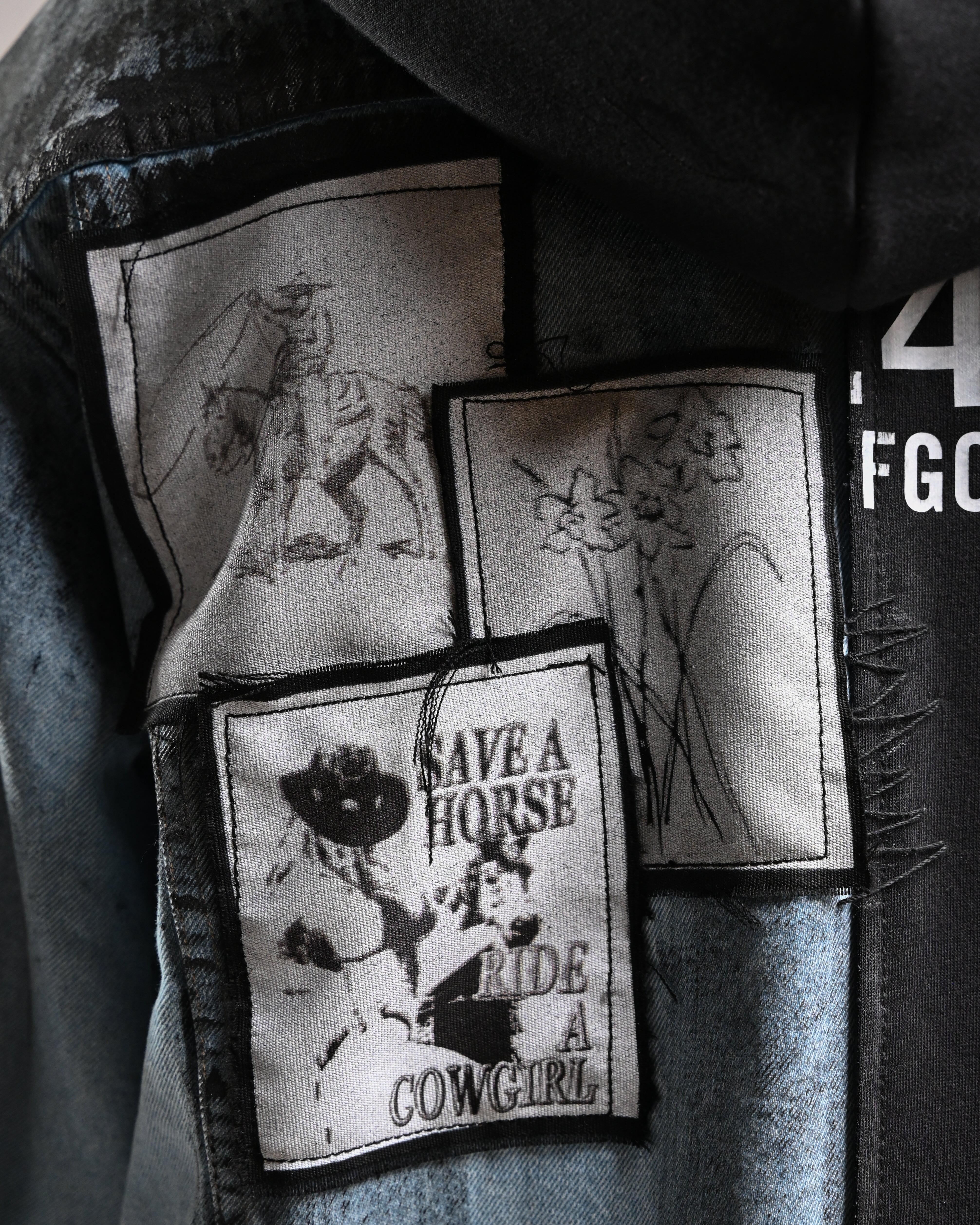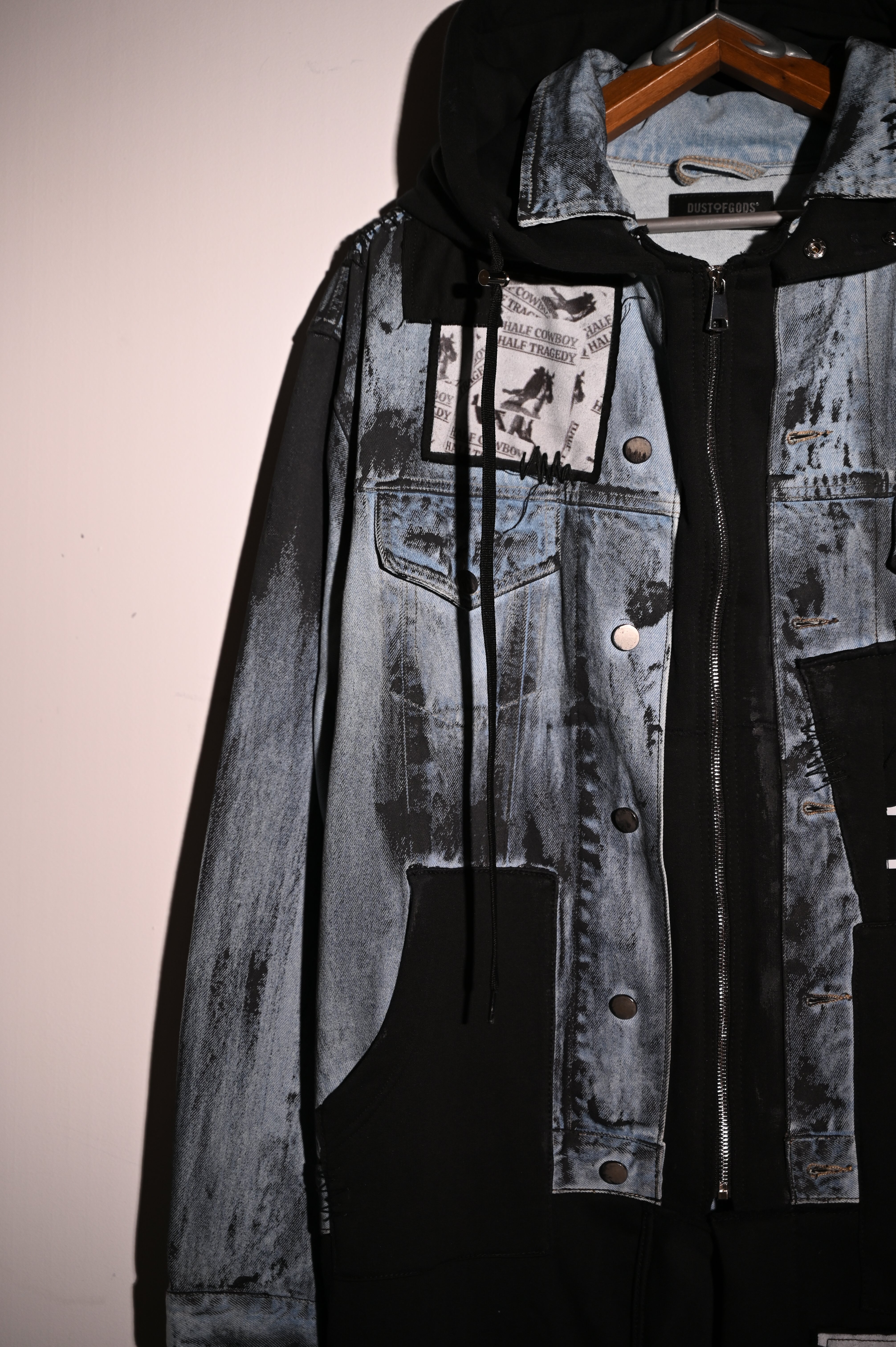 A fusion of denim and jersey into a single extended silhouette. Faded and dry-brushed denim collides with black hoodie fabric, stitched together with patchwork, exposed seams, and raw details. Graphic panels, text prints, and functional hardware turn the piece into a clash of utility and art.