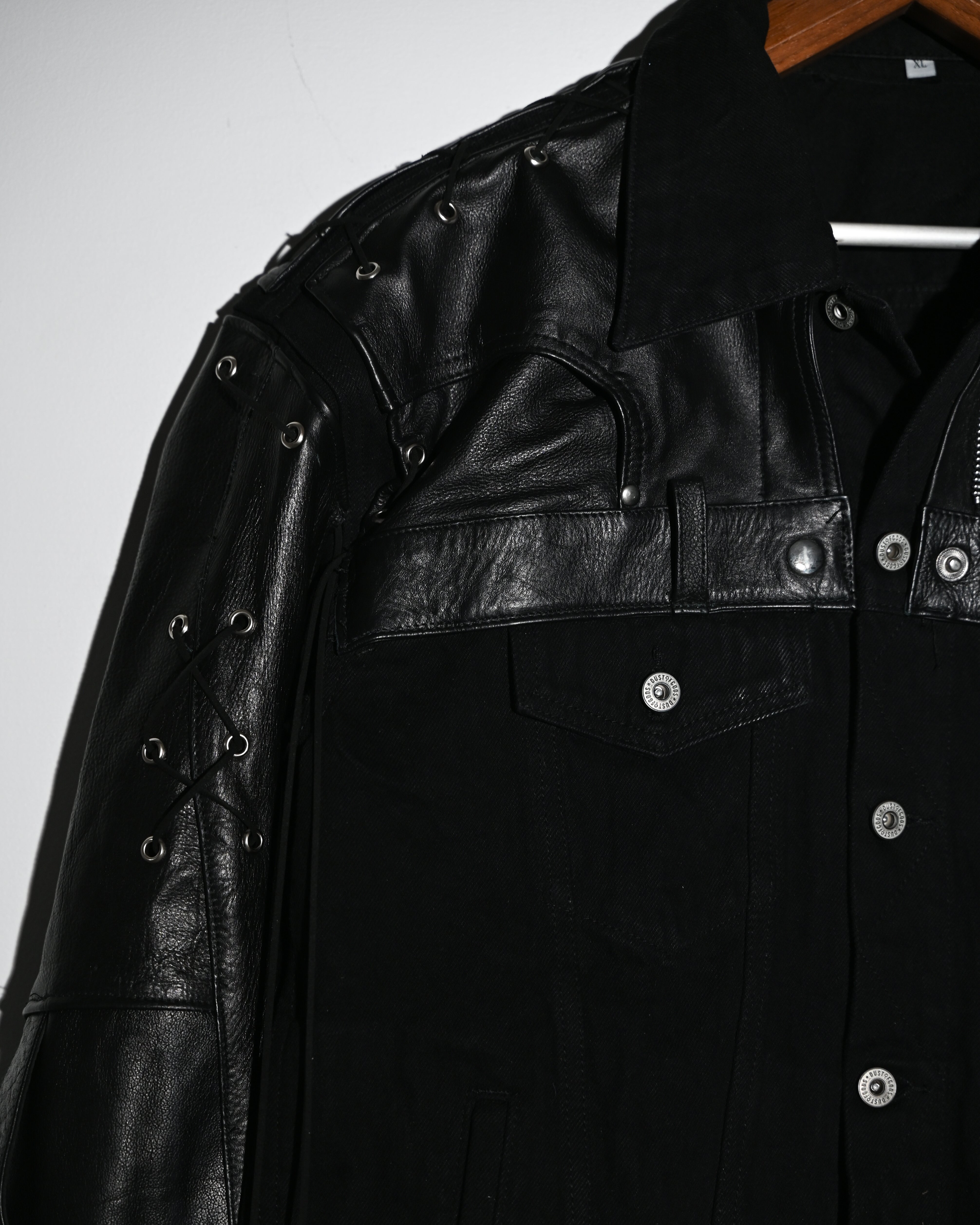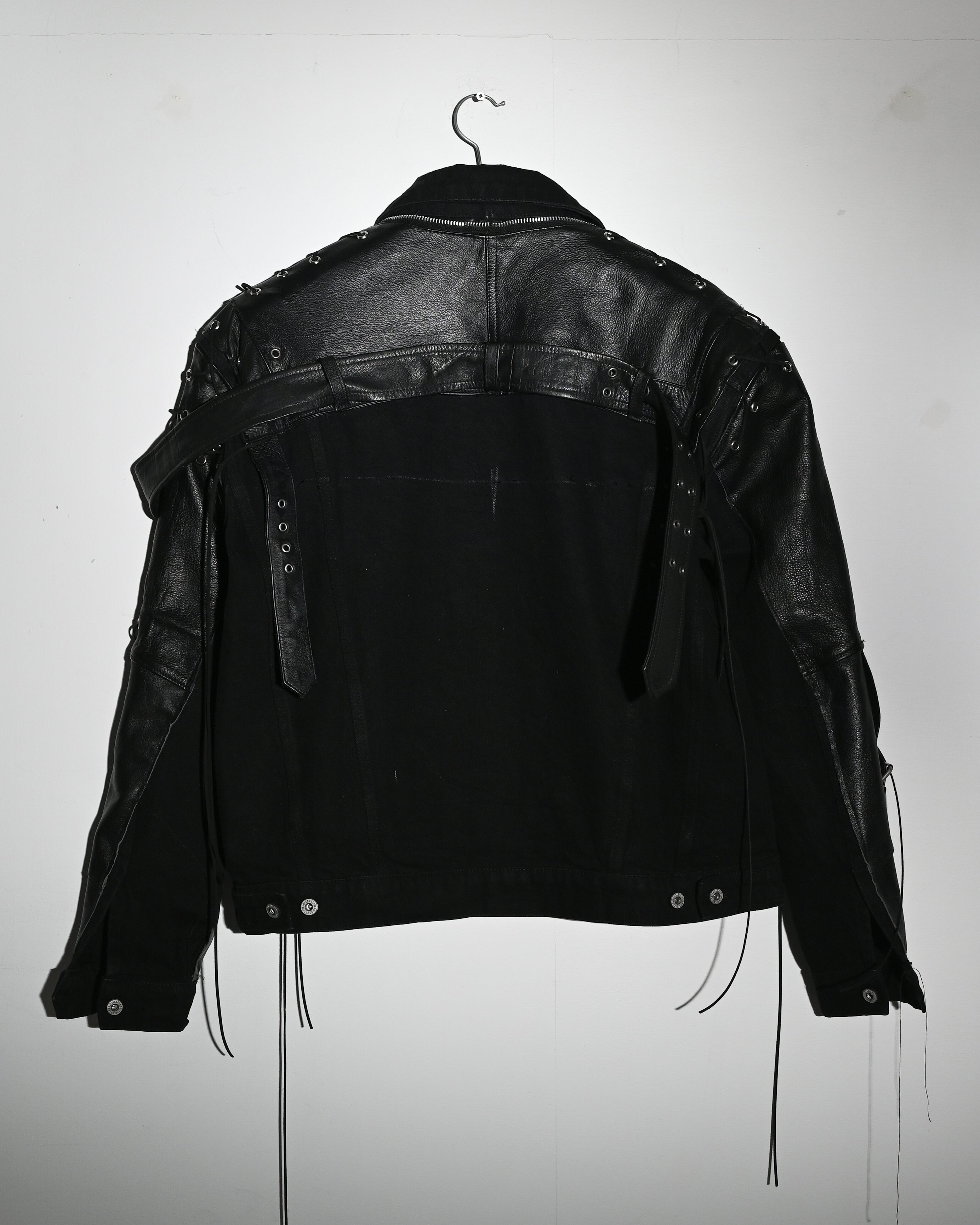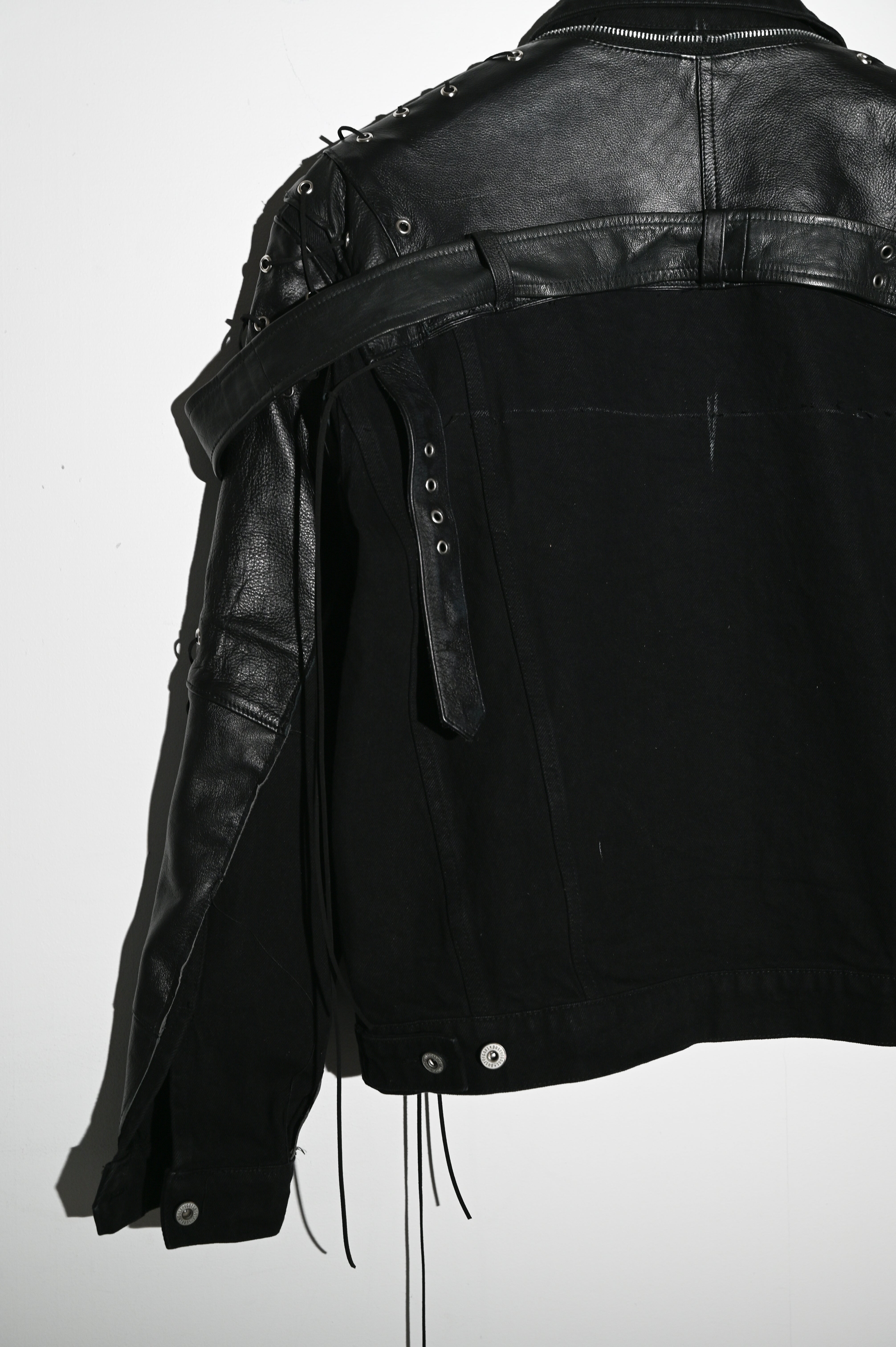 1 of 1. Deconstructed Leather Pants repurposed and rebuilt into shoulder and sleeve panels of the denim Jacket. Metal grommets with leather lacing.