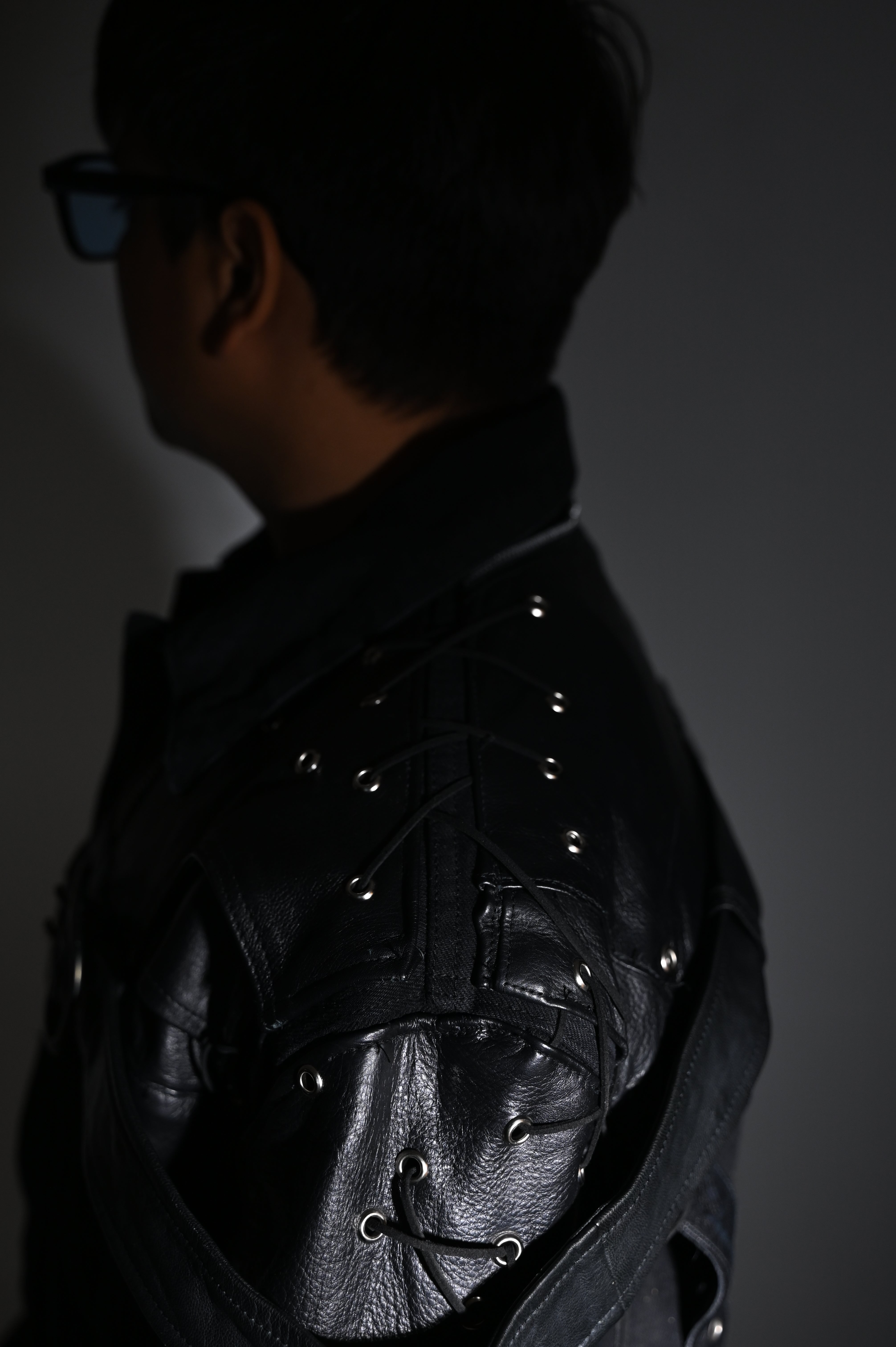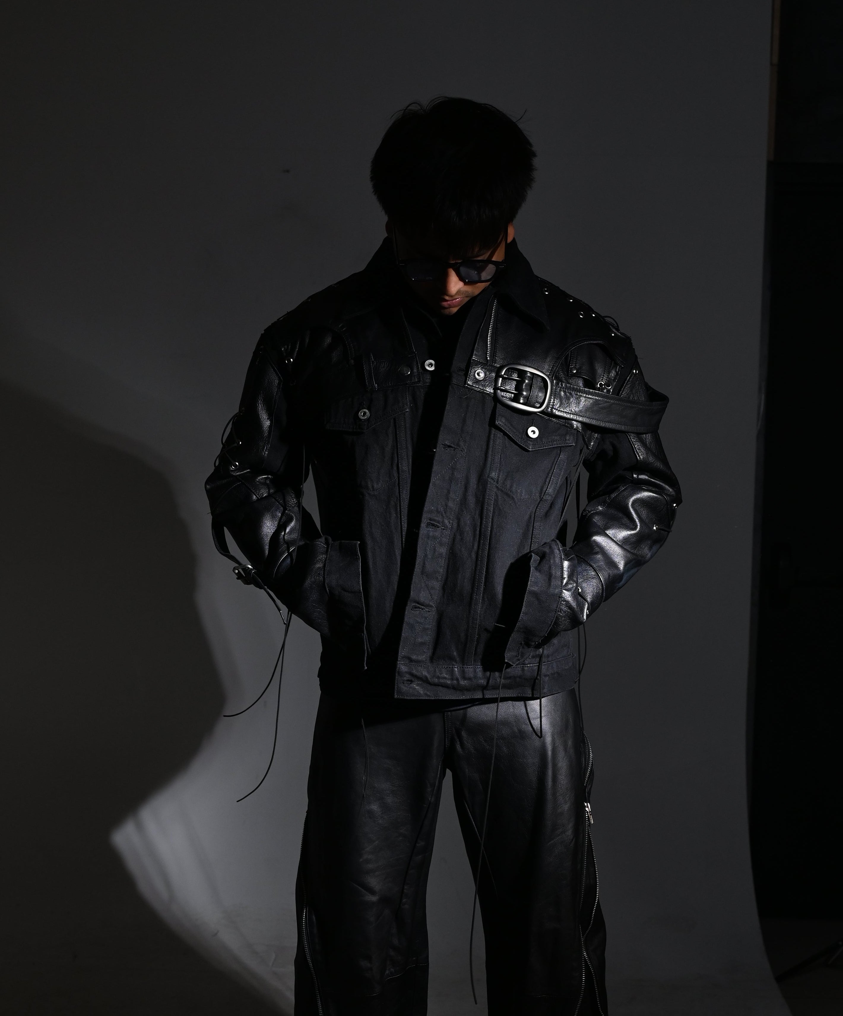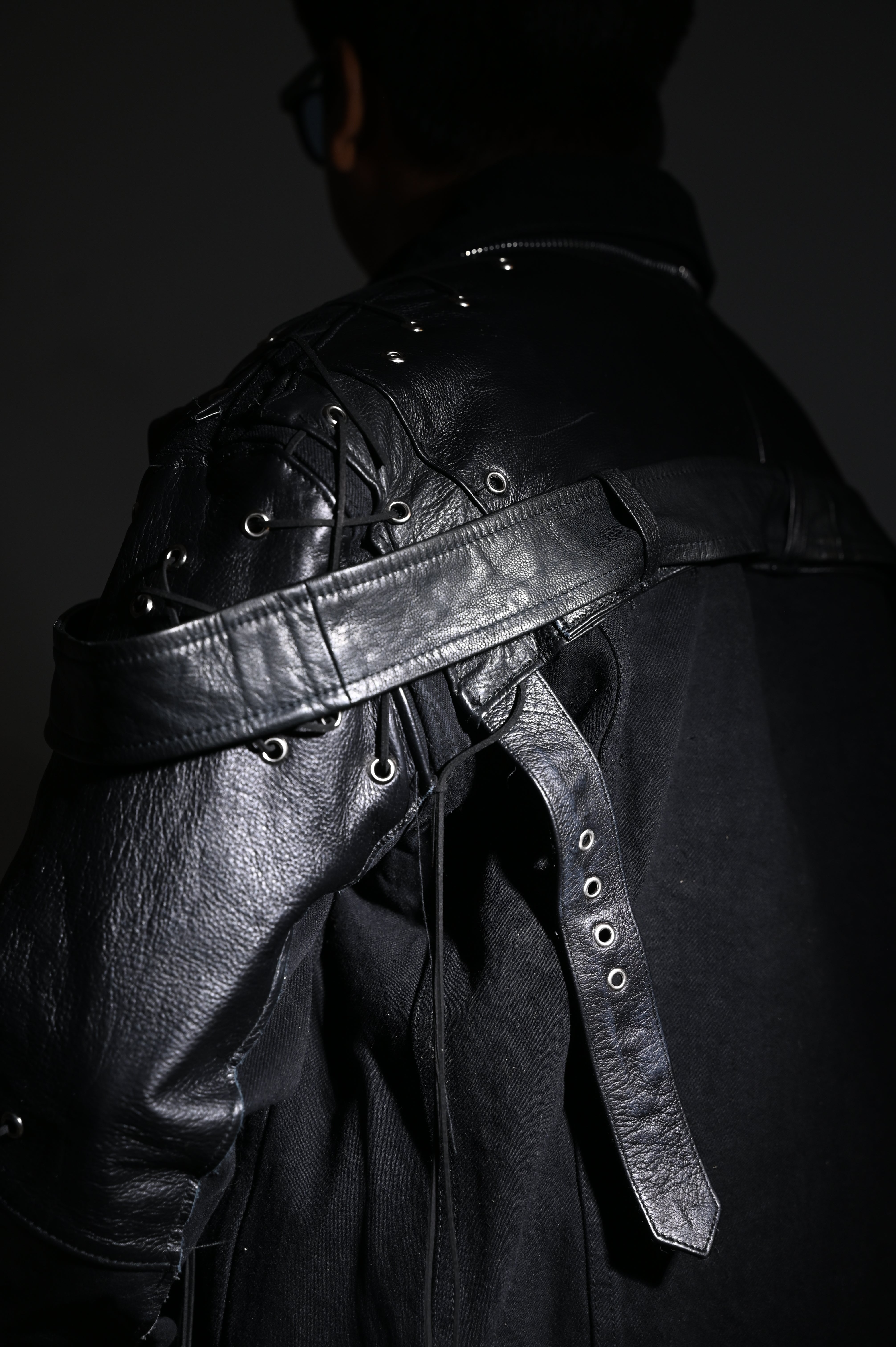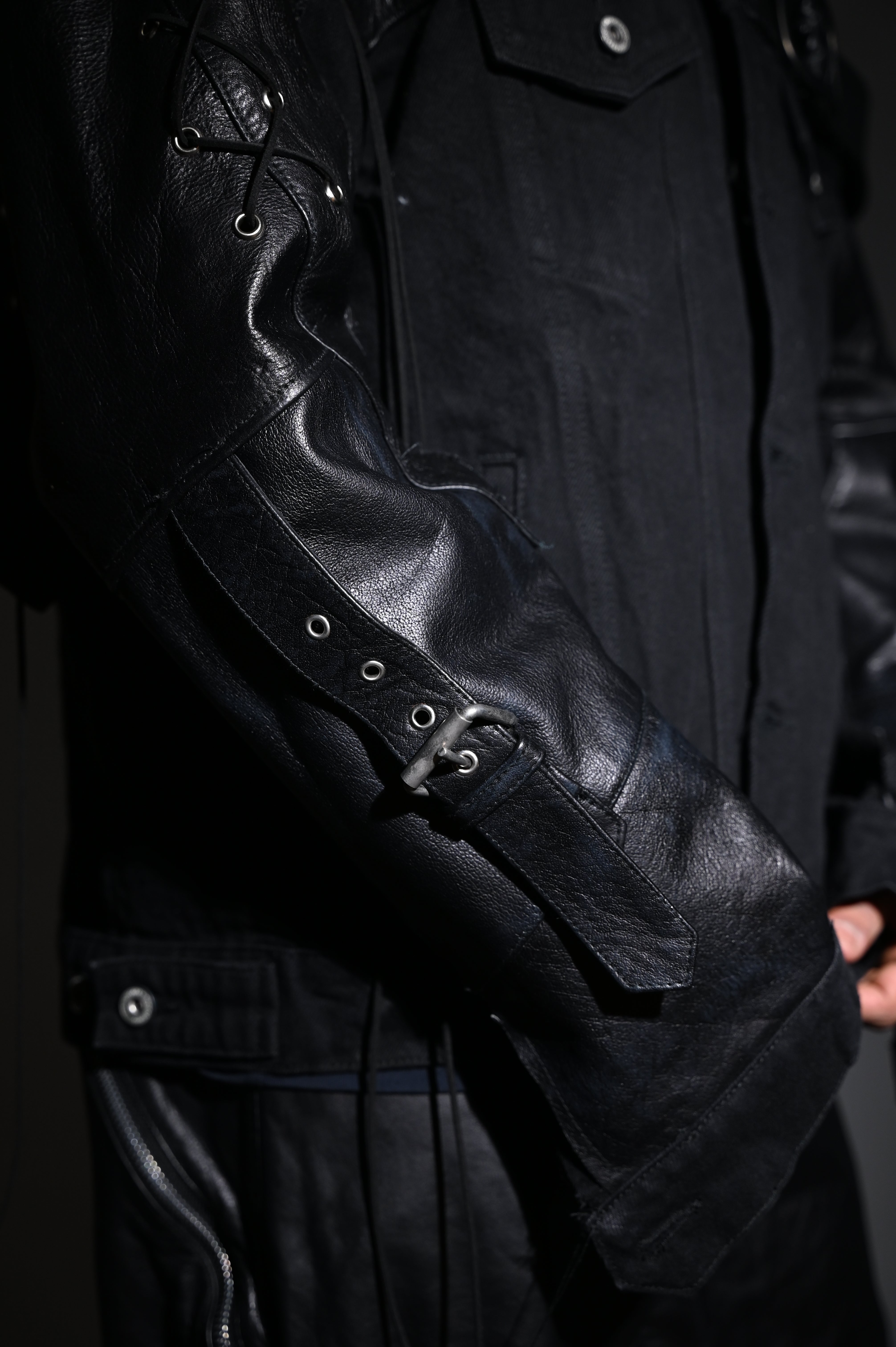 1 of 1. Deconstructed Leather Pants repurposed and rebuilt into shoulder and sleeve panels of the denim Jacket. Metal grommets with leather lacing.
