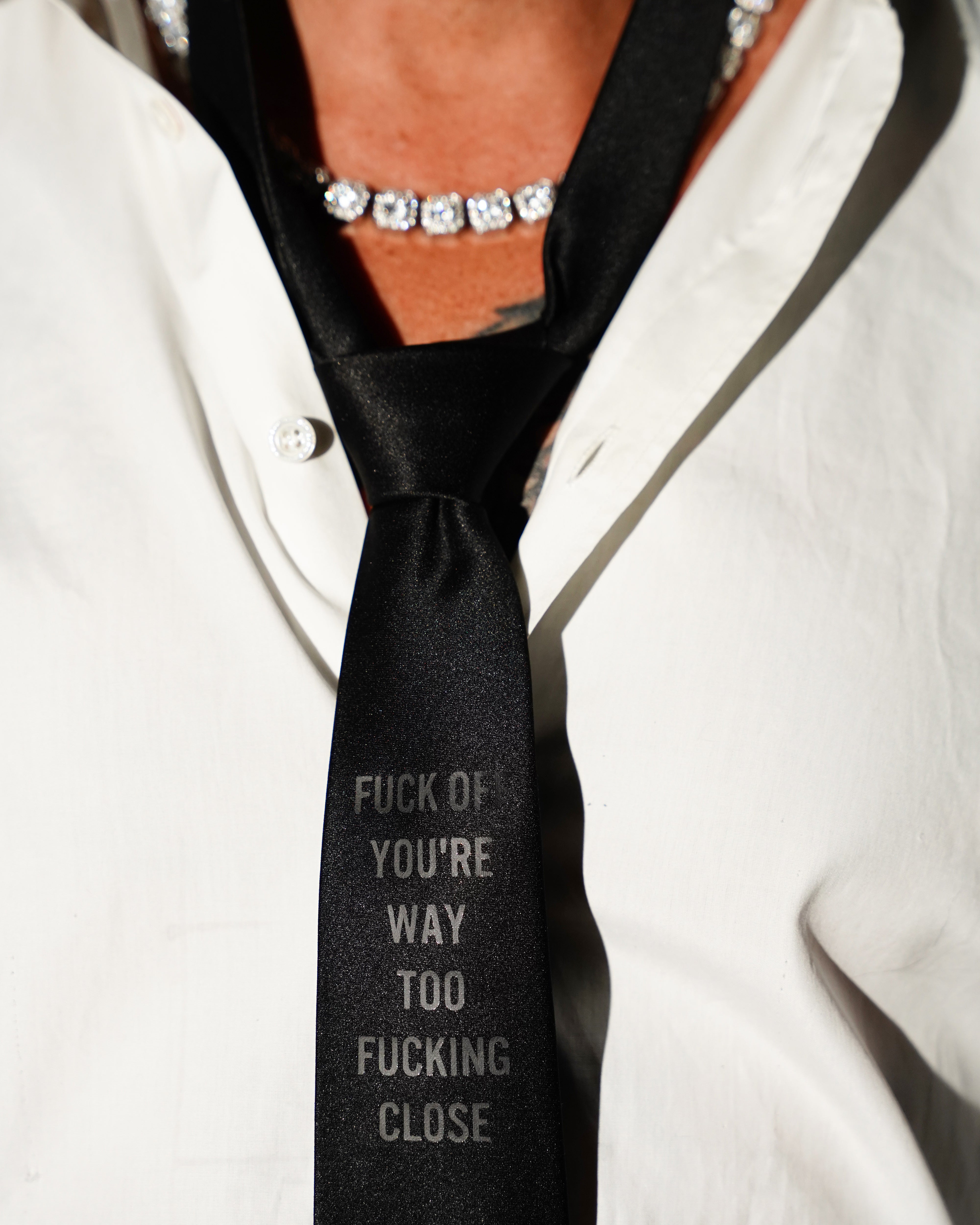 This tie isn't meant to be for everyone. "Fuck Off You're Way Too Close" Embellishment. 8cm width.
